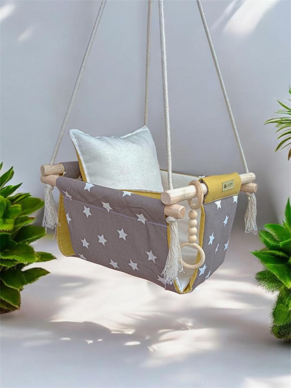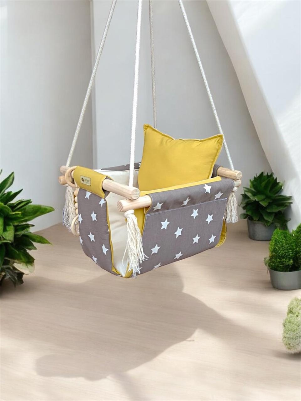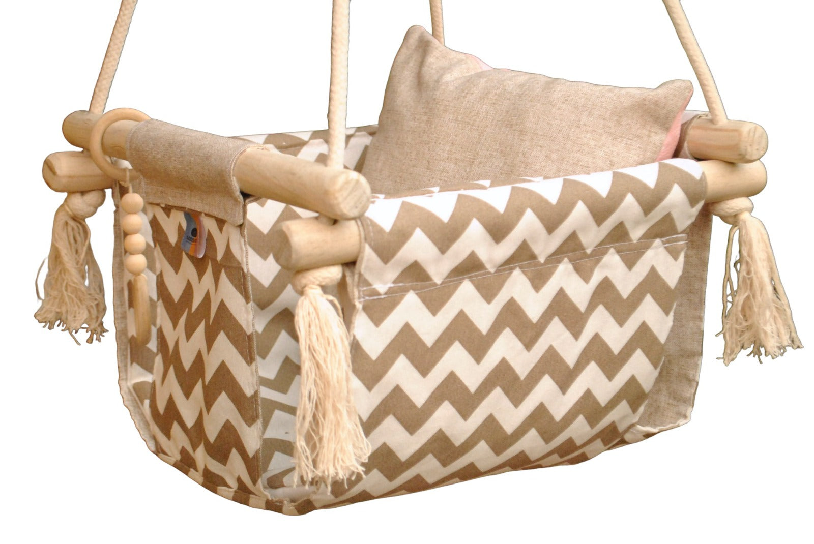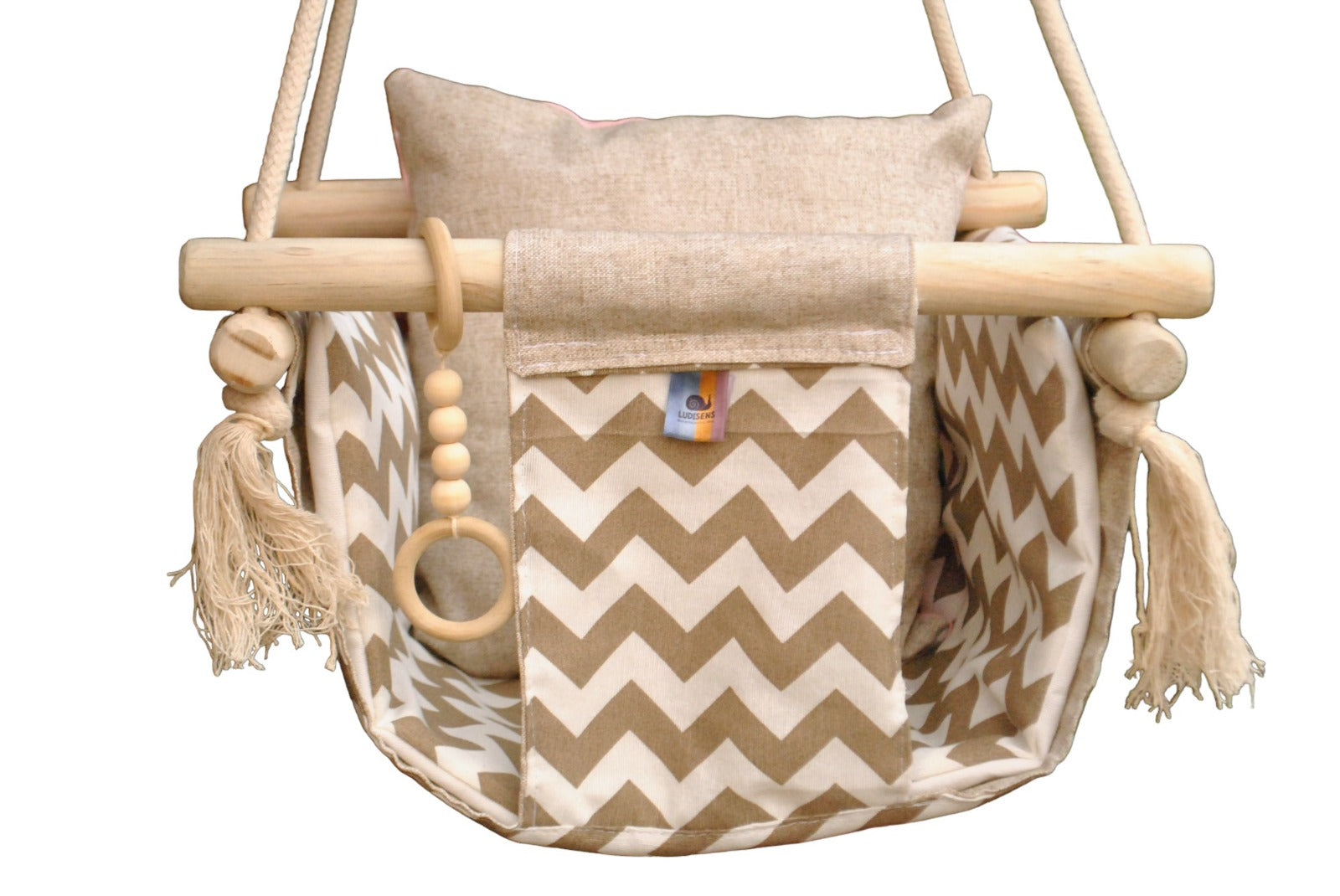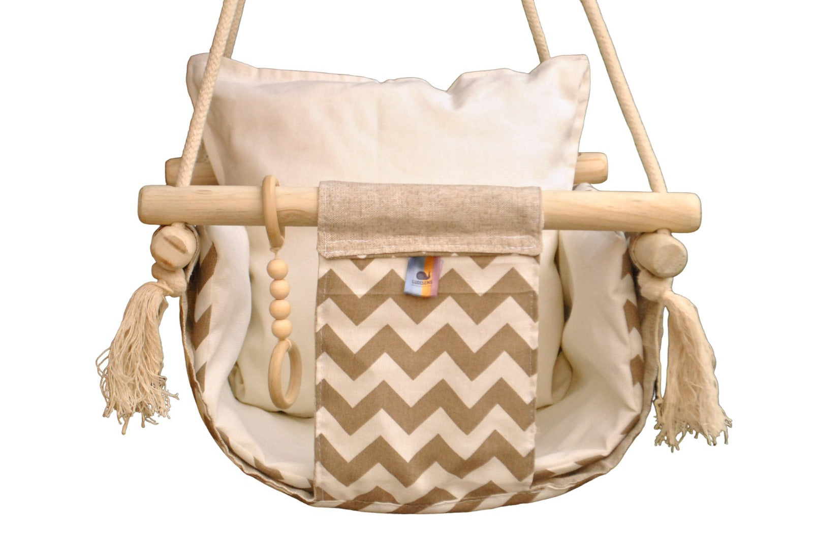 Incluye: Asiento de tela con costuras reforzadas, colcha reversible y desmontable para facilitar el lavado, cojín doble cara de uso en apoyo trasero, cuerda de algodón trenzado 7 metros total, ajustable y mosquetón de acople. Consideraciones: Las medidas son aproximadas y la coloración varía según la resolución de cada pantalla. Tener en cuenta que son trabajos hechos a mano, y el patrón del diseño de la tela puede variar levemente.