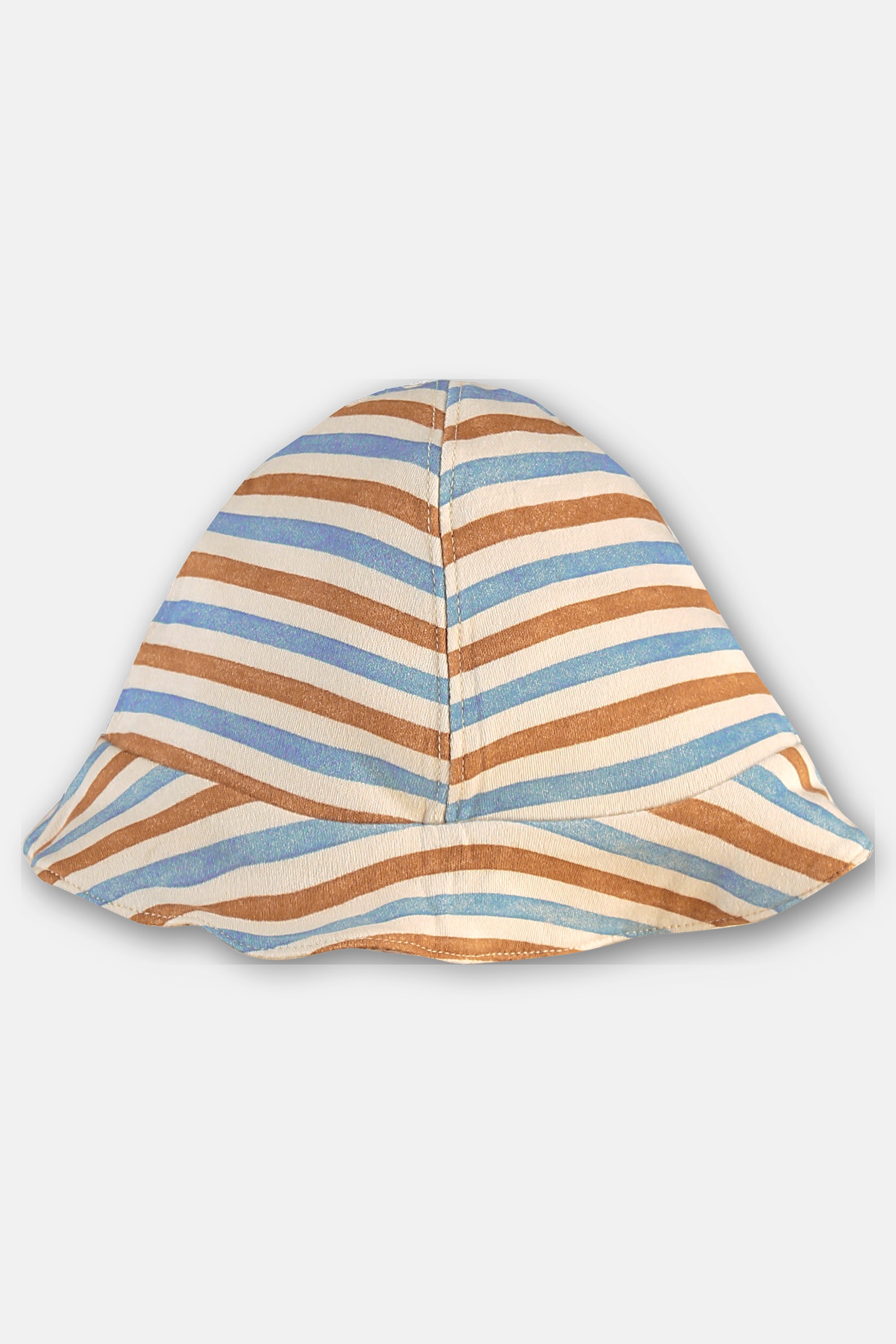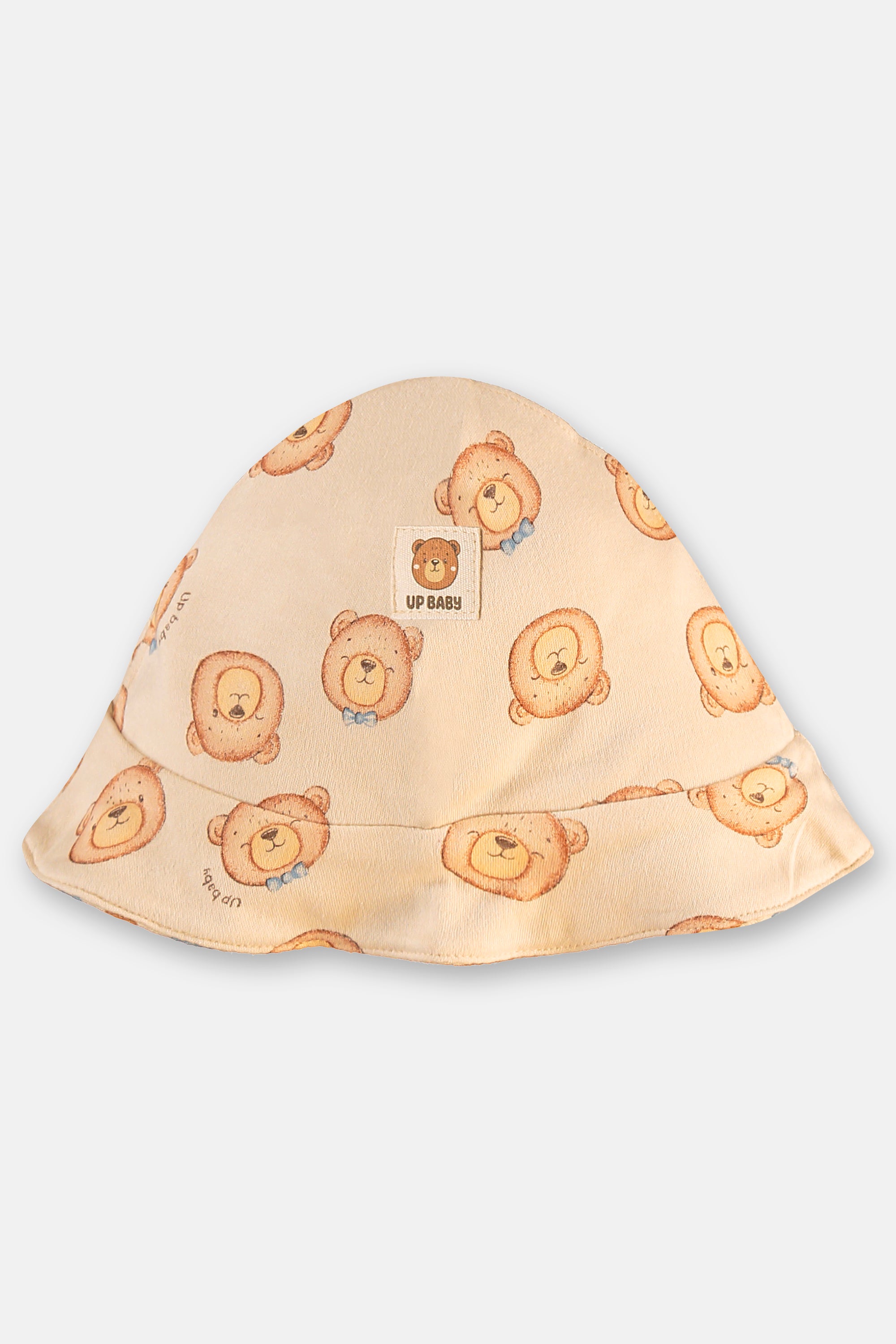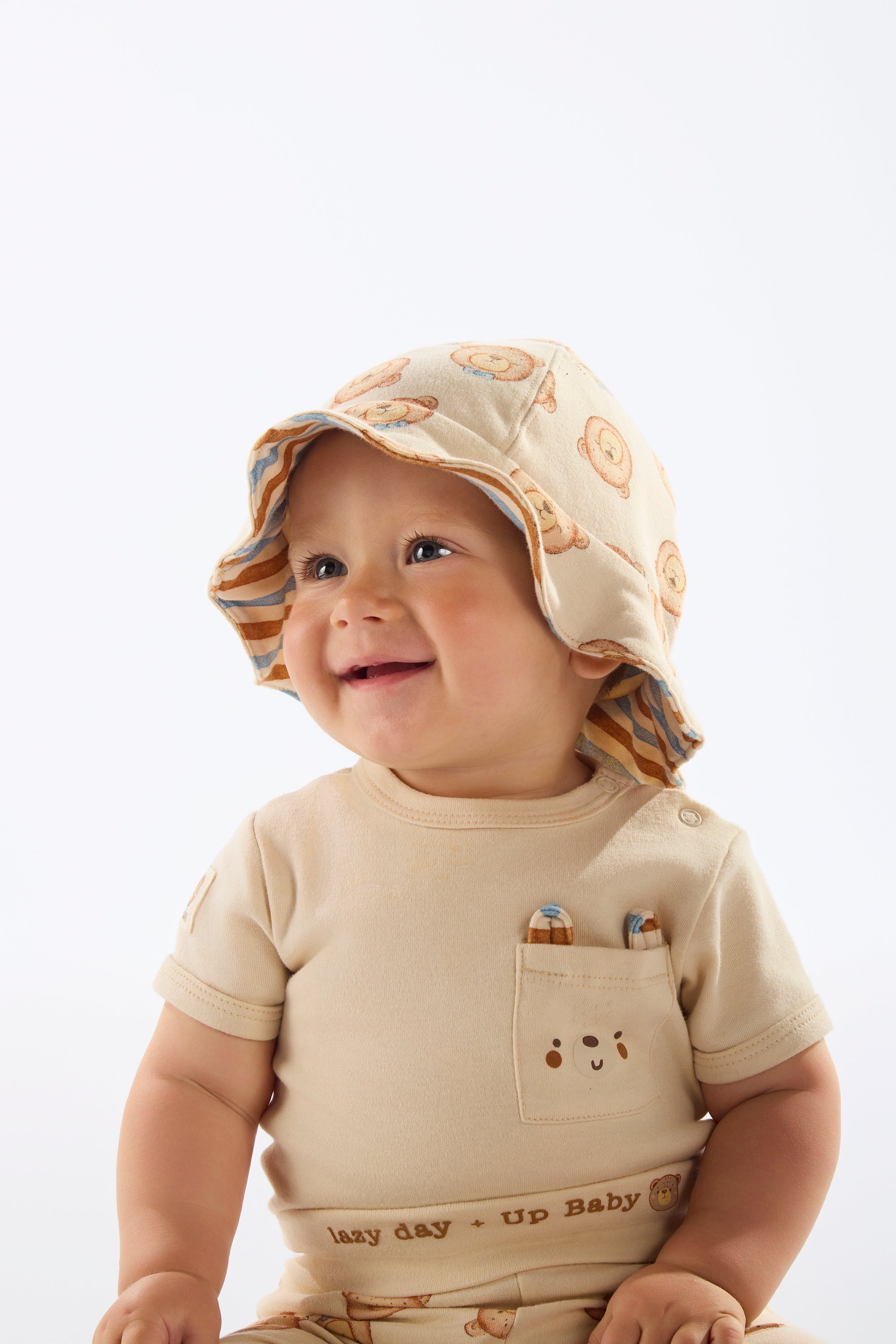 Sombrero reversible para bebé confeccionado en 100% algodón brasileño, suave y respirable. Un lado presenta un tierno estampado de ositos y el otro un diseño a rayas en tonos tierra y azul, perfecto para complementar distintos looks.