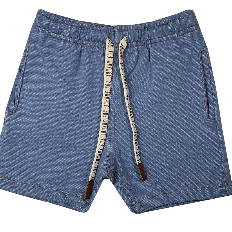 Short de niño Johnny Fox en tono azul medio, confeccionado en tela de algodón brasileña de alta calidad. Diseño cómodo y moderno con pretina elasticada y cordón ajustable con detalles de marca. Ideal para días activos y cálidos, combinando estilo urbano con máxima libertad de movimiento. Un básico versátil para looks relajados de verano.