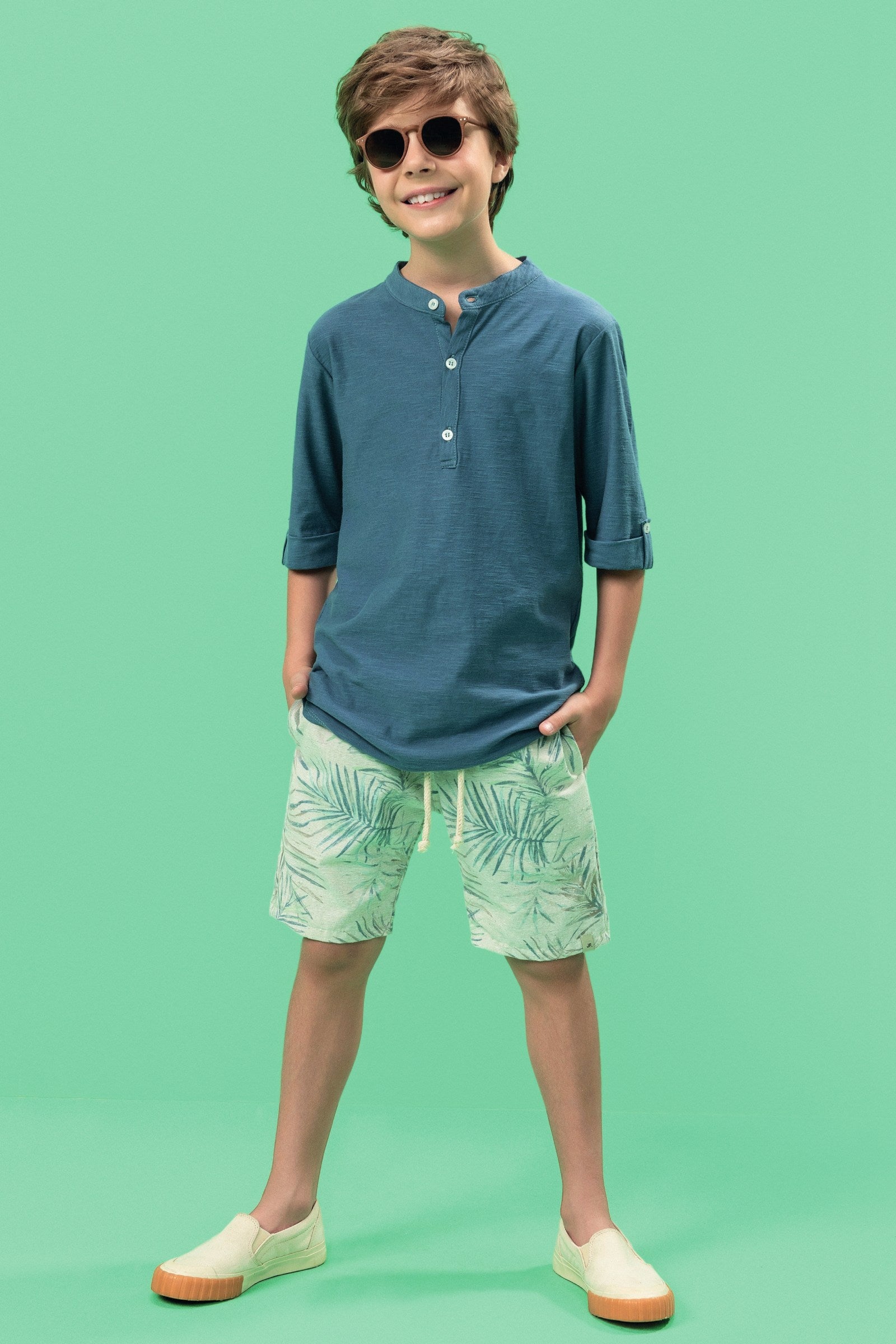 Short infantil confeccionado en algodón brasileño de alta calidad, con un suave fondo crudo y estampado de hojas tropicales en tonos pastel. Su diseño cómodo y fresco lo hace ideal para los días de verano. Cintura elasticada con cordón ajustable para mayor calce y libertad de movimiento. Perfecto para combinar con poleras básicas o camisas livianas. Resistente, cómodo y con un diseño que no pasa de moda.