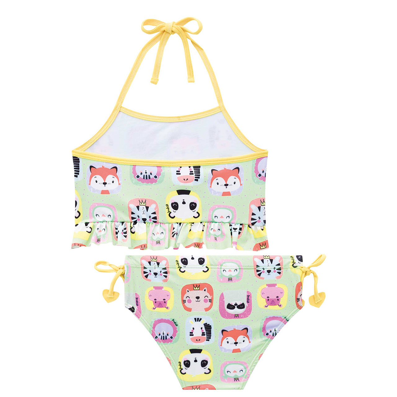 Bikini infantil con diseño de animalitos y filtro UV50, ideal para proteger la piel de las niñas del sol en días de playa o piscina. Incluye un top con volantes y tirantes ajustables y una parte inferior con detalles de lazos y corazones. Confección brasileña de alta calidad, cómoda y duradera. ¡Perfecto para un verano lleno de diversión!