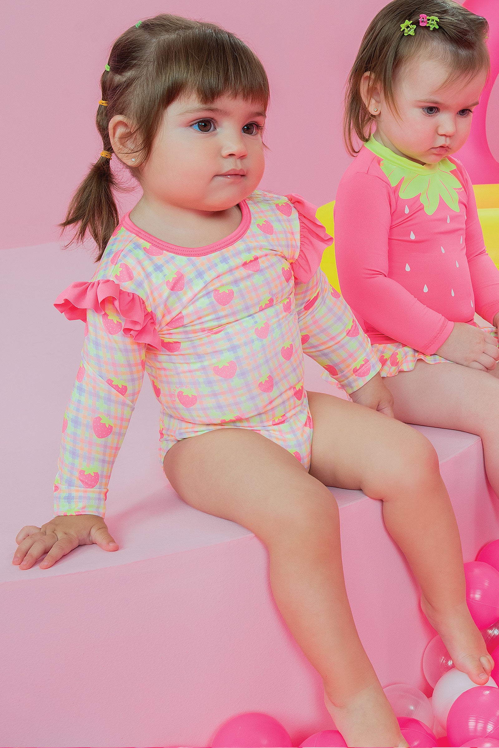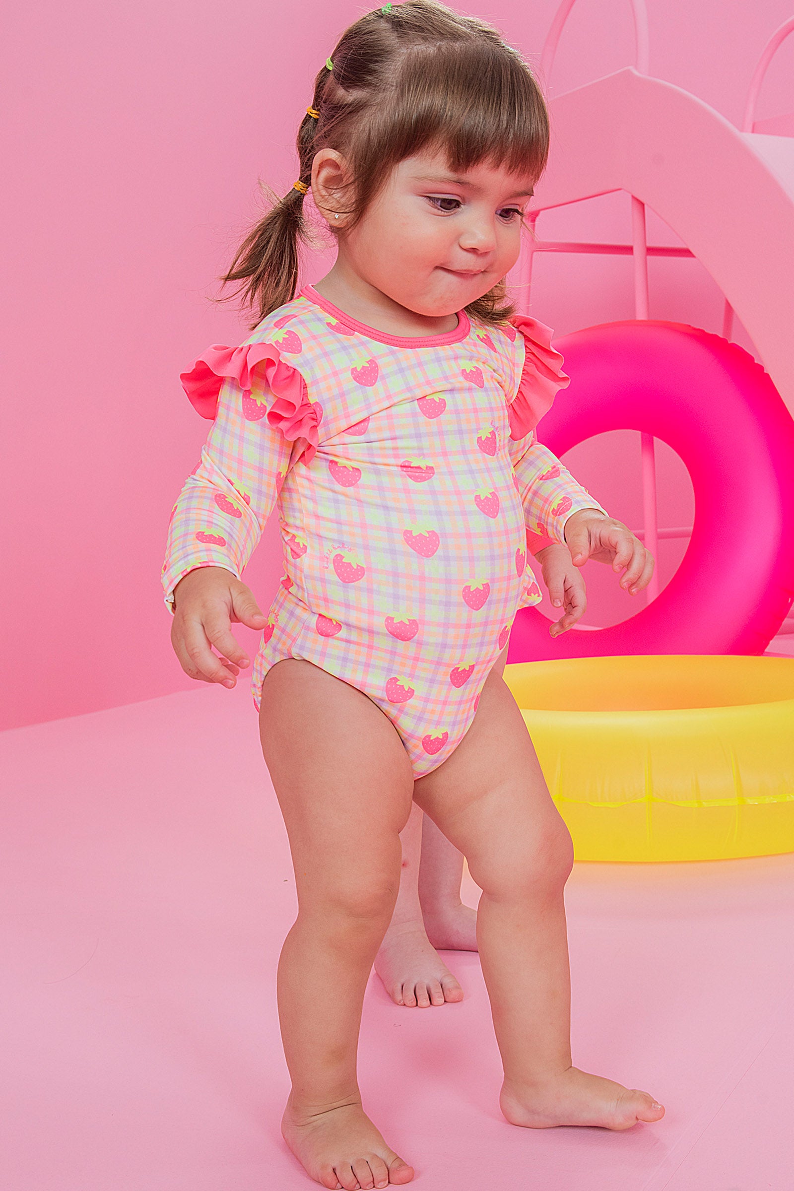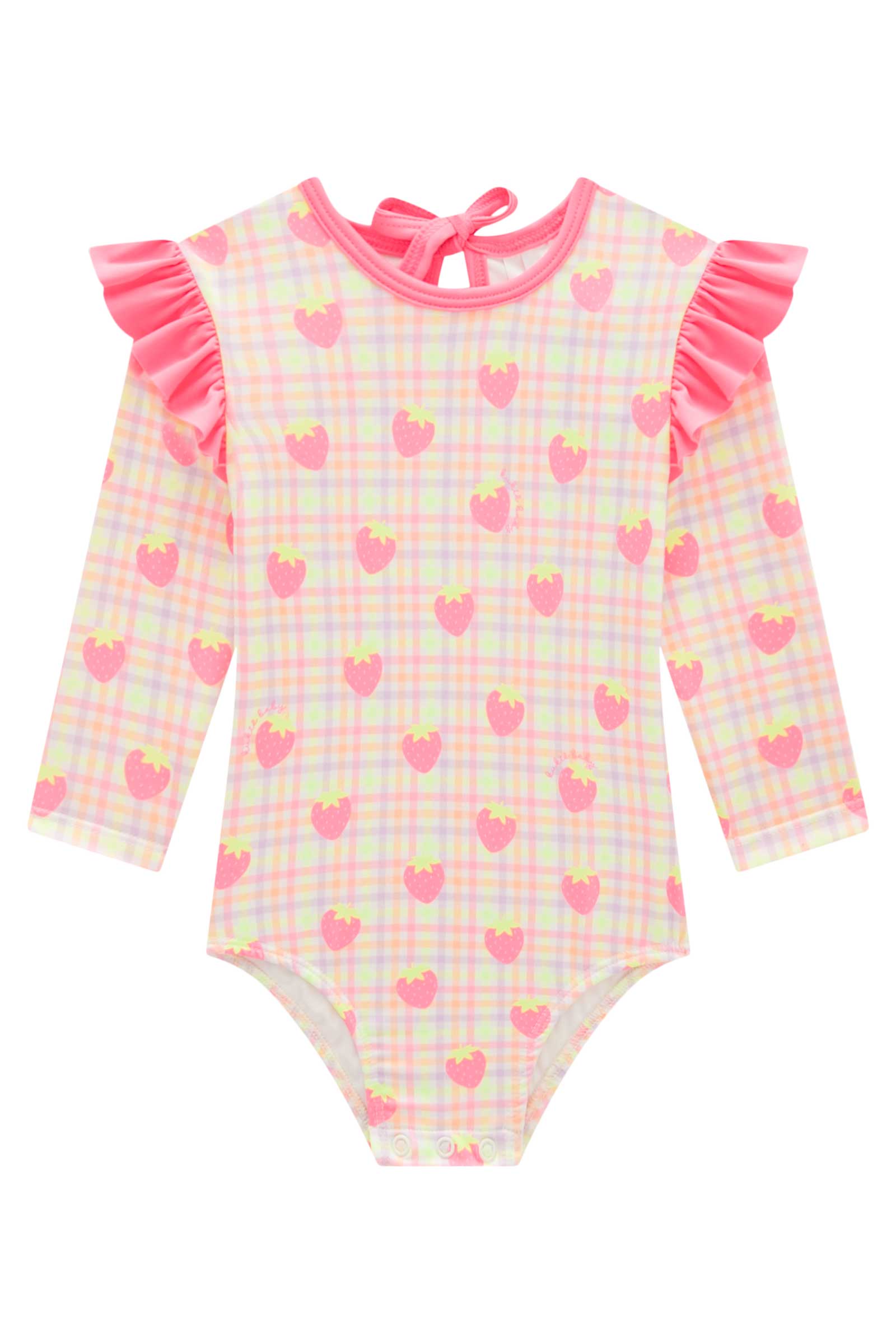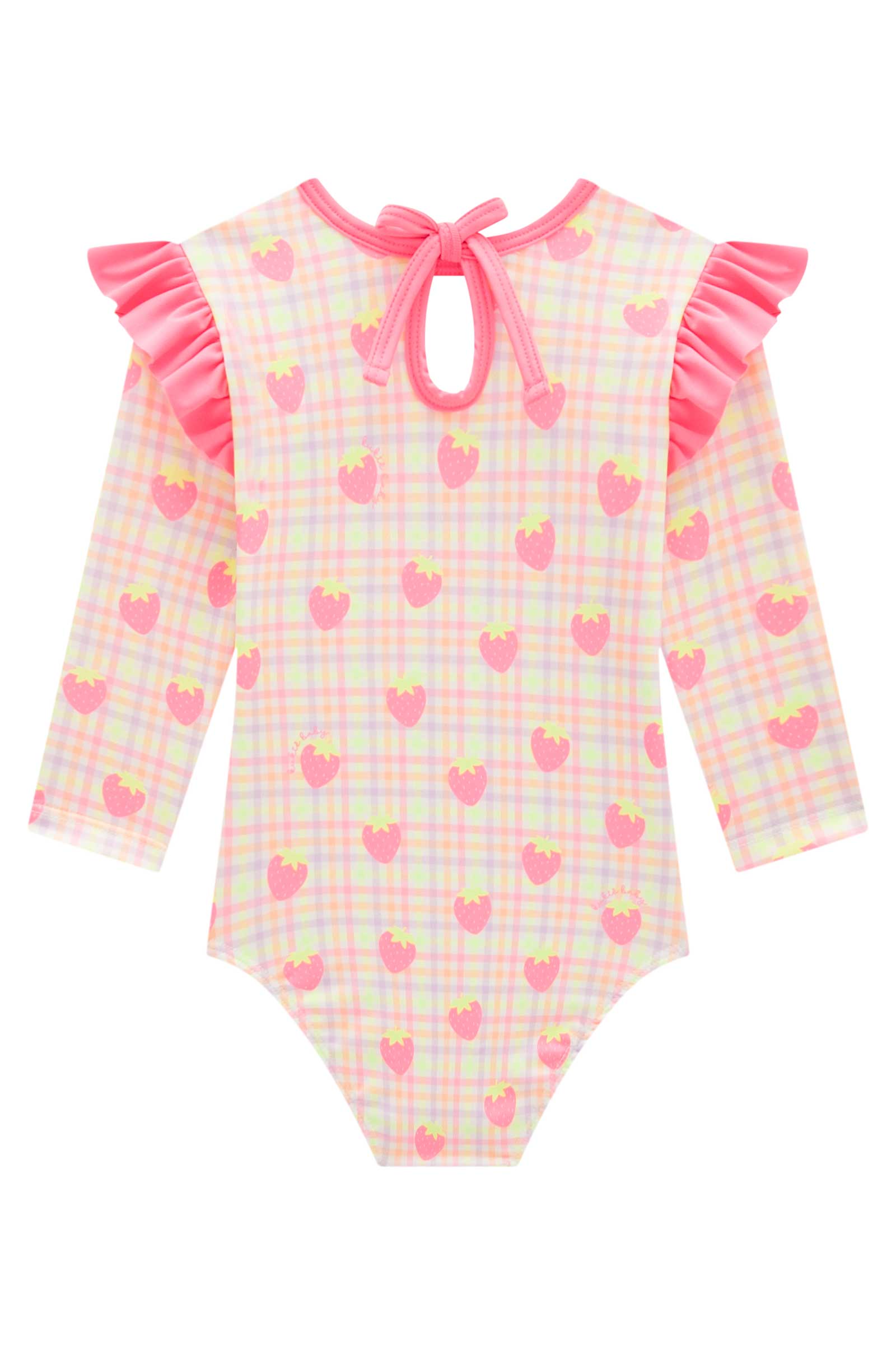Este enterito de baño para bebé es una explosión de ternura con su diseño a cuadros en tonos pastel y estampado de frutillas rosadas. Con mangas largas y volantes en los hombros, ofrece protección solar y estilo en un solo look. Su confección brasileña en tela de alta calidad asegura comodidad y durabilidad para los días de playa o piscina. Ideal para las más pequeñas que aman los colores vibrantes y los detalles dulces. ¡Perfecto para un verano lleno de alegría y frescura!