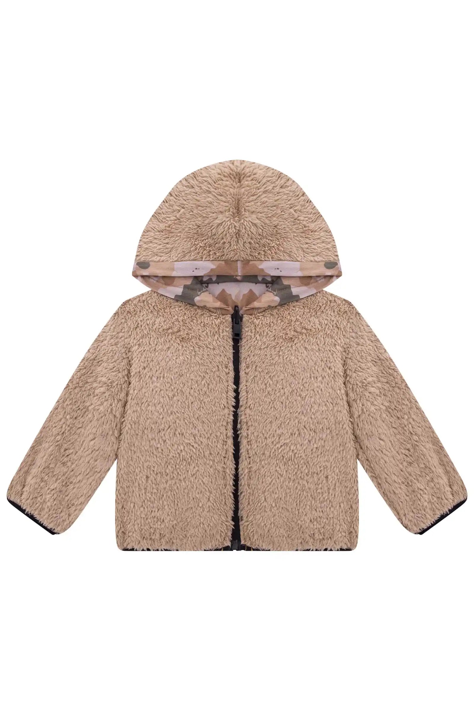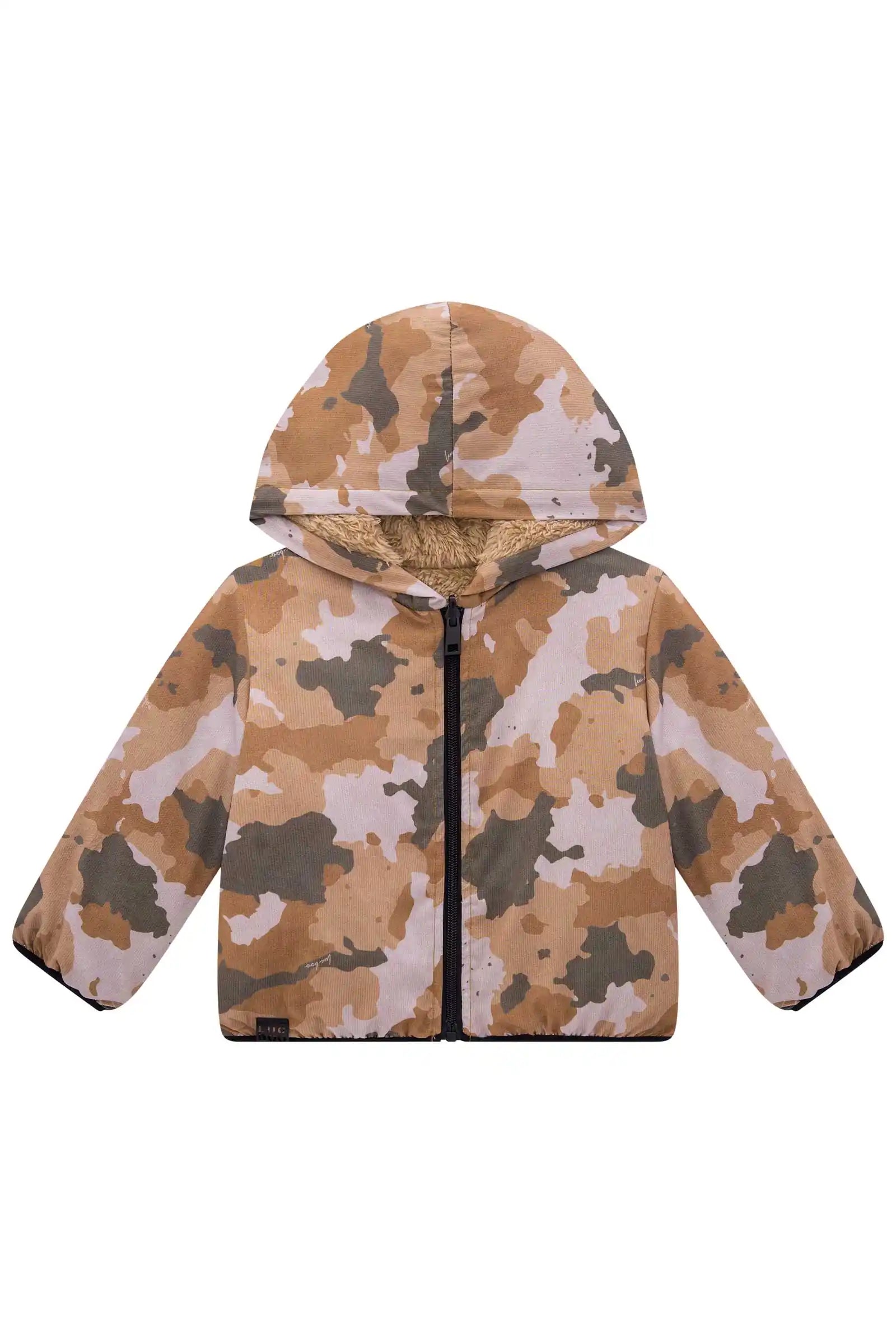 Chaqueta reversible de diseño camuflado en tonos tierra, perfecta para el invierno. Confeccionada en Brasil, combina un lado exterior impermeable tipo cortavientos con tecnología ripstop, y un interior ultra suave tipo peluche térmico. Ideal para niños activos, esta chaqueta es versátil, cómoda y muy abrigadora. Su diseño 2 en 1 permite cambiar de look fácilmente y adaptarse a distintos climas. Calidad garantizada y larga vida útil gracias a sus materiales resistentes y duraderos.