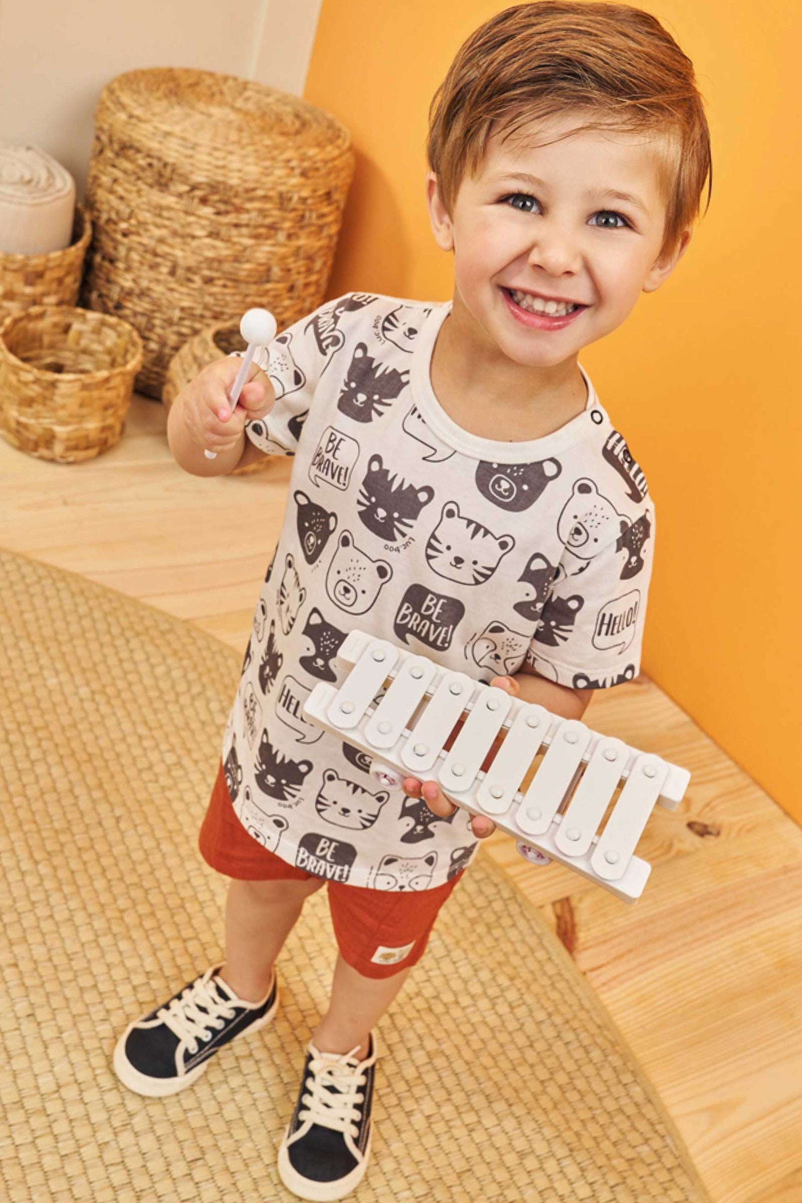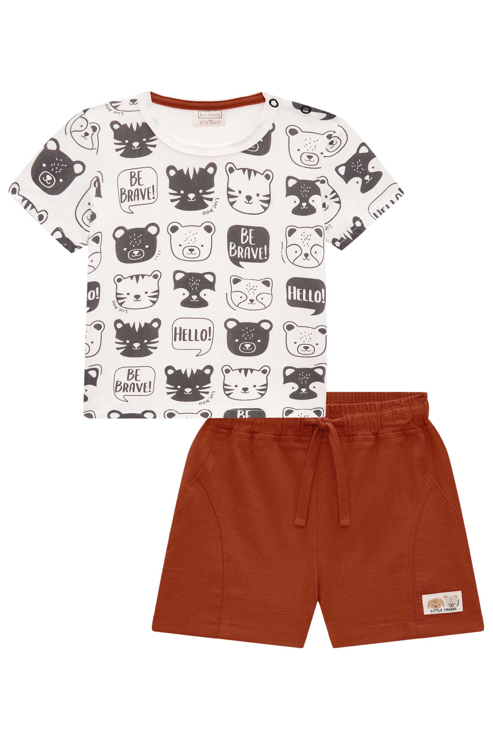 Conjunto de niño con polera estampada de adorables animales en tonos neutros y short en color terracota. Confeccionado en Brasil en materiales suaves y cómodos, perfectos para el verano y para mantener a los pequeños frescos y con estilo. Disponible en tallas de 1 a 3 años, ideal para cualquier ocasión casual y exploraciones diarias