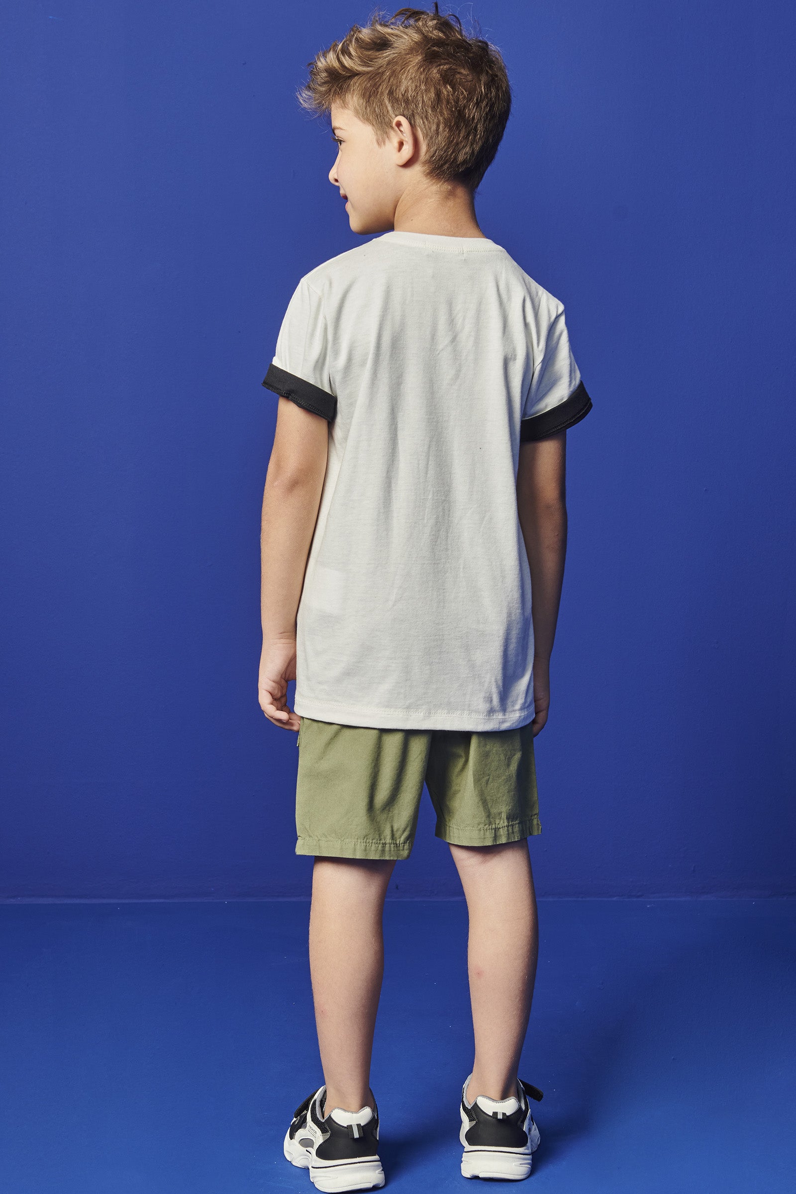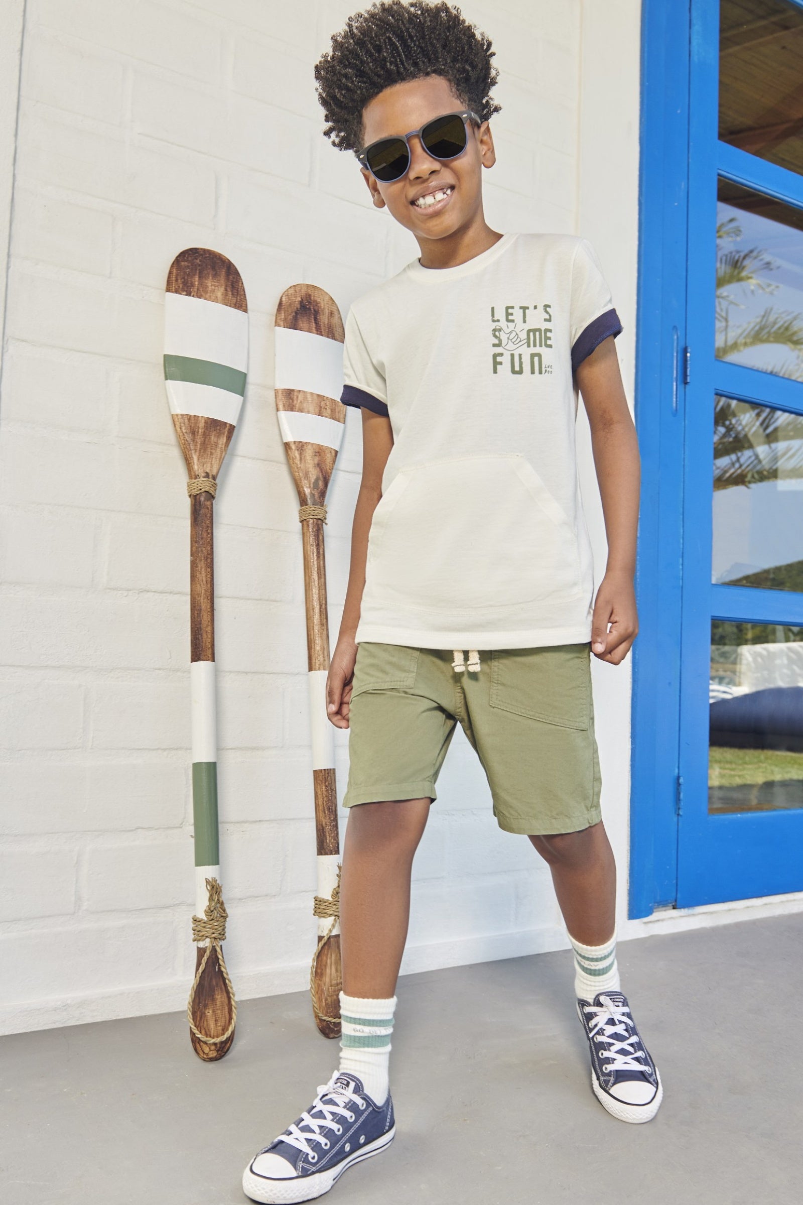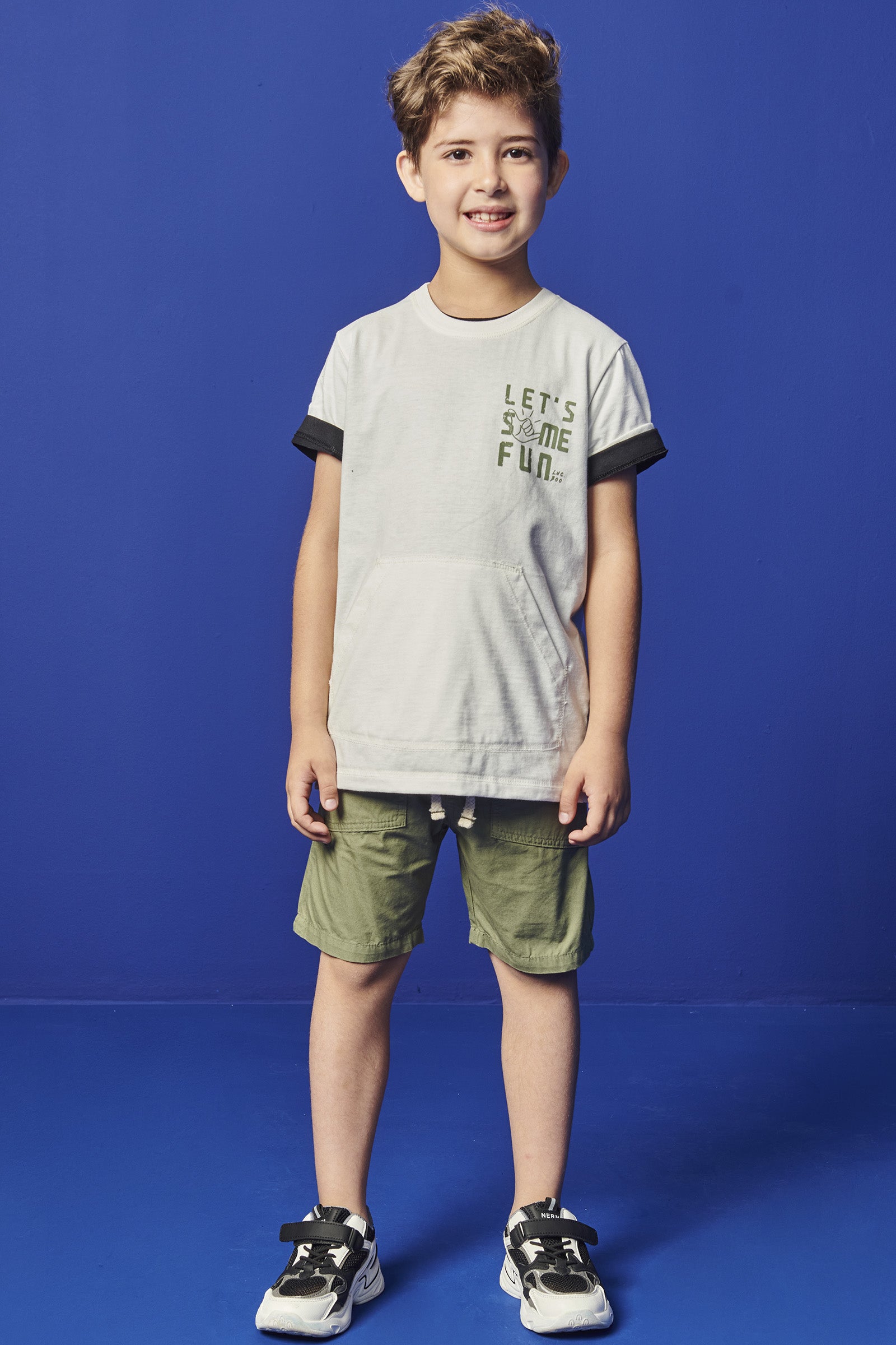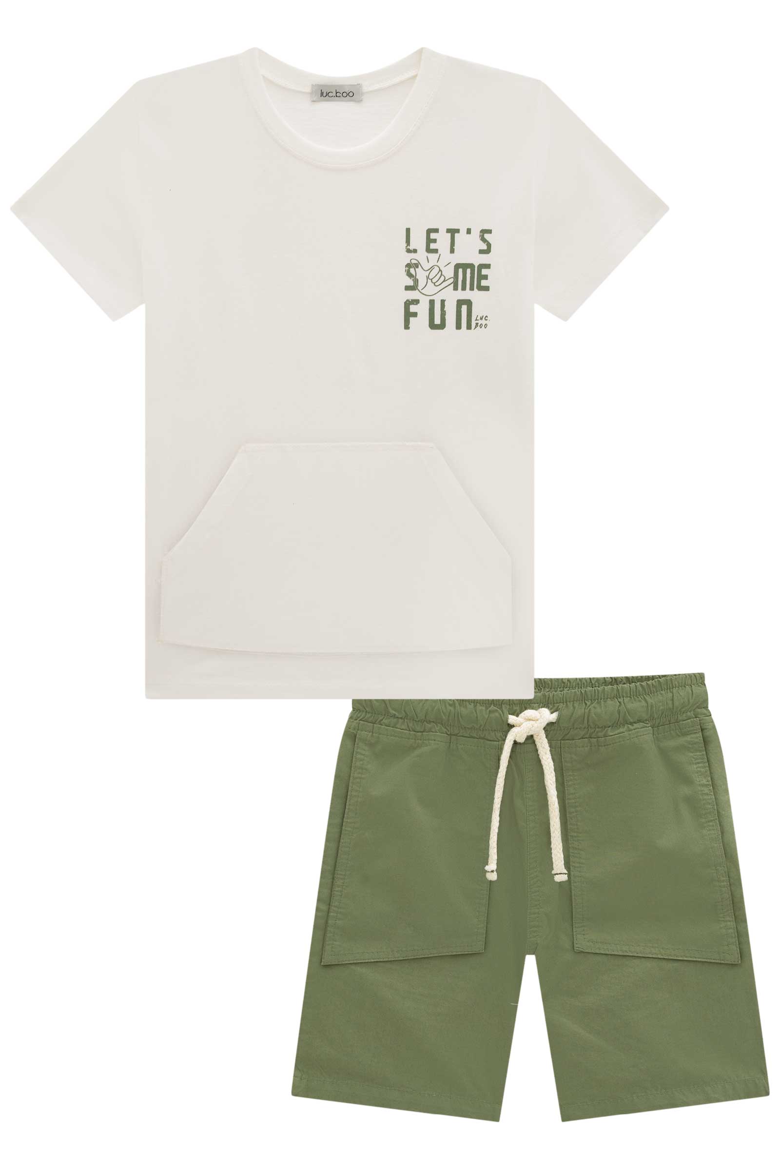 Conjunto infantil confeccionado en algodón brasileño, ideal para días de juego y diversión. Incluye polera blanca con bolsillo tipo canguro y estampado "Let’s have fun", y short verde con pretina elástica y lazo ajustable. Cómodo, fresco y duradero, perfecto para acompañar a los niños en cada aventura.