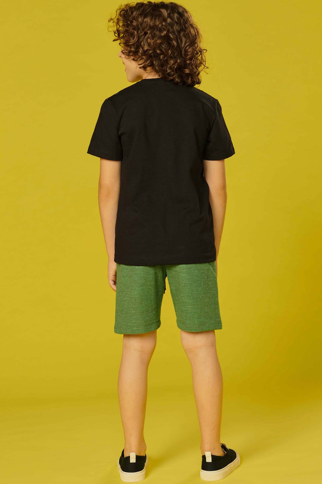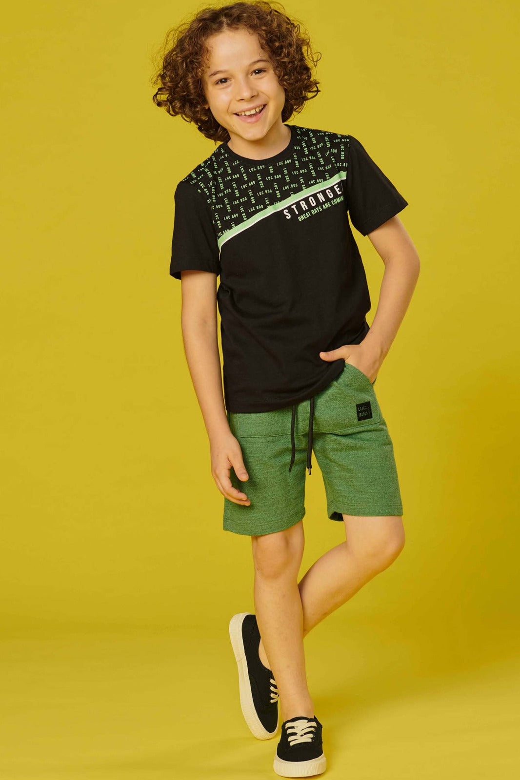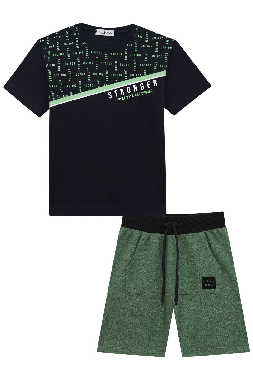 Conjunto para niño de la marca brasileña LucBoo compuesto por polera negra con diseño gráfico en tonos verdes y frase motivacional "Stronger", y short verde con pretina negra ajustable. Confeccionado en algodón suave y resistente, ideal para el día a día y para quienes buscan comodidad sin perder el estilo. Perfecto para looks urbanos y veraniegos, con la calidad de la confección brasileña que garantiza durabilidad y frescura.
