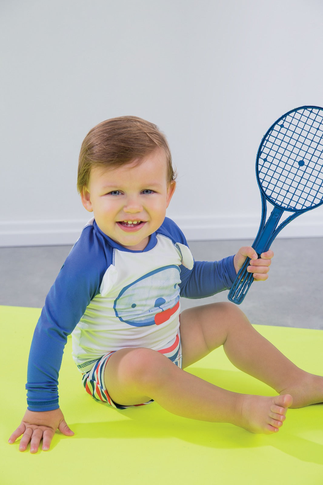 Conjunto de traje de baño con protección UV50 para niños, compuesto por polera manga larga en color blanco con mangas azules y estampado de perrito buceador, y short con rayas en tonos azul, rojo y blanco. Confección brasileña de alta calidad, ideal para proteger a los más pequeños del sol con estilo y comodidad durante el verano.