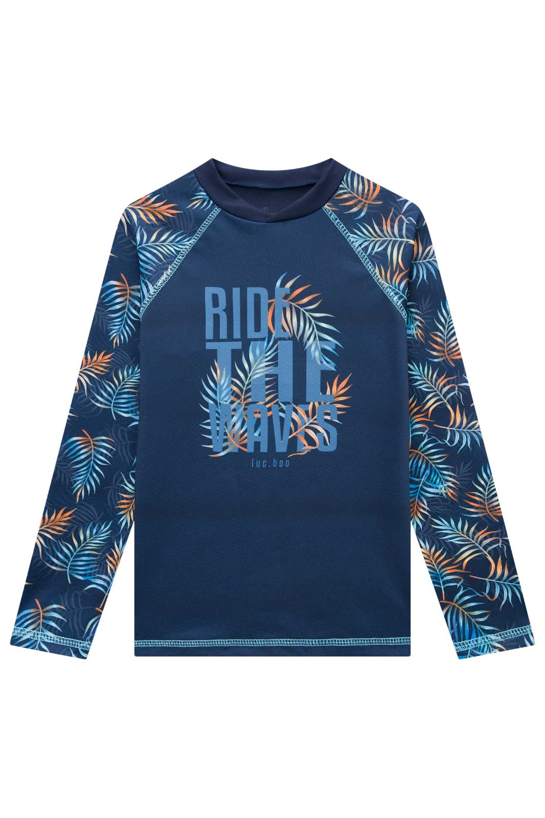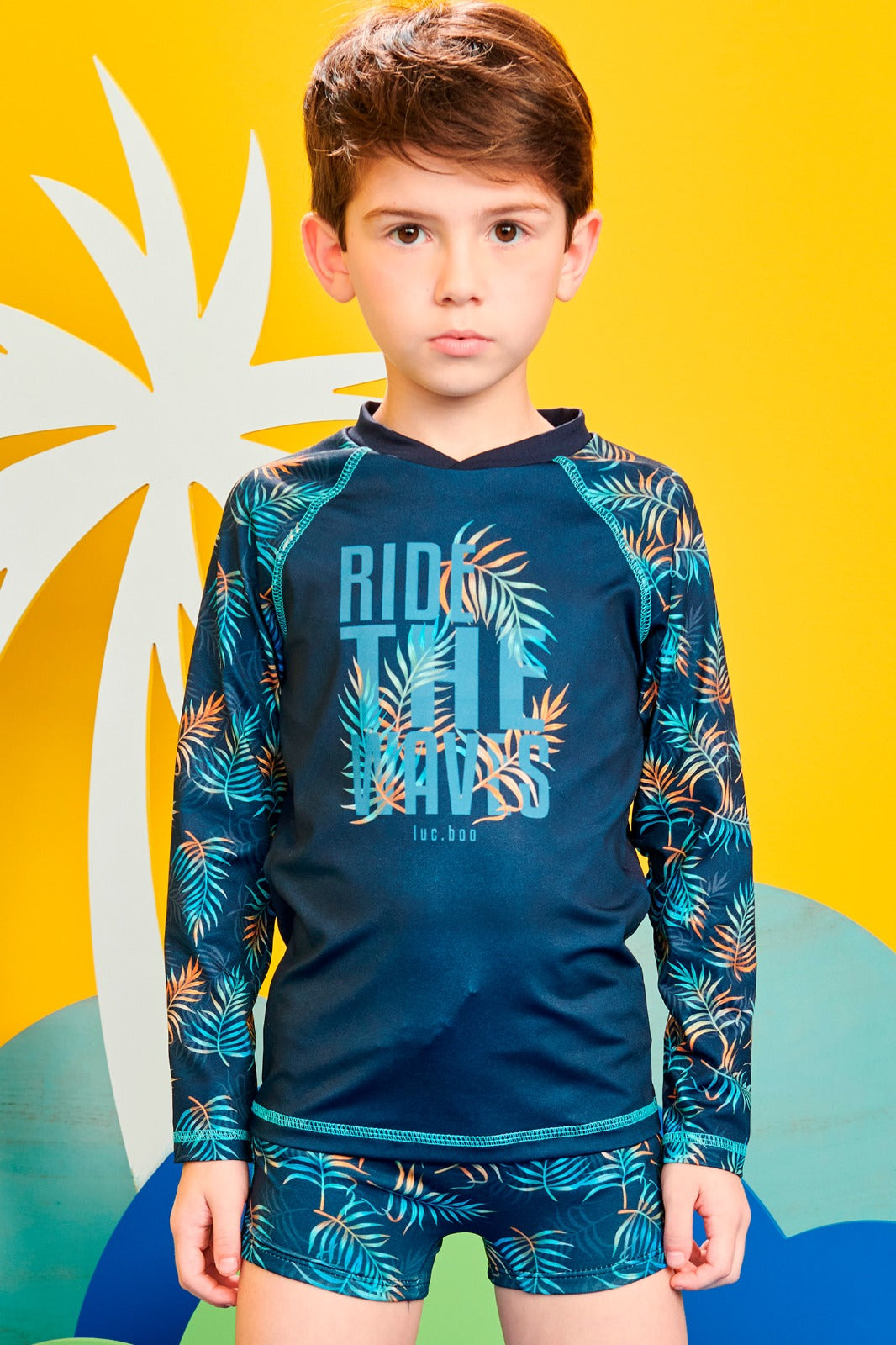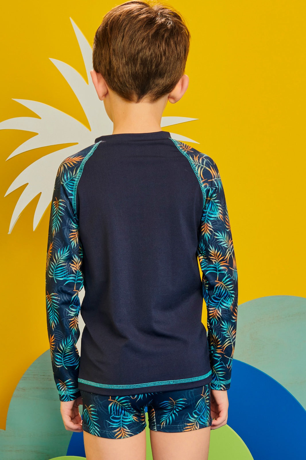 Conjunto de traje de baño infantil compuesto por polera UV de manga larga y short tipo bóxer con diseño de hojas tropicales en tonos vibrantes. Confeccionado en Brasil con tela de alta calidad, este set protege del sol con filtro UV50 y ofrece máxima comodidad y durabilidad para días de playa o piscina. Ideal para niños activos que aman el verano.