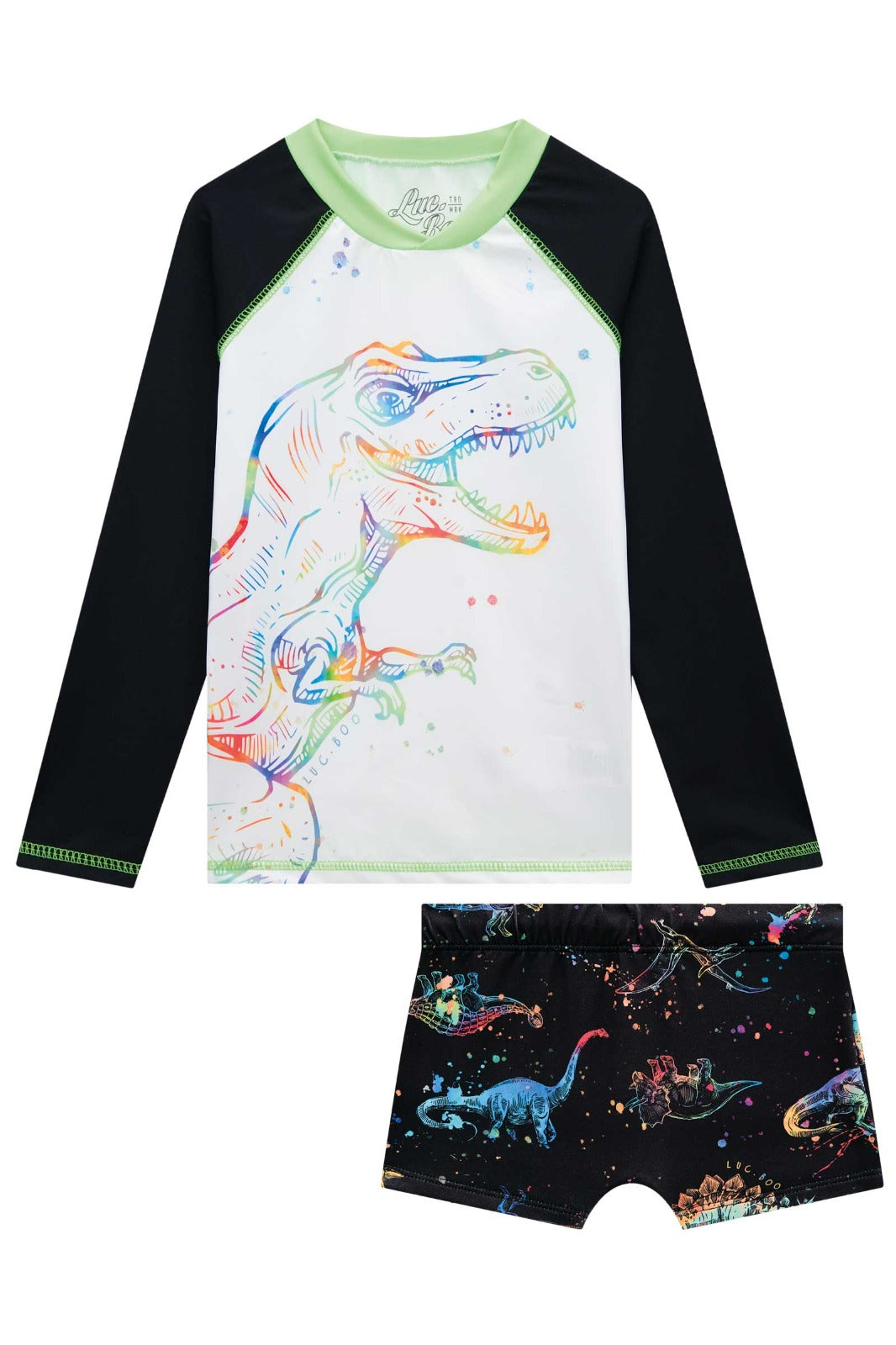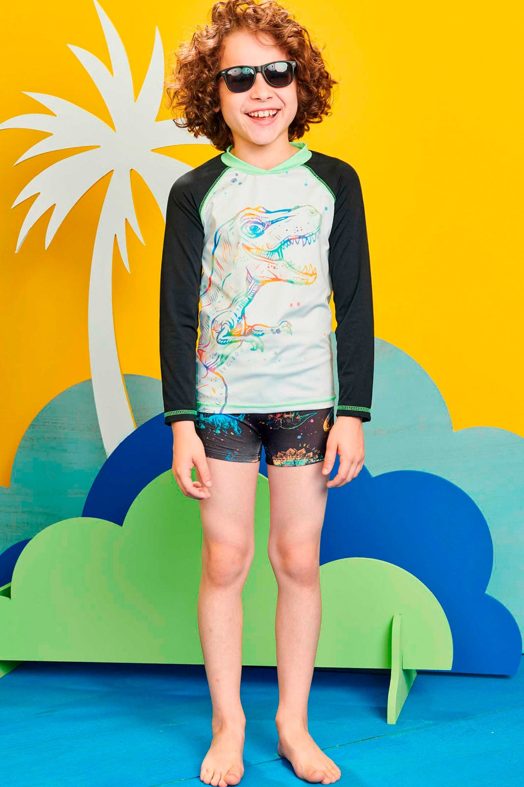 Conjunto de polera manga larga y sunga de baño con filtro UV50, ideal para proteger la piel de los niños mientras disfrutan del sol. La polera destaca por su entretenido diseño de dinosaurio multicolor en el frente y mangas negras con costuras verdes. El bóxer combina perfecto con un print de dinosaurios en tonos vibrantes sobre fondo negro. Confección brasileña de excelente calidad, resistente al cloro y al uso frecuente. Comodidad, estilo y protección en un solo conjunto.