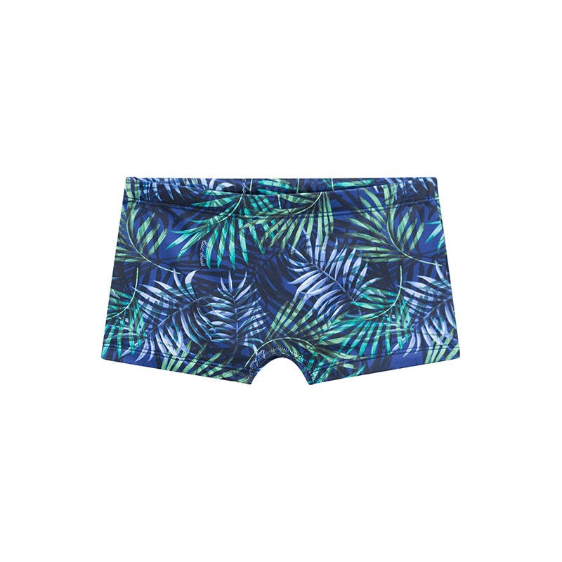 Sunga tipo short para niño con estampado tropical de hojas en tonos verdes y azul profundo. Ideal para el verano, está confeccionada con tela resistente de secado rápido y filtro UV 50 para mayor protección solar. Su calce cómodo y diseño moderno hacen de esta prenda una opción perfecta para días de playa o piscina. Hecha en Brasil, con excelente calidad y durabilidad.