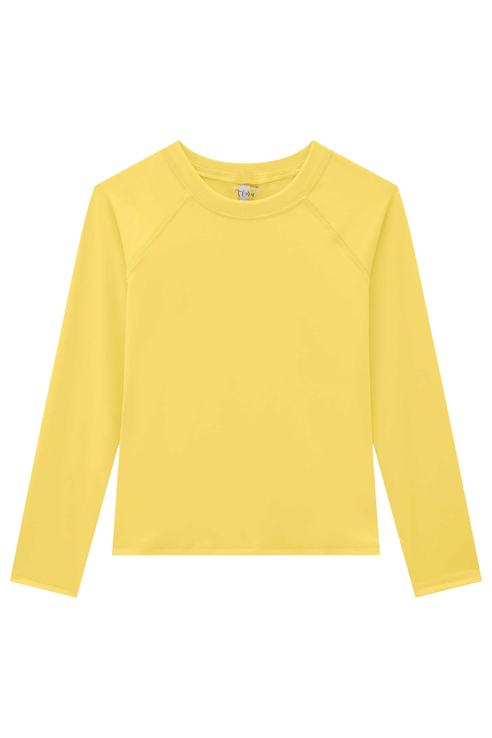 Polera filtro UV50+ de color amarillo y naranjo vibrante, ideal para proteger a las niñas del sol con estilo. Confección brasileña de alta calidad, ofrece comodidad, durabilidad y protección UV para días de playa, piscina o actividades al aire libre.
