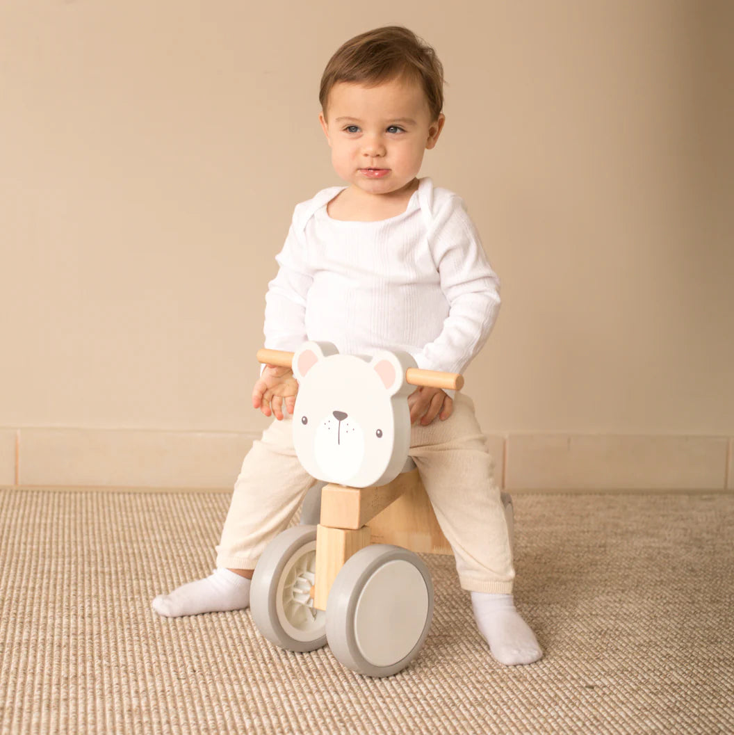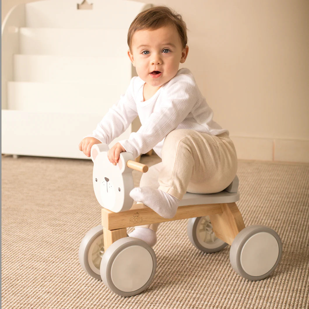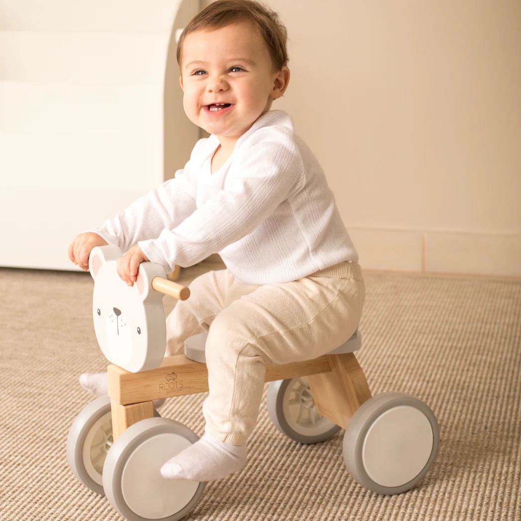 El Triciclo de Madera Correpasillos Oso Polar de Roots Toys es mucho más que un juguete: es un compañero de aventuras que acompaña cada descubrimiento, combinando juego, movimiento y diseño en una sola experiencia pensada para crecer jugando.