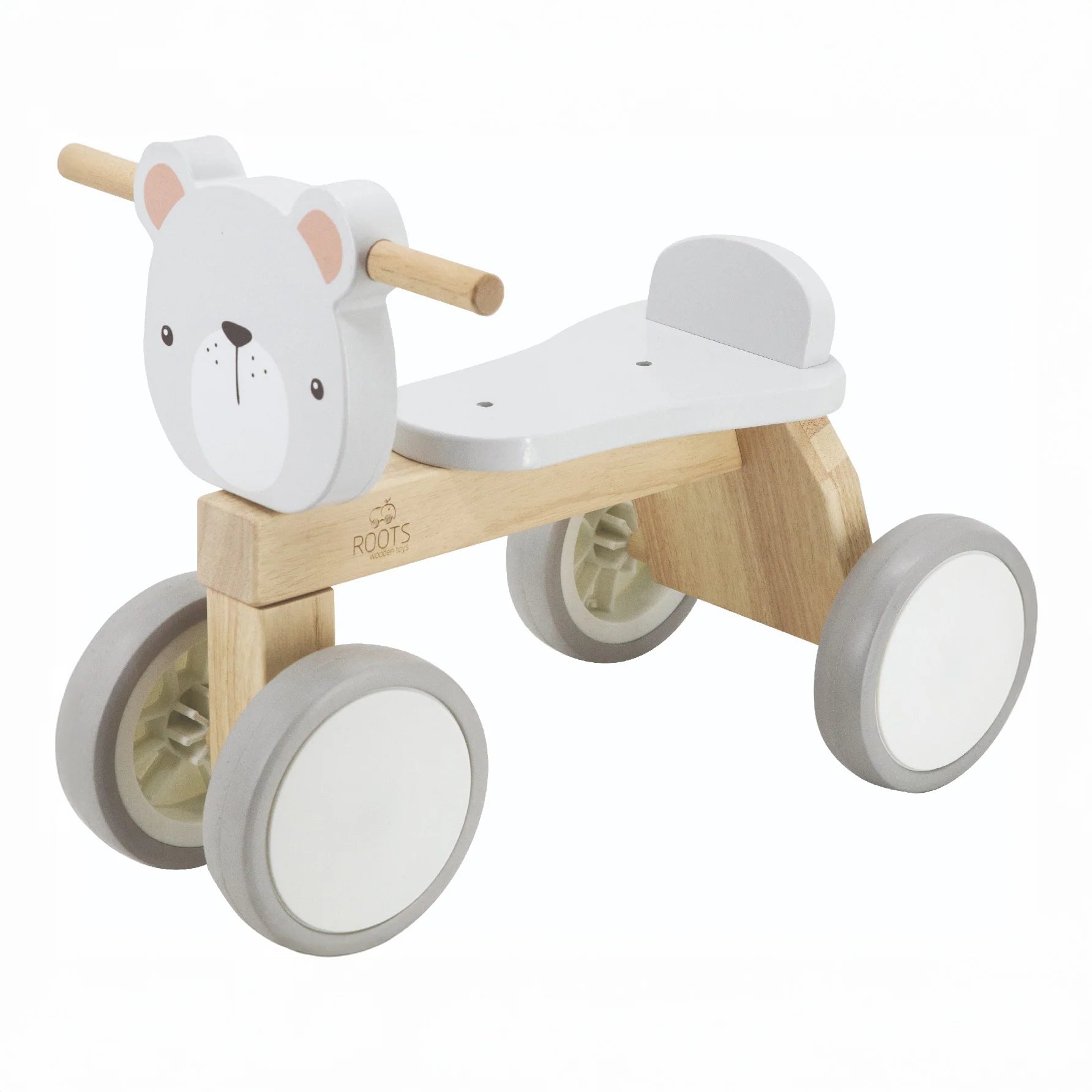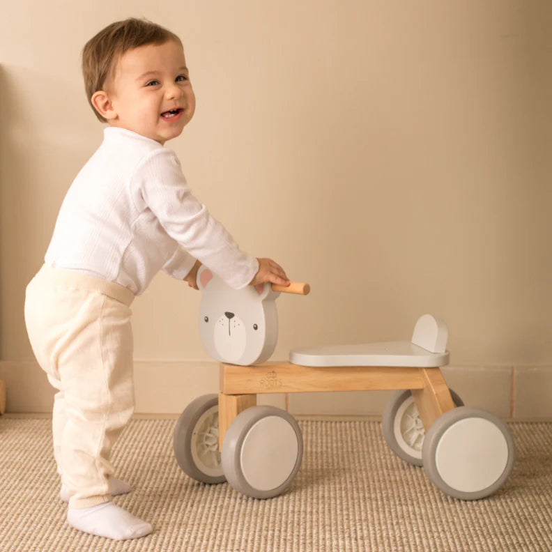 Los primeros paseos llenos de movimiento y confianza comienzan con el Triciclo Infantil de Madera tipo Correpasillos de Roots Toys, un juguete diseñado para acompañar a tu peque en una etapa clave de su desarrollo. Su delicado diseño de oso polar, junto a una estructura sólida y estable, invita a descubrir el movimiento de forma segura y entretenida desde temprana edad.