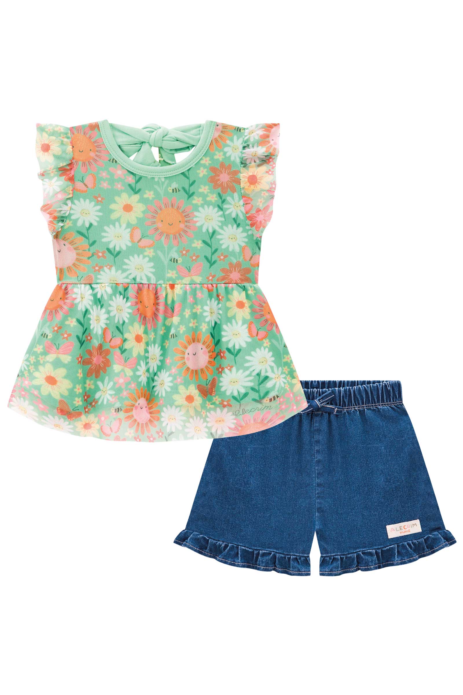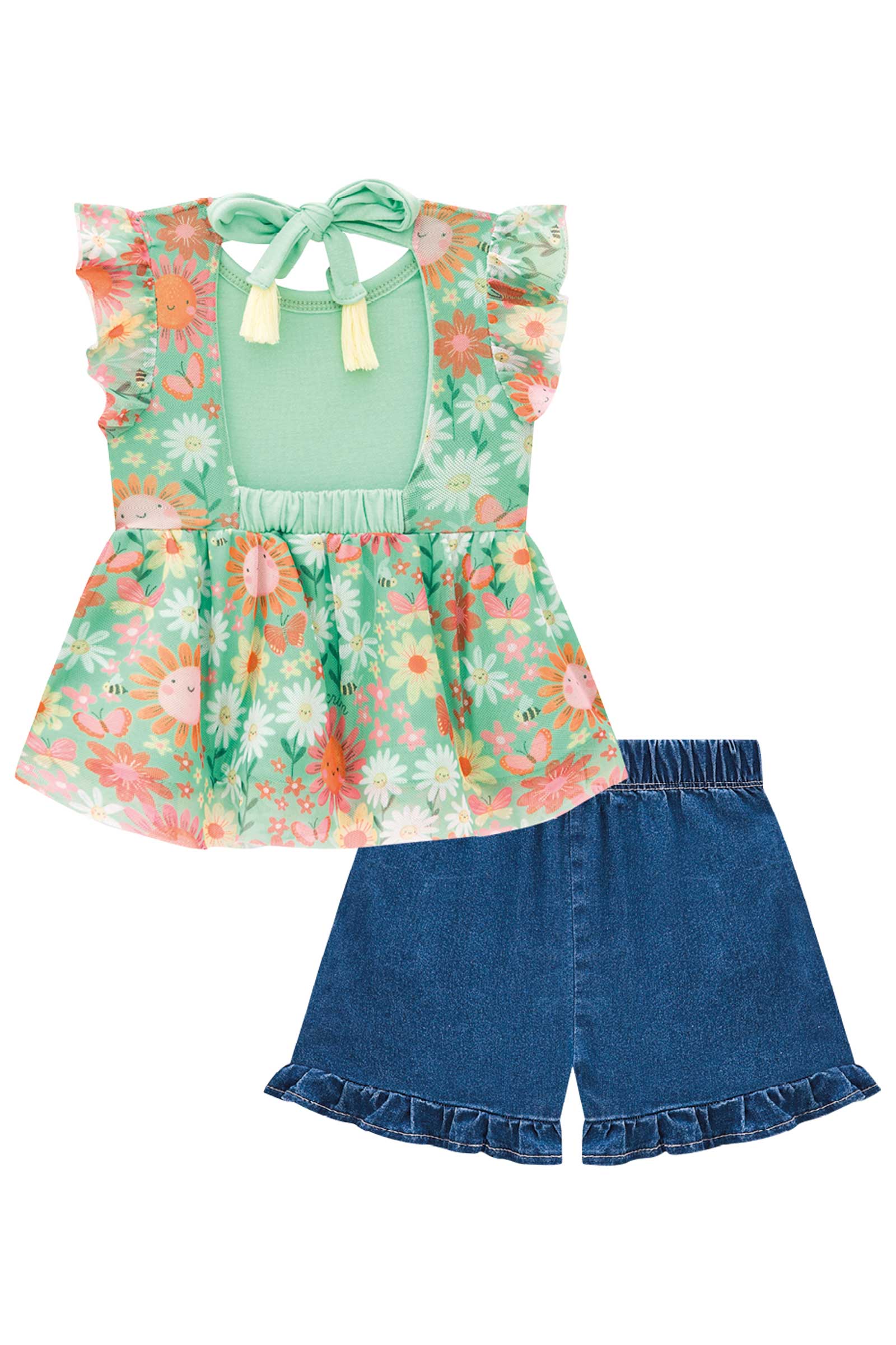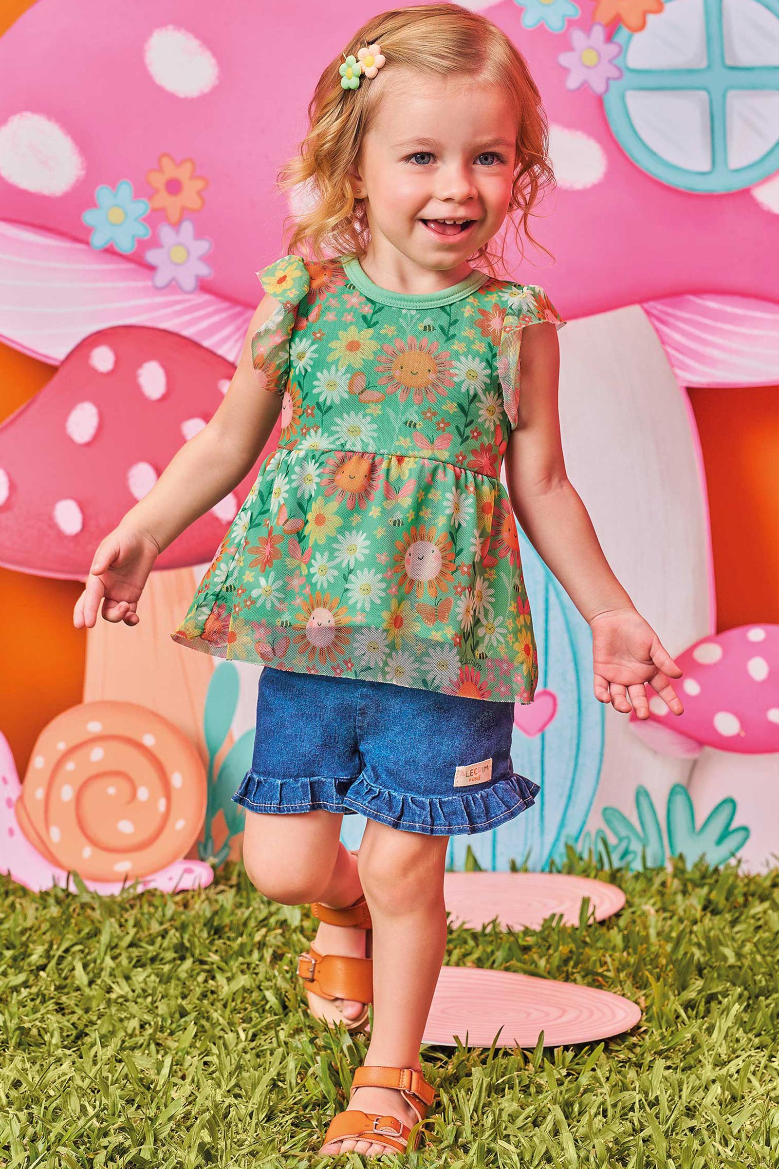 Este encantador conjunto para niñitas incluye una polera con estampado de flores y un short de mezclilla suave versátil y cómodo que combina fácilmente con cualquier otro outfit. Perfecto para los días de verano. ¡Una opción versátil y llena de estilo para cualquier ocasión!