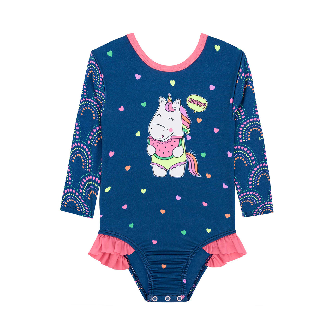 Traje de baño con diseño de unicornio, ideal para proteger a los bebés del sol con filtro UV50. Fabricado con materiales de alta calidad y diseño brasileño, ofrece comodidad, seguridad y estilo en los días de playa o piscina. ¡Perfecto para los más pequeños!
