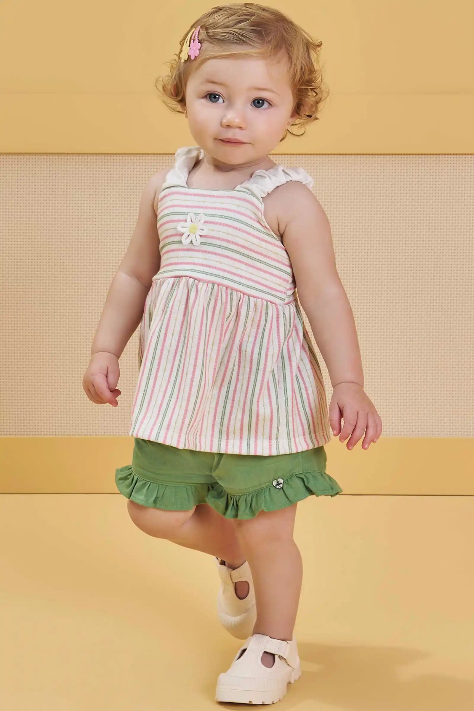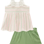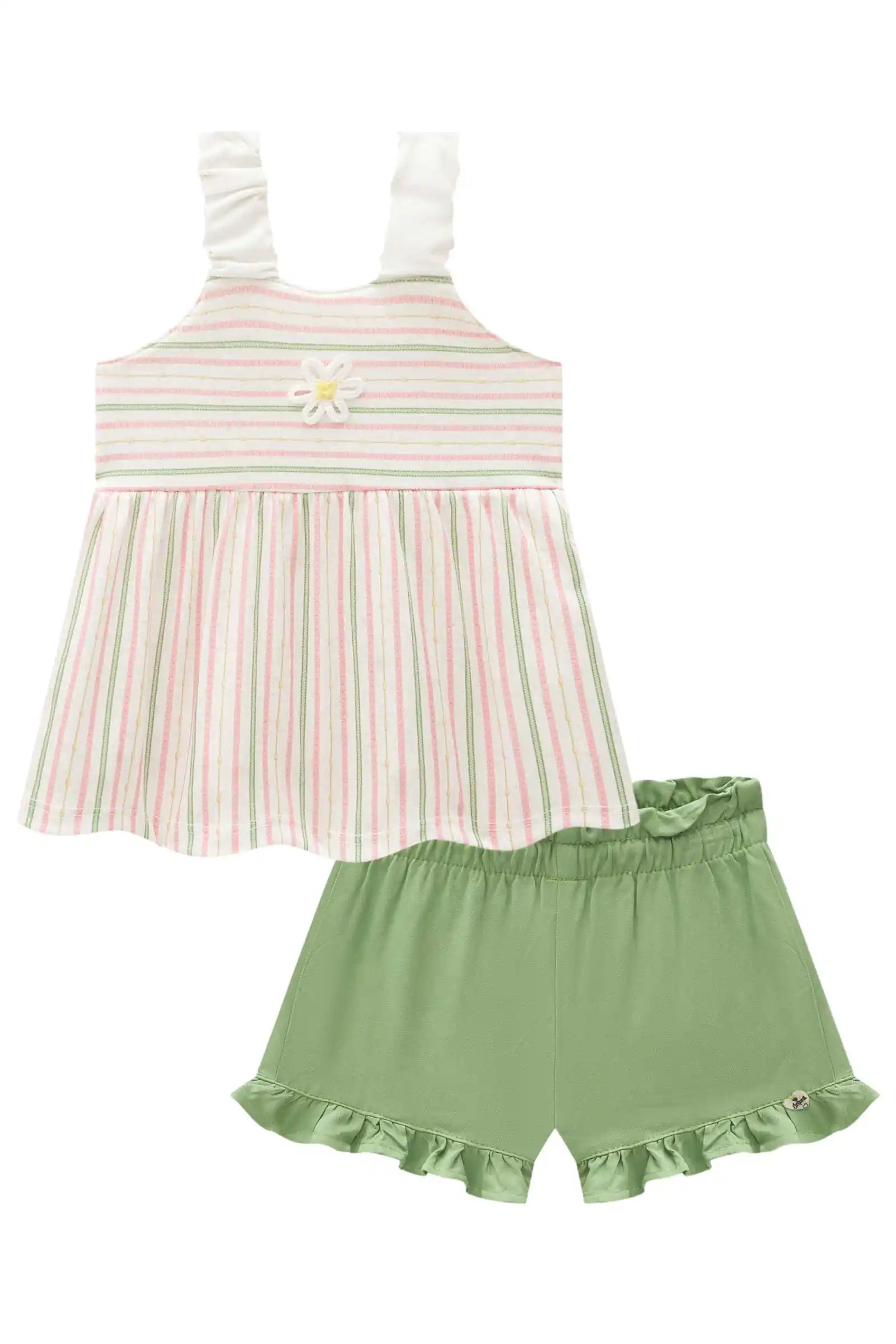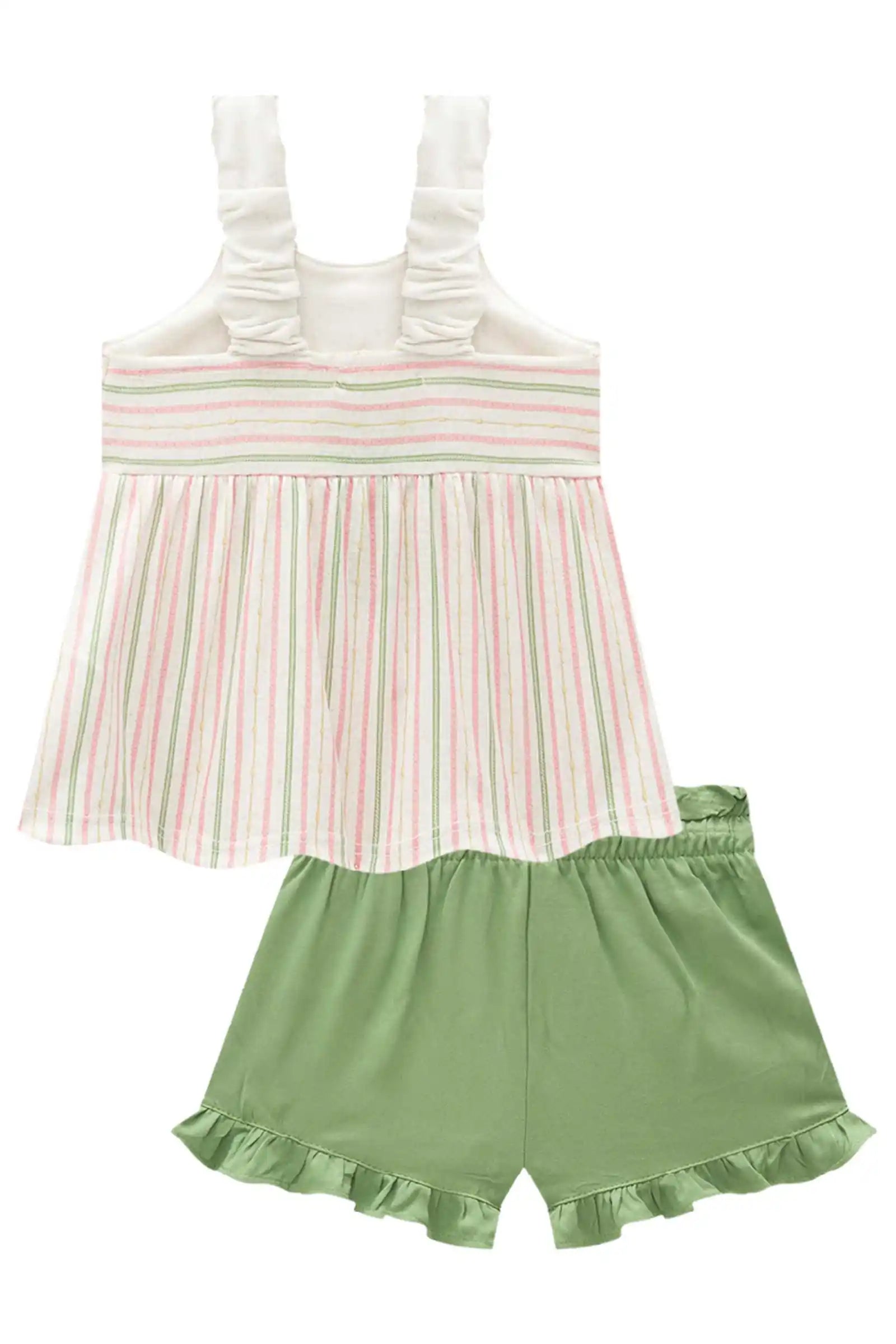 Este conjunto veraniego incluye polera ligera estampada con rayas en tonos pastel y un detalle bordado de flor, más un short verde con volantes en el ruedo. Confeccionado con algodón brasileño de alta calidad, suave, fresco y perfecto para los días de calor.