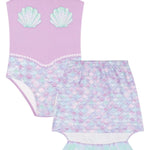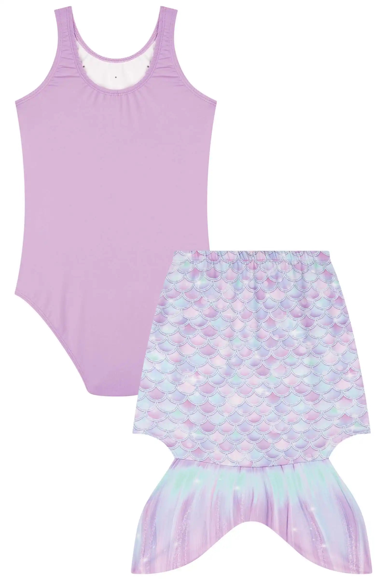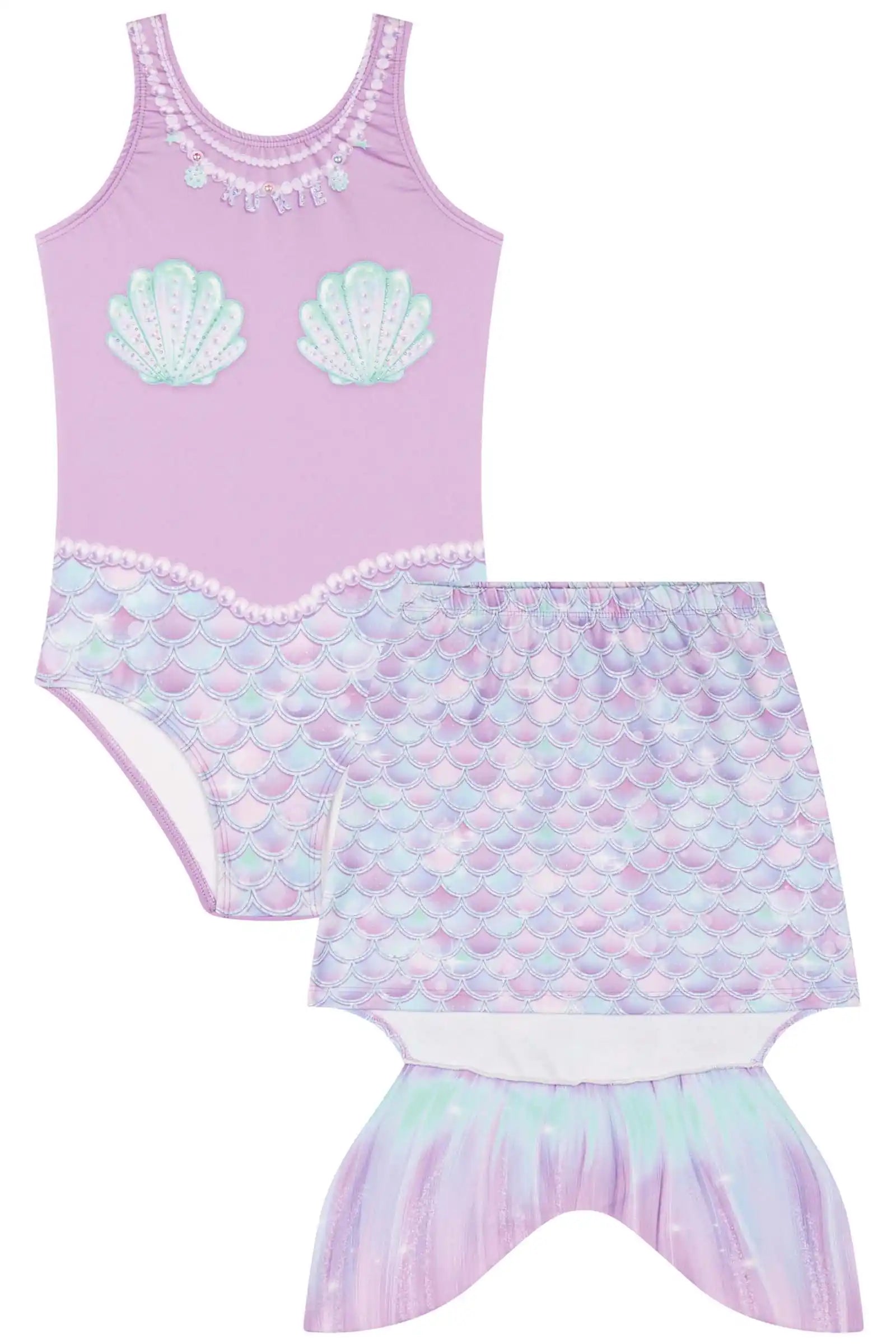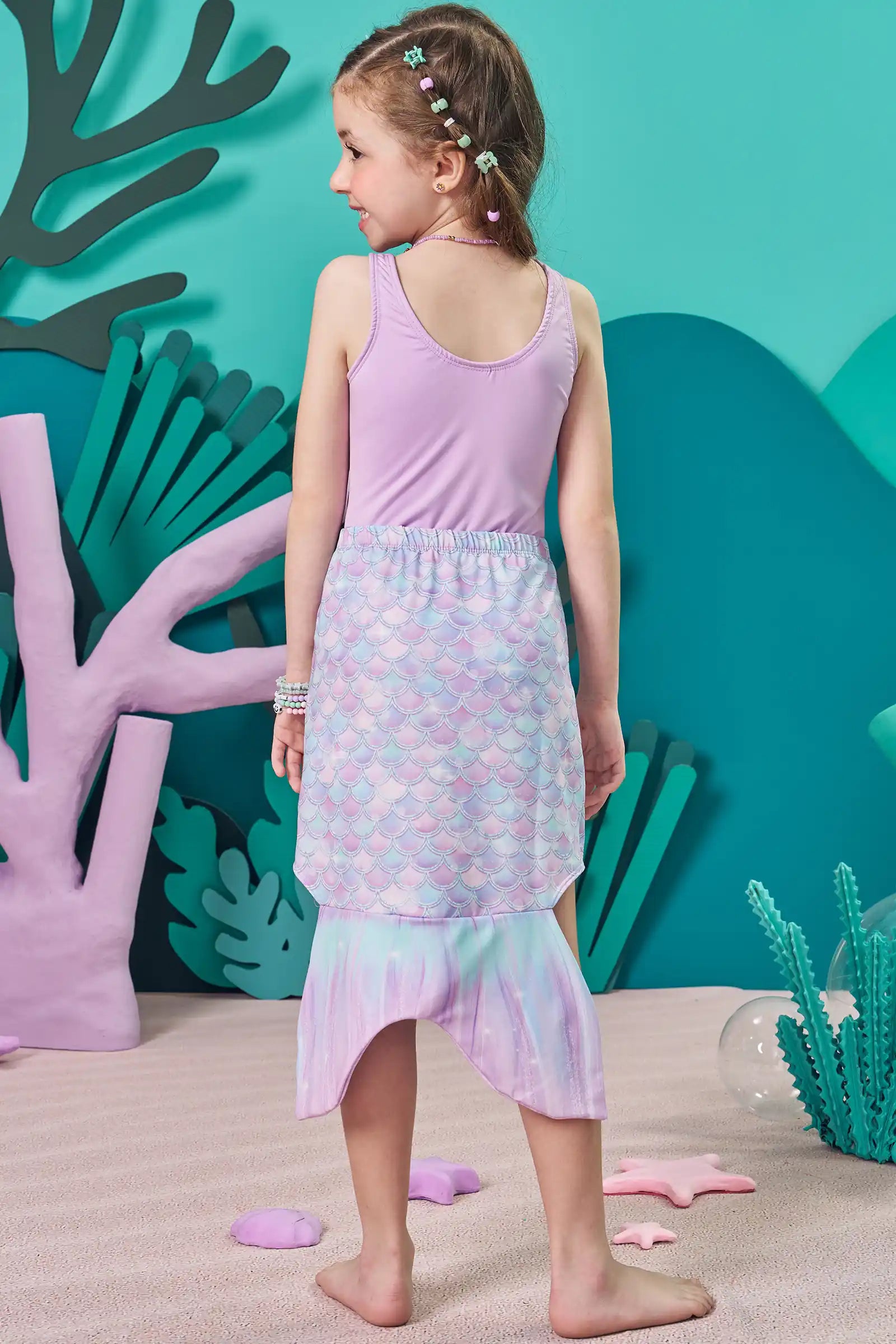 Convierte el verano en un cuento mágico con este conjunto de sirena en tonos pastel, perfecto para las pequeñas que aman el mundo marino. Incluye traje de baño lila de una pieza con detalles de conchitas en relieve y falda desmontable con diseño escamas y cola de sirena para jugar, fotos y piscina. Hecho con confección brasileña de alta calidad, suave, cómodo y resistente al uso diario. Ideal para playa, piscina y fiestas temáticas. Un conjunto único que hará brillar a tu niña.