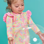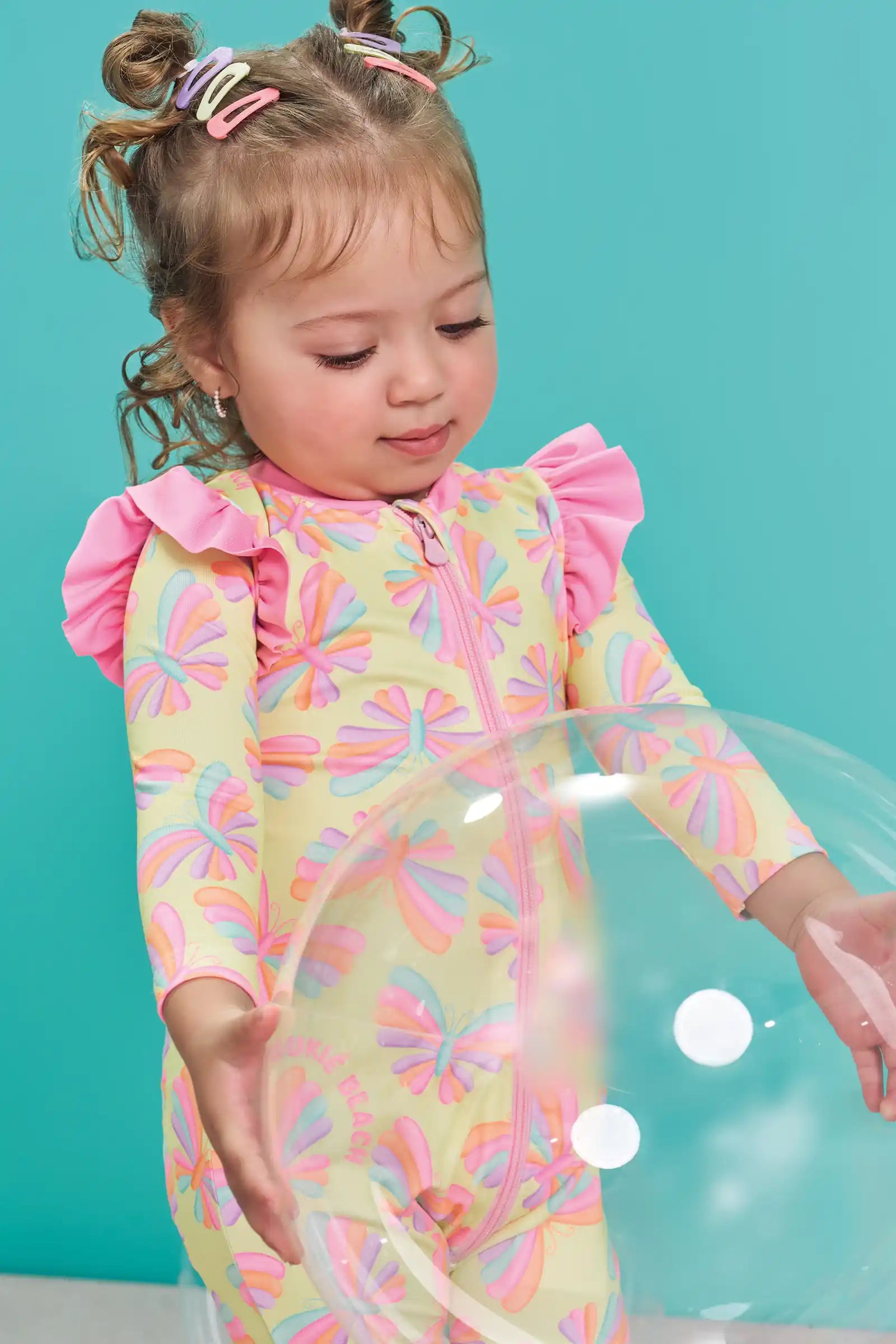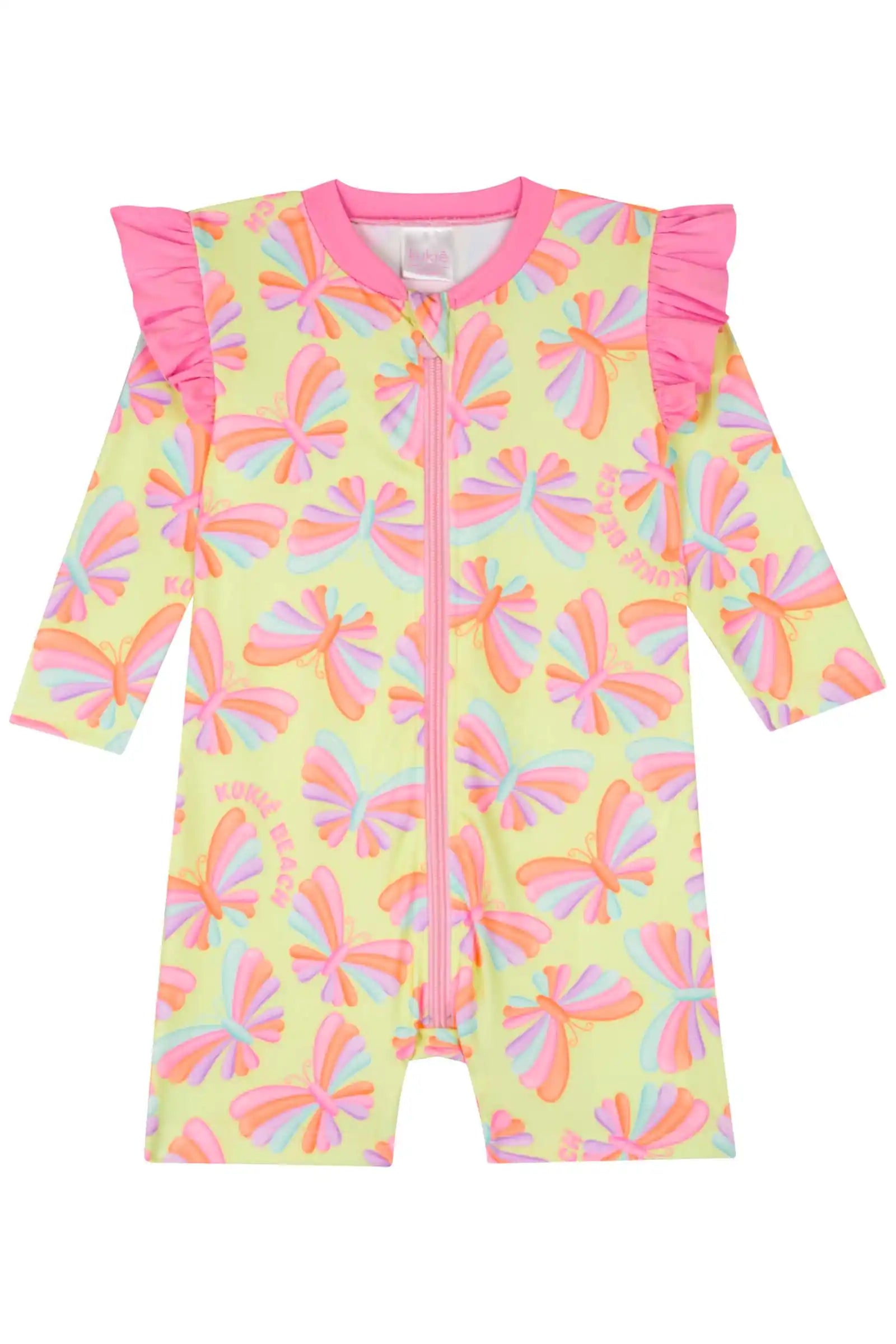 Protege a tu guagua con estilo este verano con el enterito de baño UV50+, diseñado para brindar máxima seguridad bajo el sol. Su estampado de mariposas en tonos pastel y los tiernos volantes rosados en los hombros lo convierten en un modelo único, cómodo y perfecto para piscina o playa.