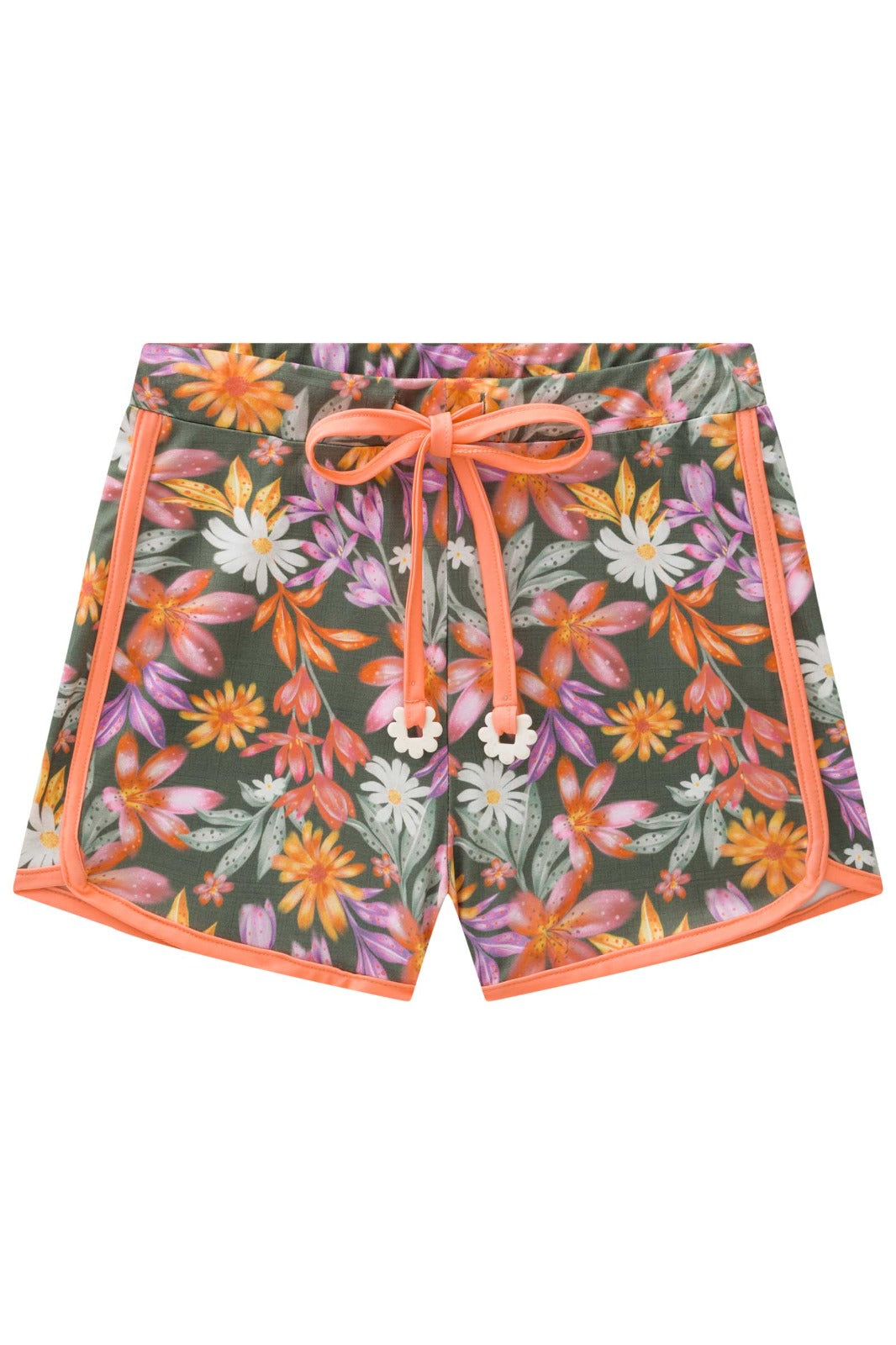 Short infantil Kukie con hermoso estampado floral en tonos vibrantes sobre fondo verde musgo. Fabricado en Brasil con tela ligera, de secado rápido y con protección solar UV 50+, ideal para disfrutar del verano con total comodidad y seguridad. Cuenta con pretina elástica, lazo decorativo con terminaciones en forma de flor y vivos en color coral que le dan un toque alegre y femenino.