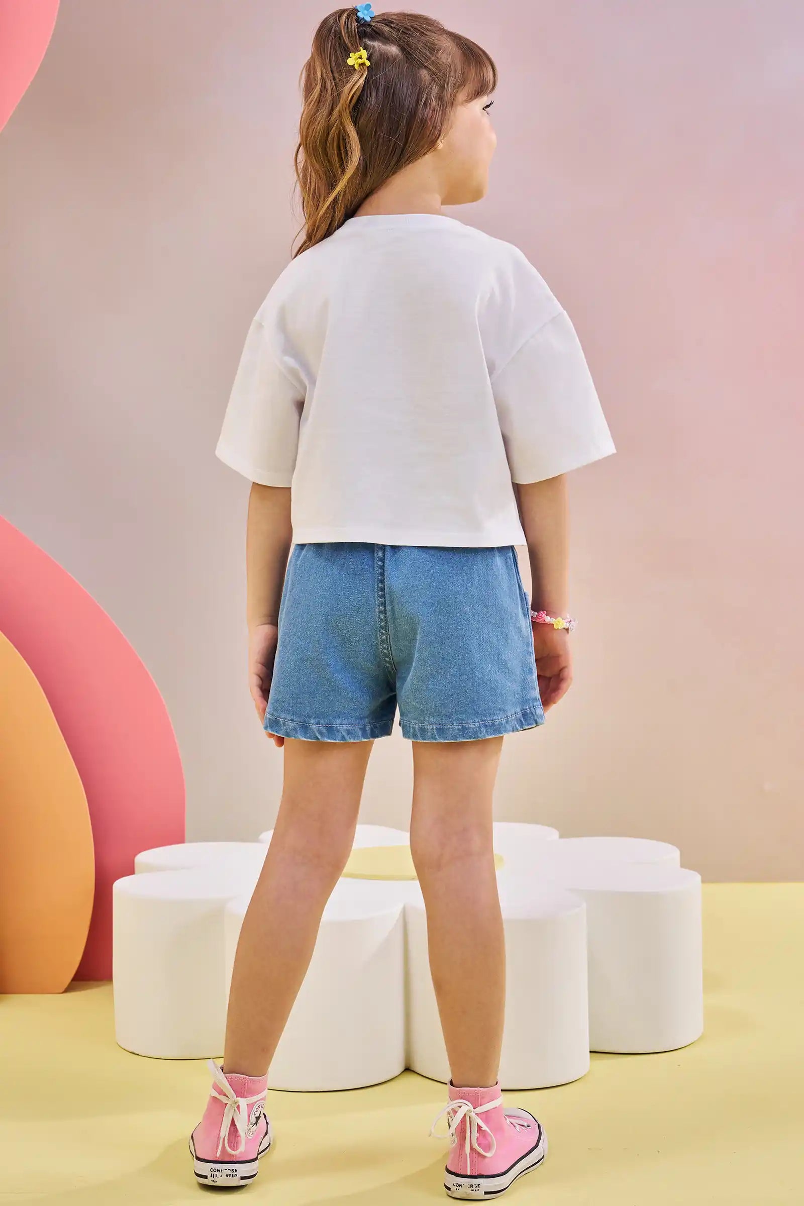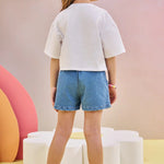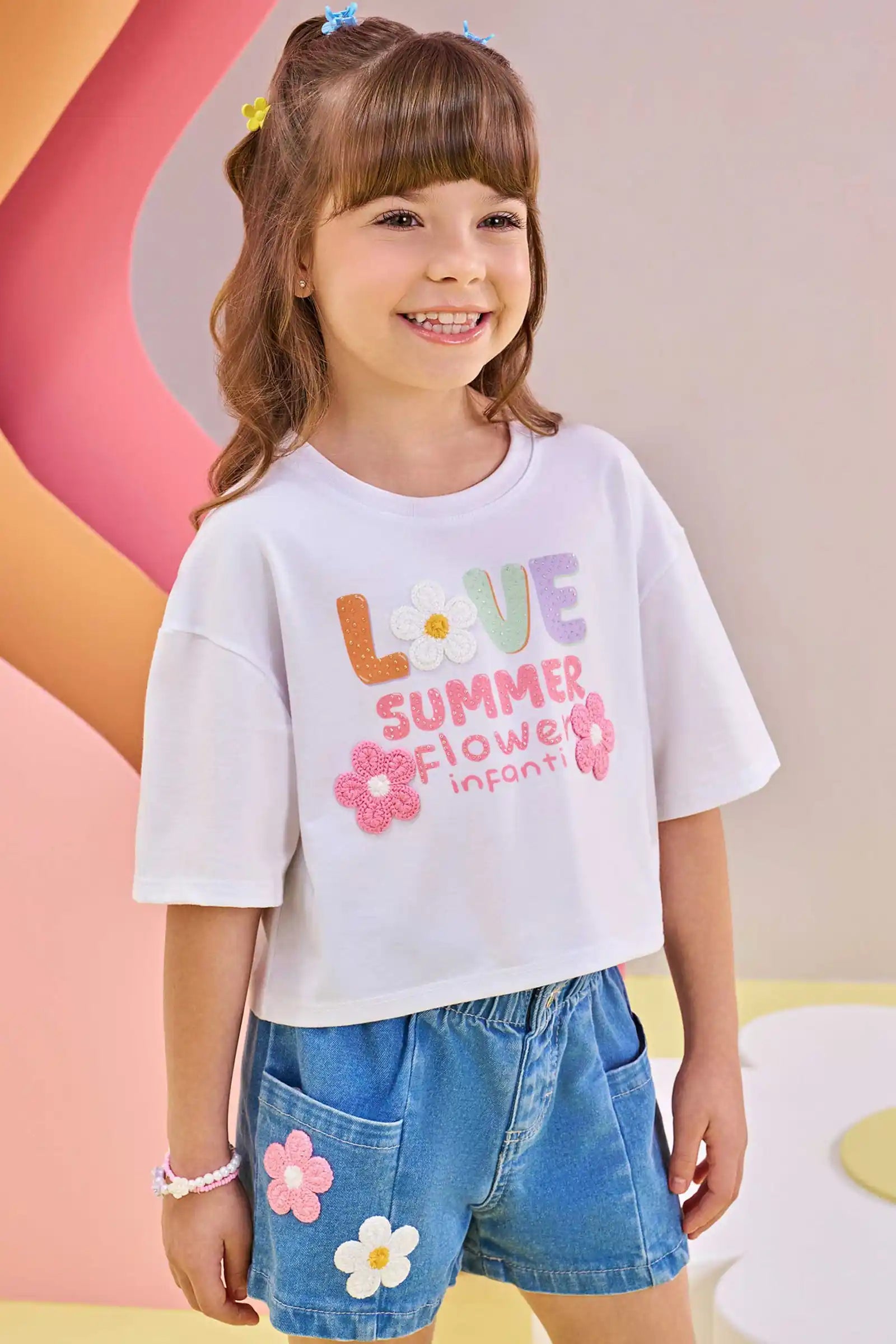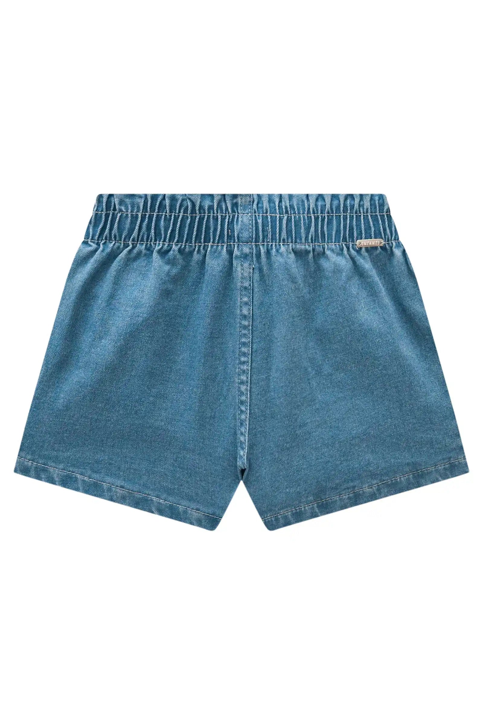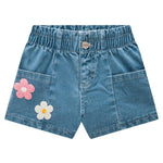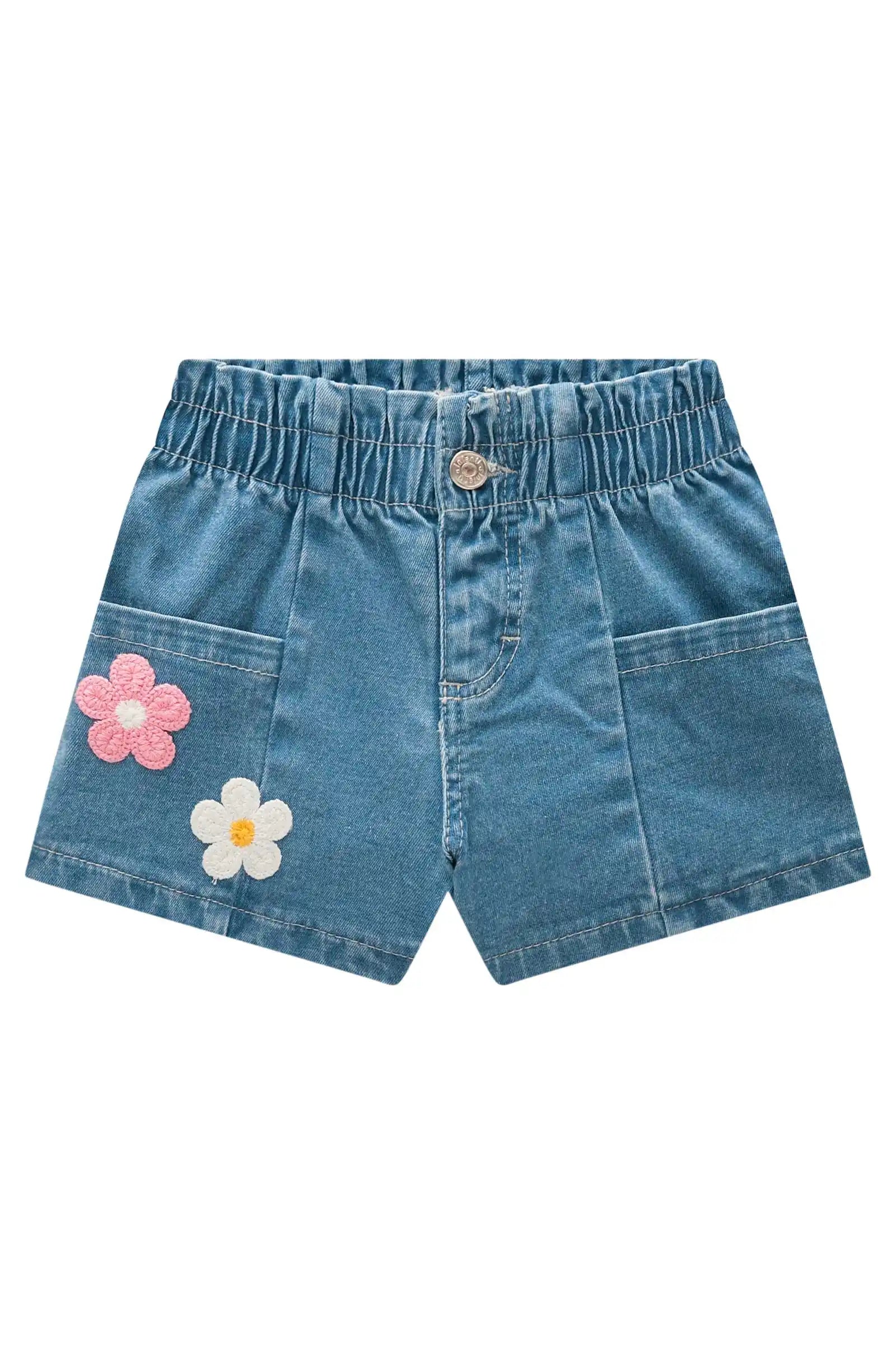 Short de mezclilla para niña con aplicaciones de flores bordadas, perfecto para los días cálidos de primavera y verano. Confeccionado en denim brasileño suave y resistente, ofrece comodidad gracias a su pretina elasticada que asegura un calce perfecto.