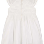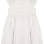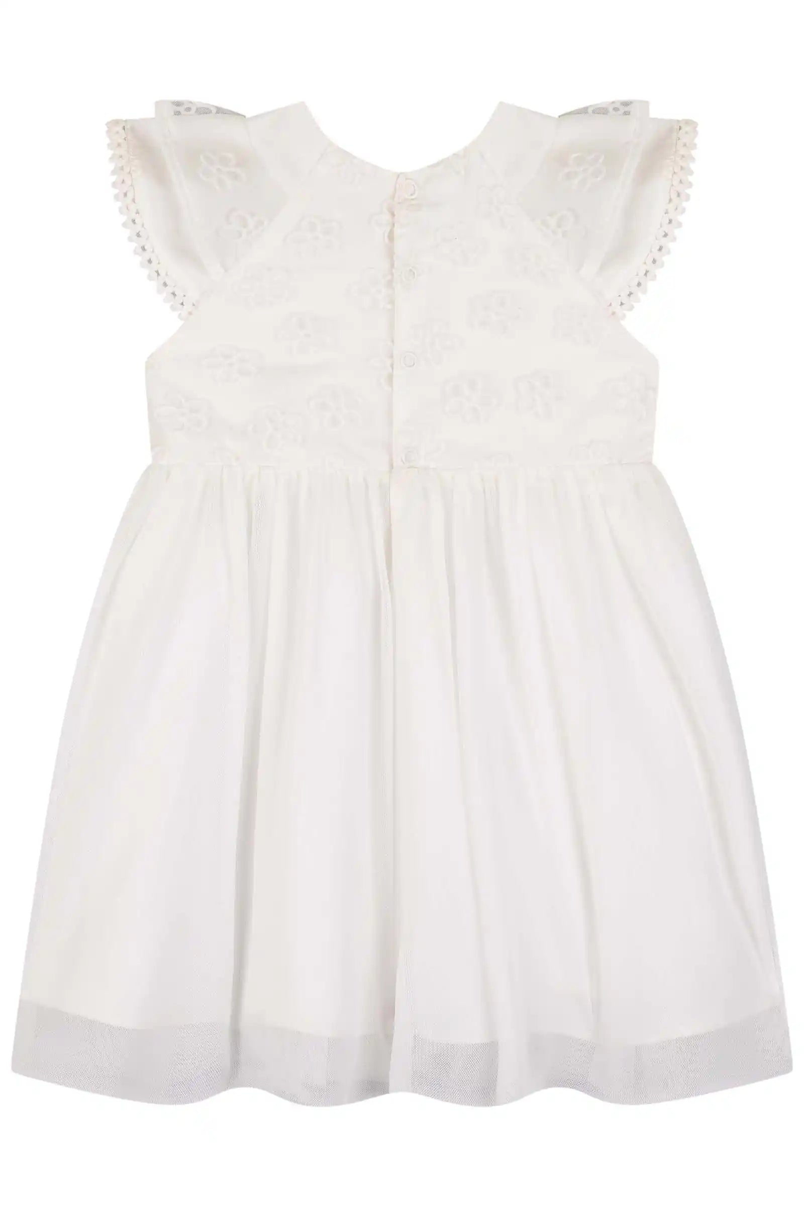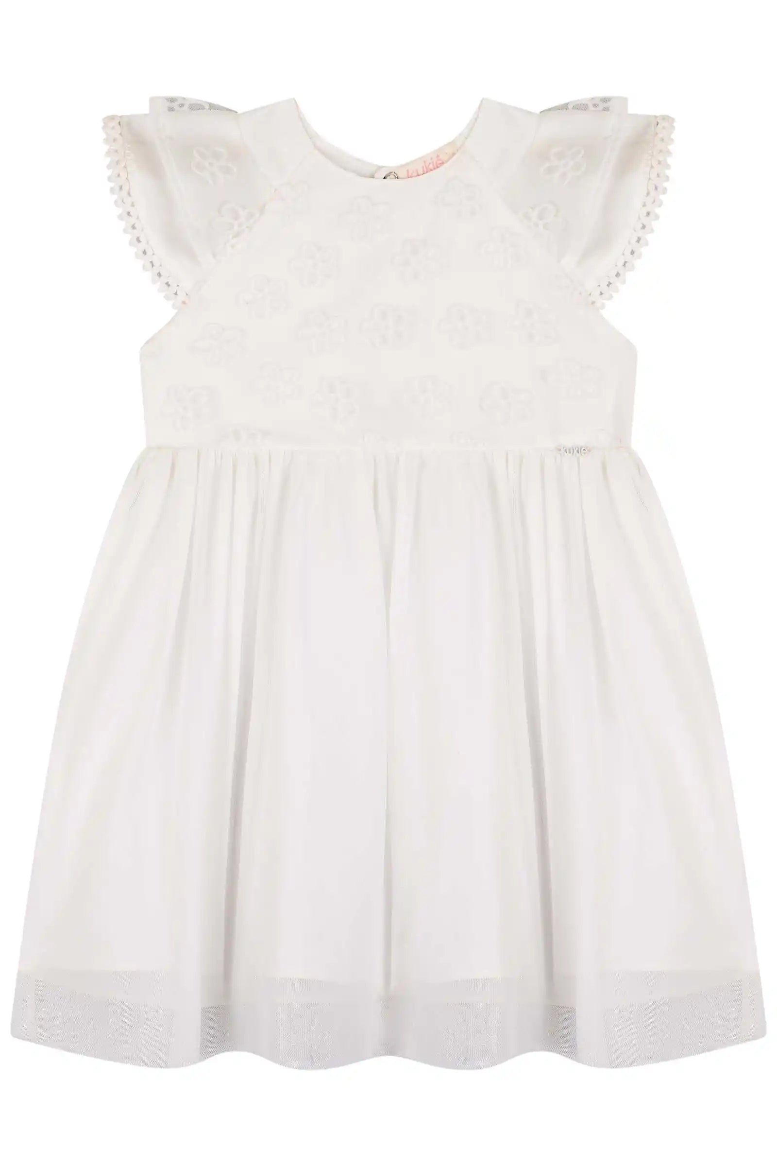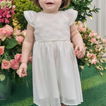 Su parte superior presenta un bordado floral en relieve, que aporta textura y sofisticación, mientras que las mangas volantes con terminación en encaje añaden un toque de dulzura y movimiento. La falda fluida con caída suave crea un look angelical y cómodo para niñas entre 9-12 meses y 3 años.