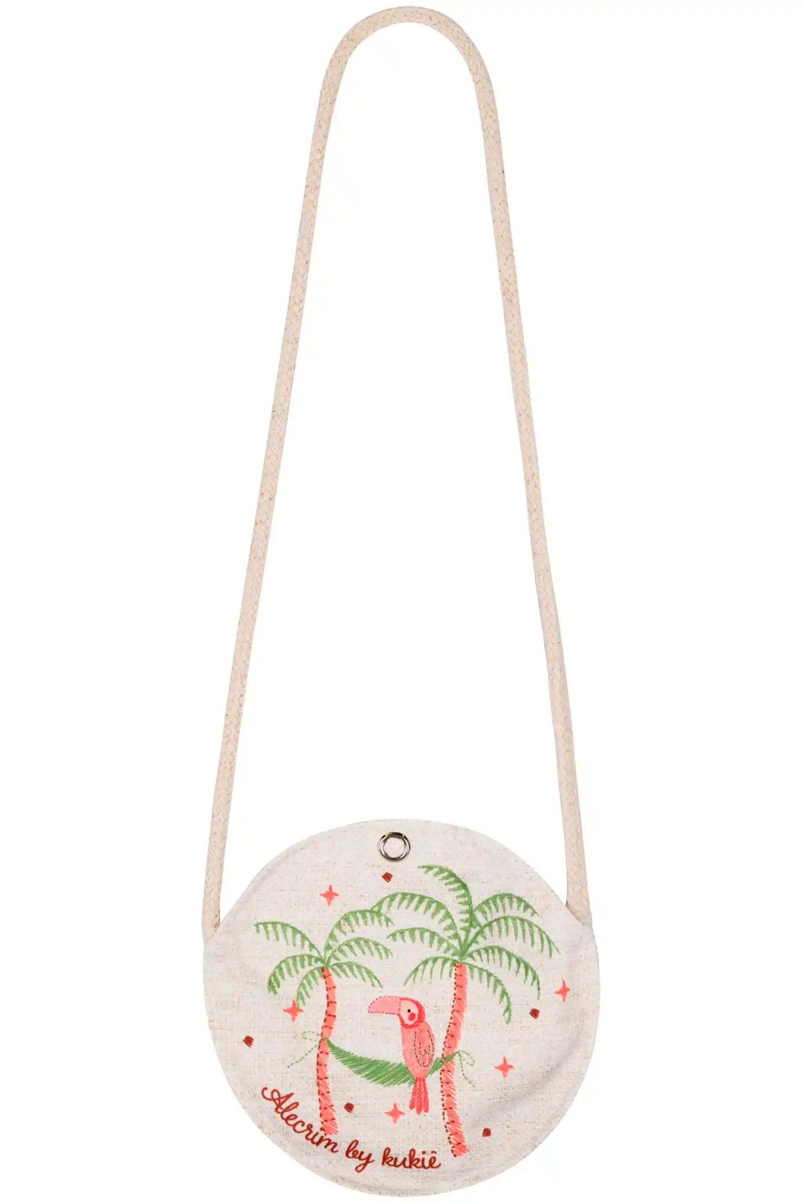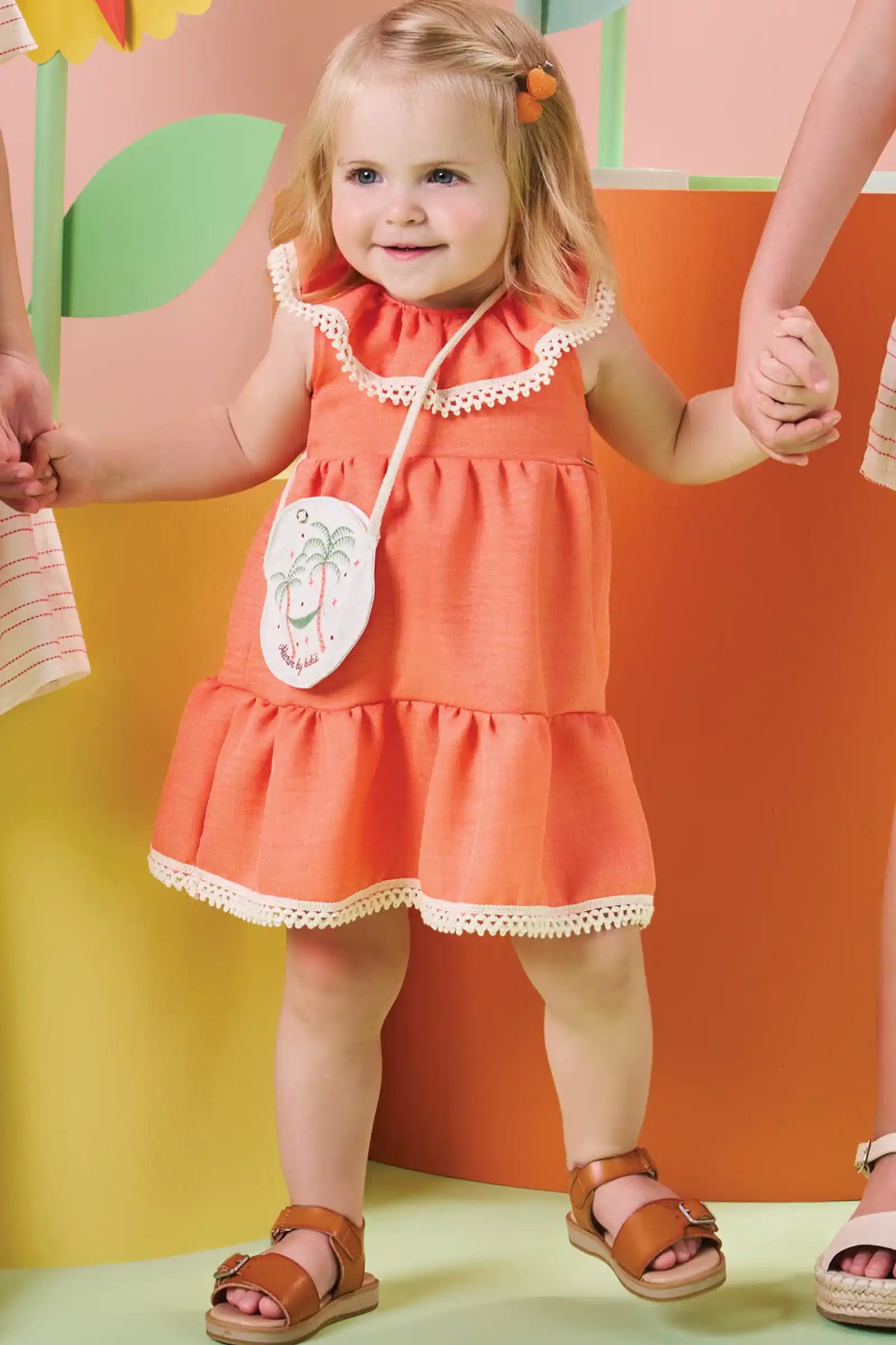 Incluye una cartera bandolera estampada con estilo tropical, perfecta para jugar y darle un toque aún más encantador al outfit. El vestido está confeccionado en un tejido suave, ligero y cómodo, ideal para que tu pequeña se mueva con libertad.