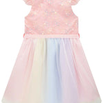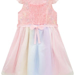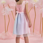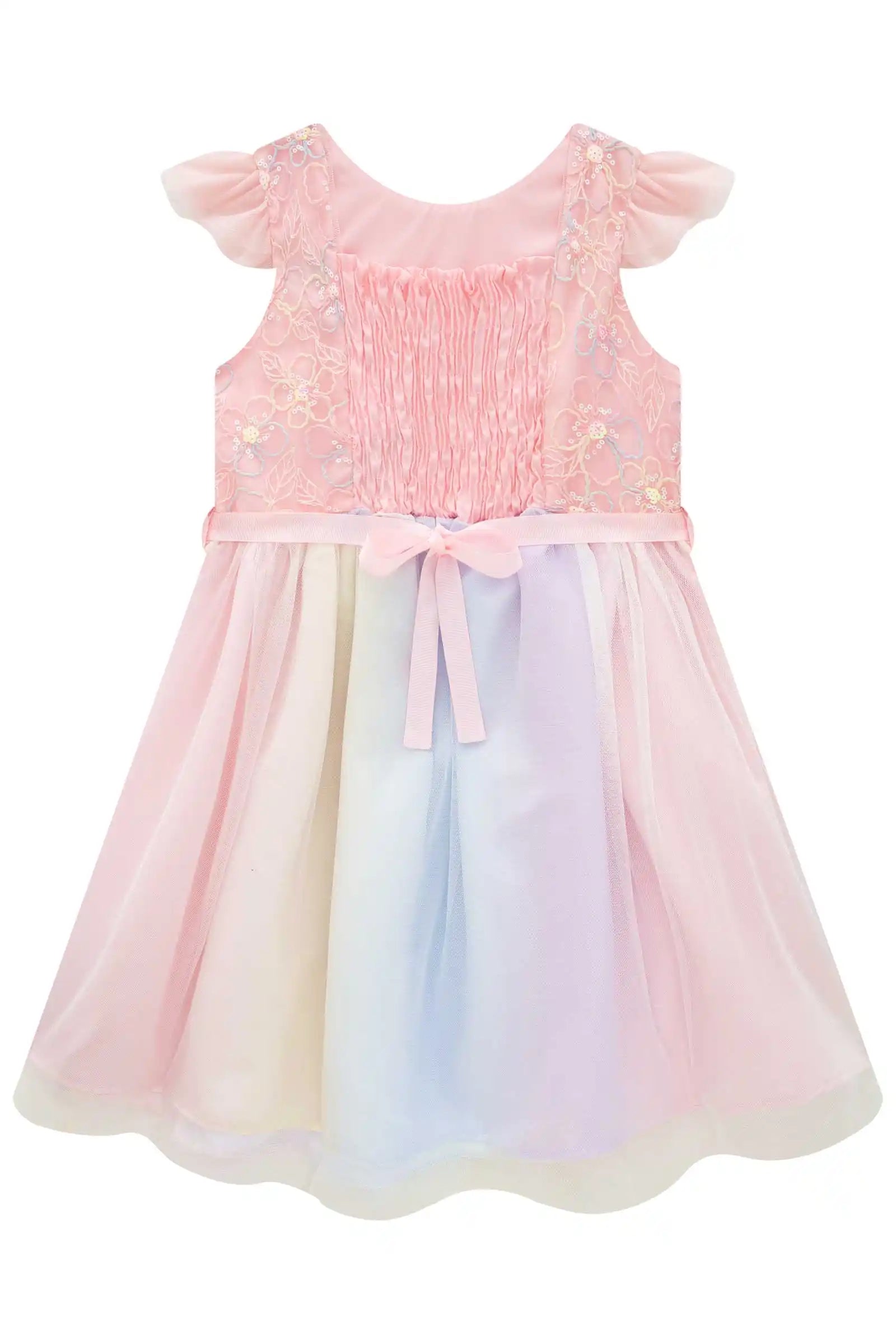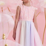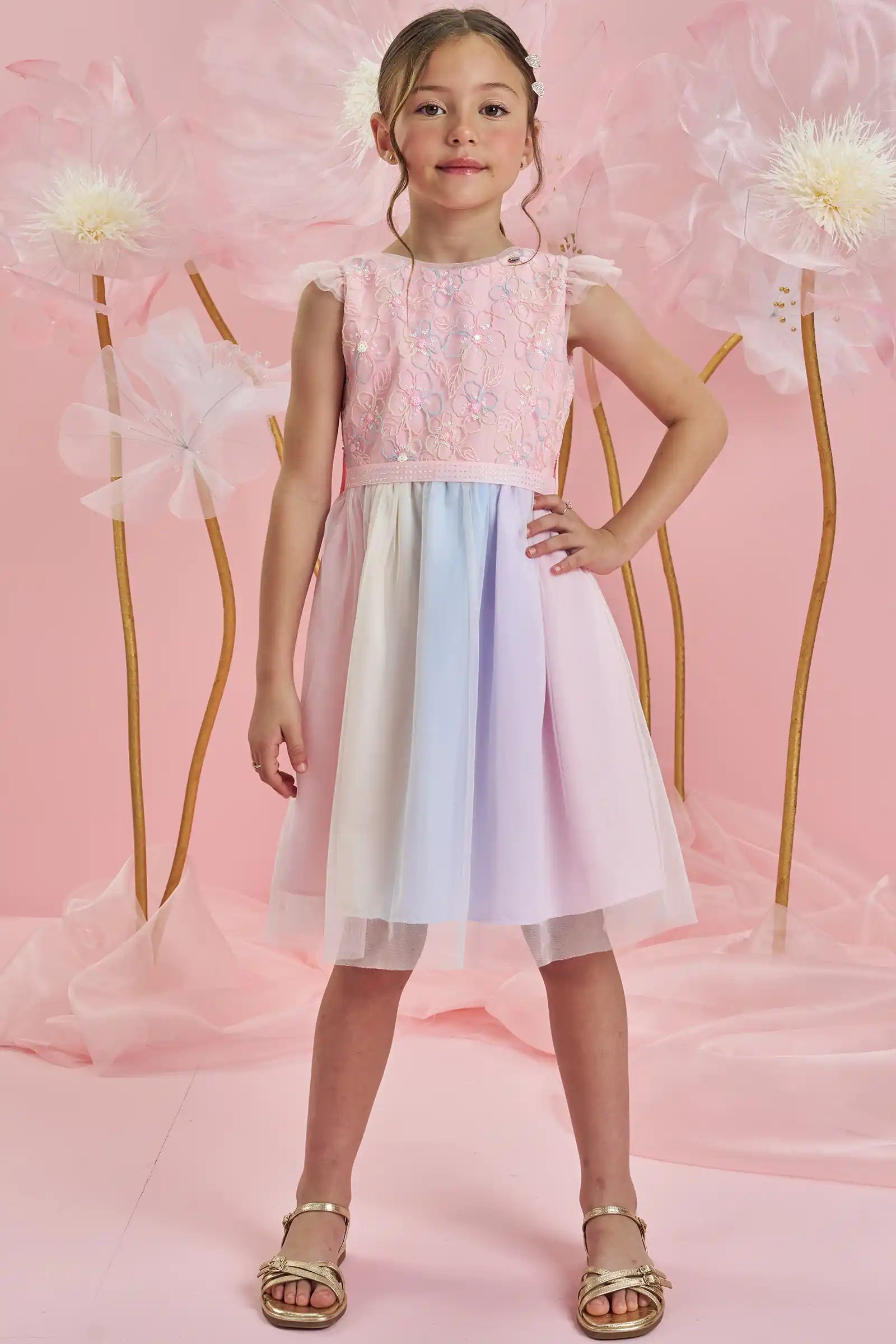 Un vestido mágico y delicado para las pequeñas que aman brillar. Este hermoso vestido de fiesta pastel para niña combina un corpiño rosa con bordados florales brillantes y una falda de tul multicolor en tonos suaves, creando un look encantador ideal para celebraciones, cumpleaños y ocasiones especiales.