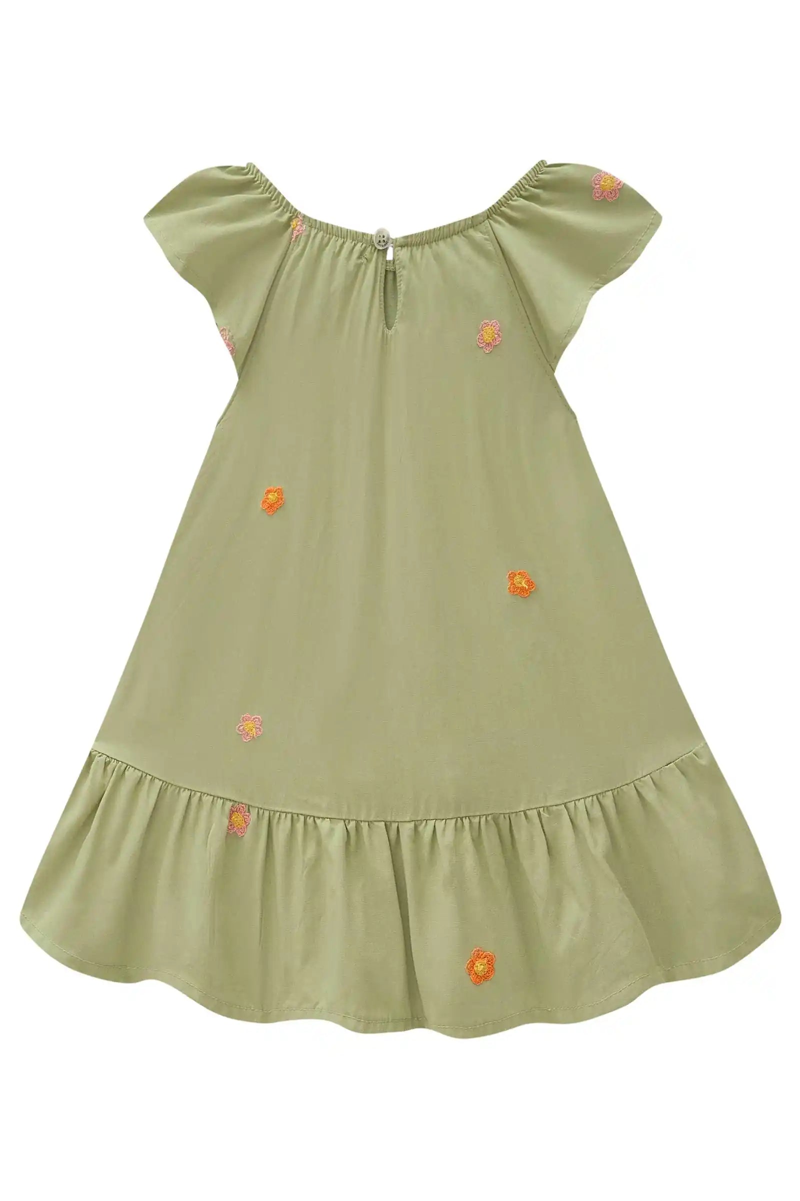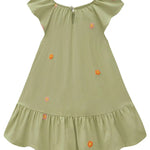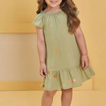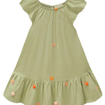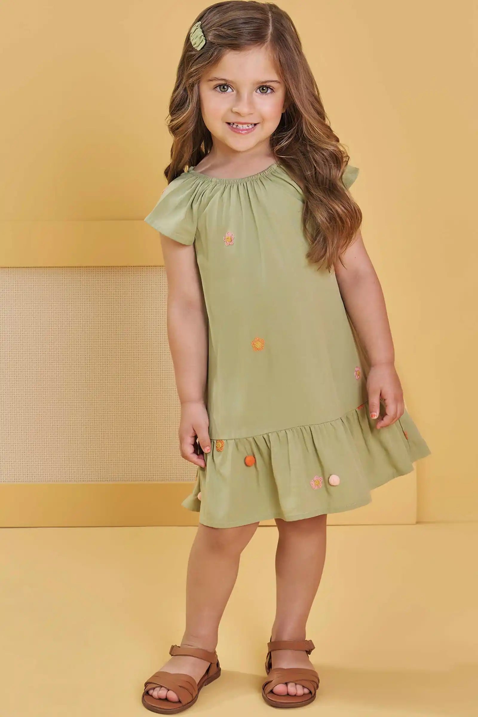 Este vestido verde para niña es ideal para el verano: ligero, fresco y lleno de movimiento. Su diseño incluye mangas con caída suave, volantes en el ruedo, y delicados bordados florales con pompones que le dan un toque tierno y elegante.