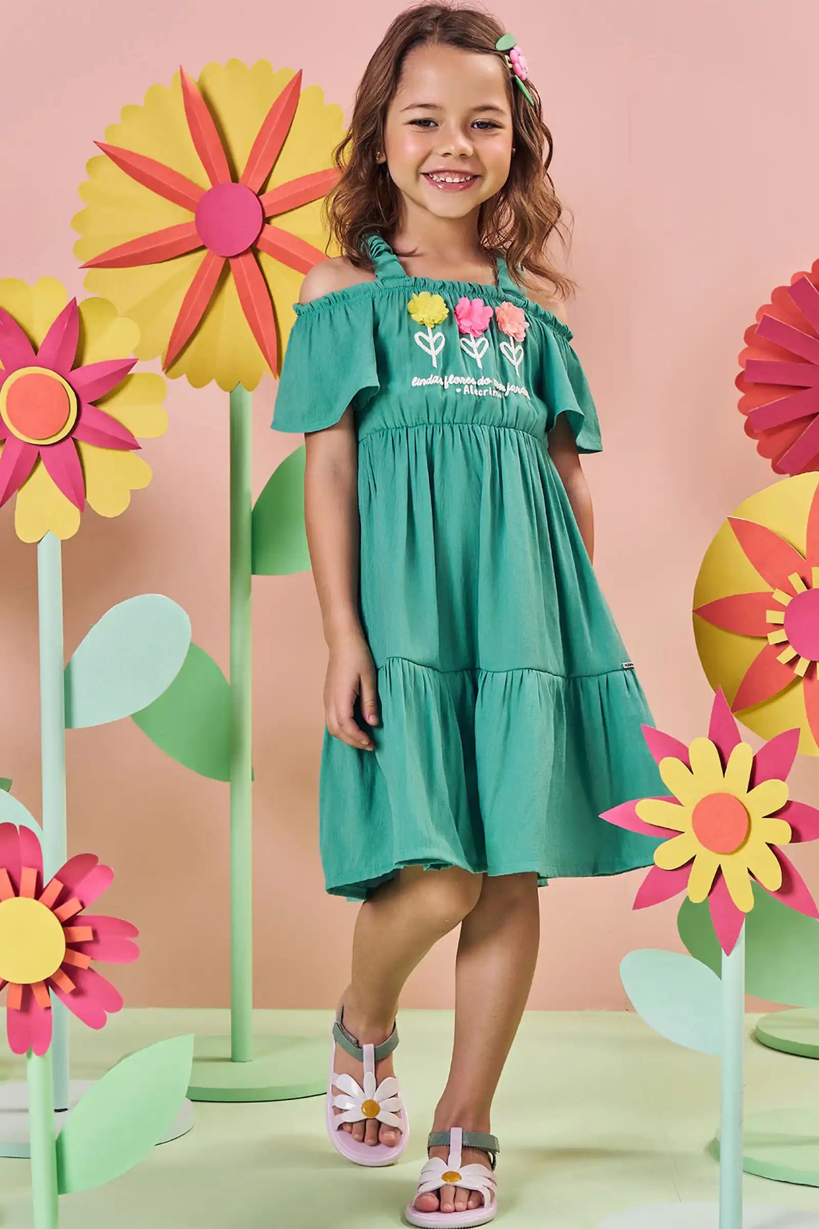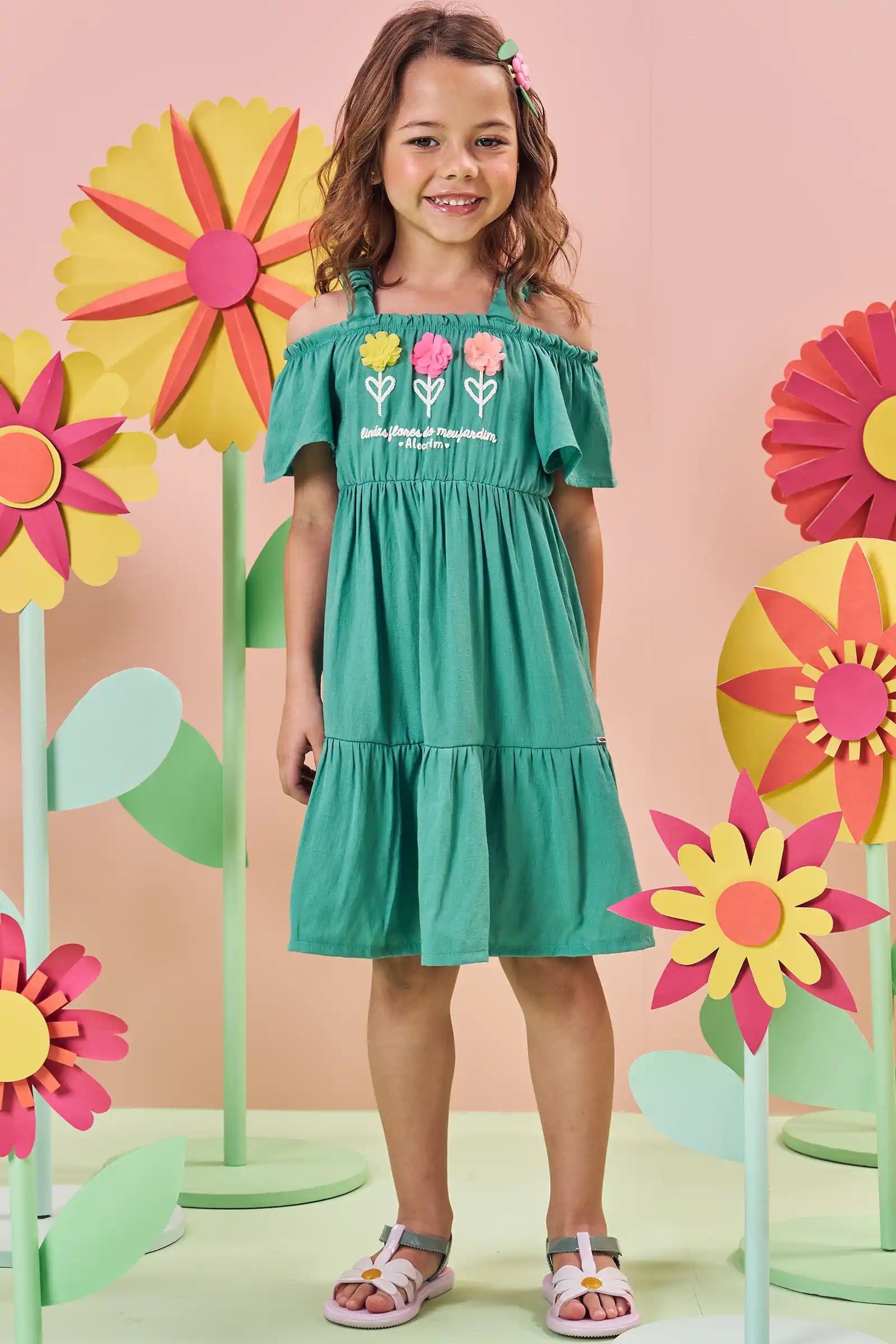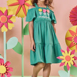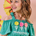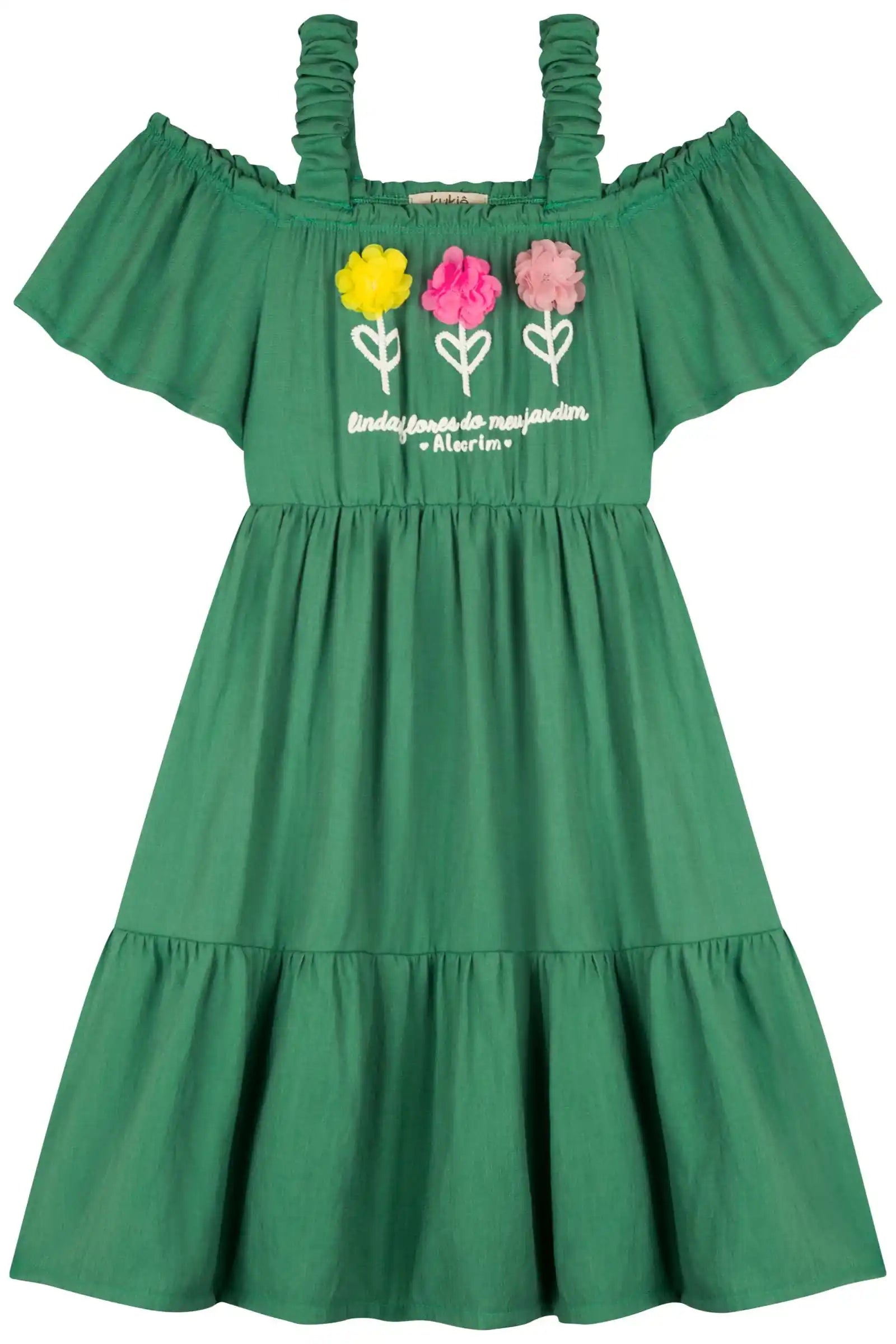 Descubre el encanto del Vestido Verde Flores 3D de Kukie, un diseño fresco y veraniego ideal para niñas de 4 a 10 años. Su estilo off shoulder con tirantes ruffle y sus apliques florales 3D en el pecho lo convierten en una prenda única, perfecta para días soleados, paseos y celebraciones informales.