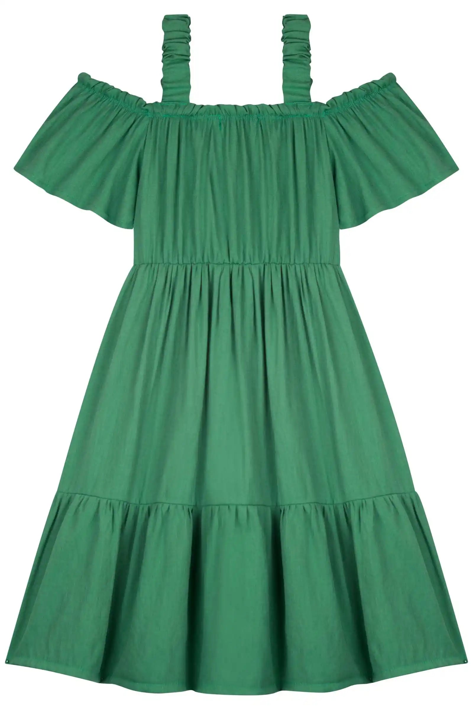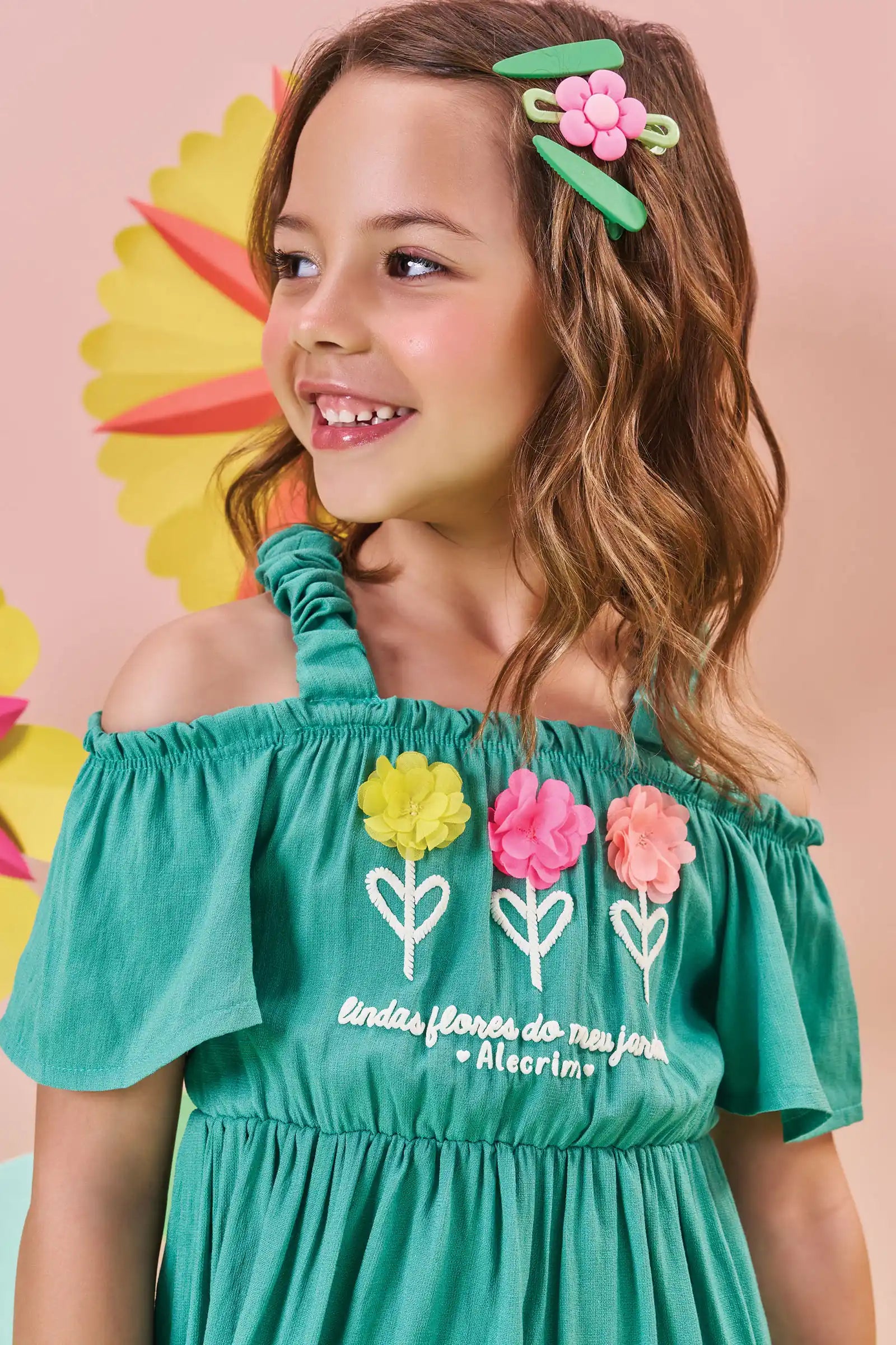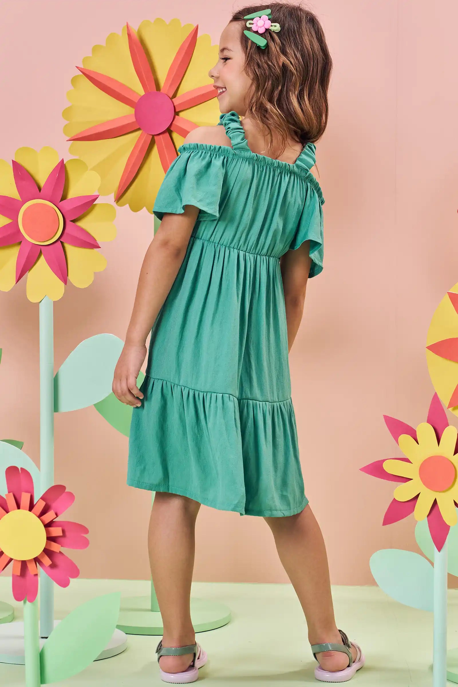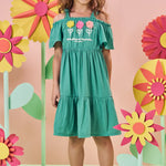 Descubre el encanto del Vestido Verde Flores 3D de Kukie, un diseño fresco y veraniego ideal para niñas de 4 a 10 años. Su estilo off shoulder con tirantes ruffle y sus apliques florales 3D en el pecho lo convierten en una prenda única, perfecta para días soleados, paseos y celebraciones informales.
