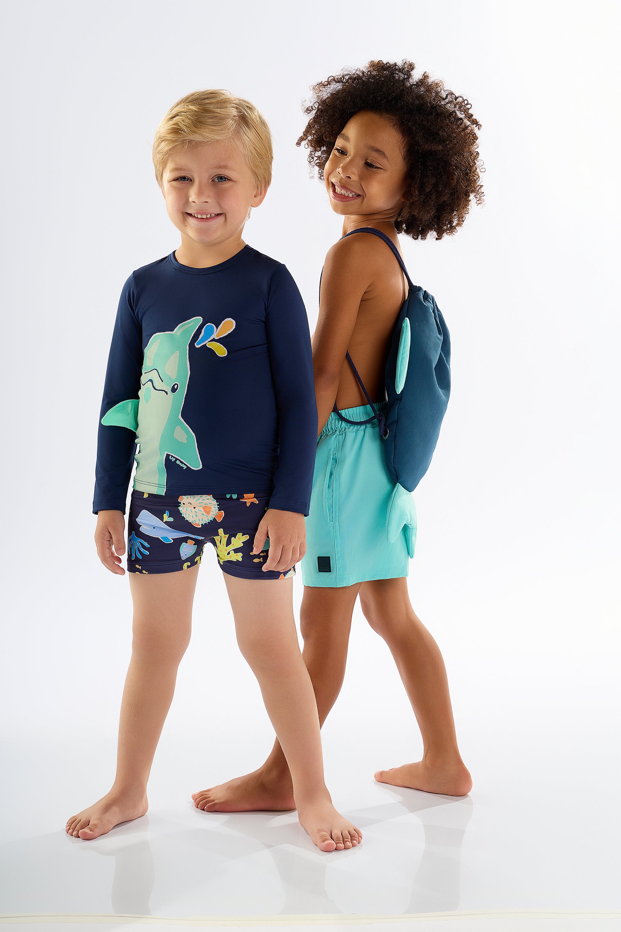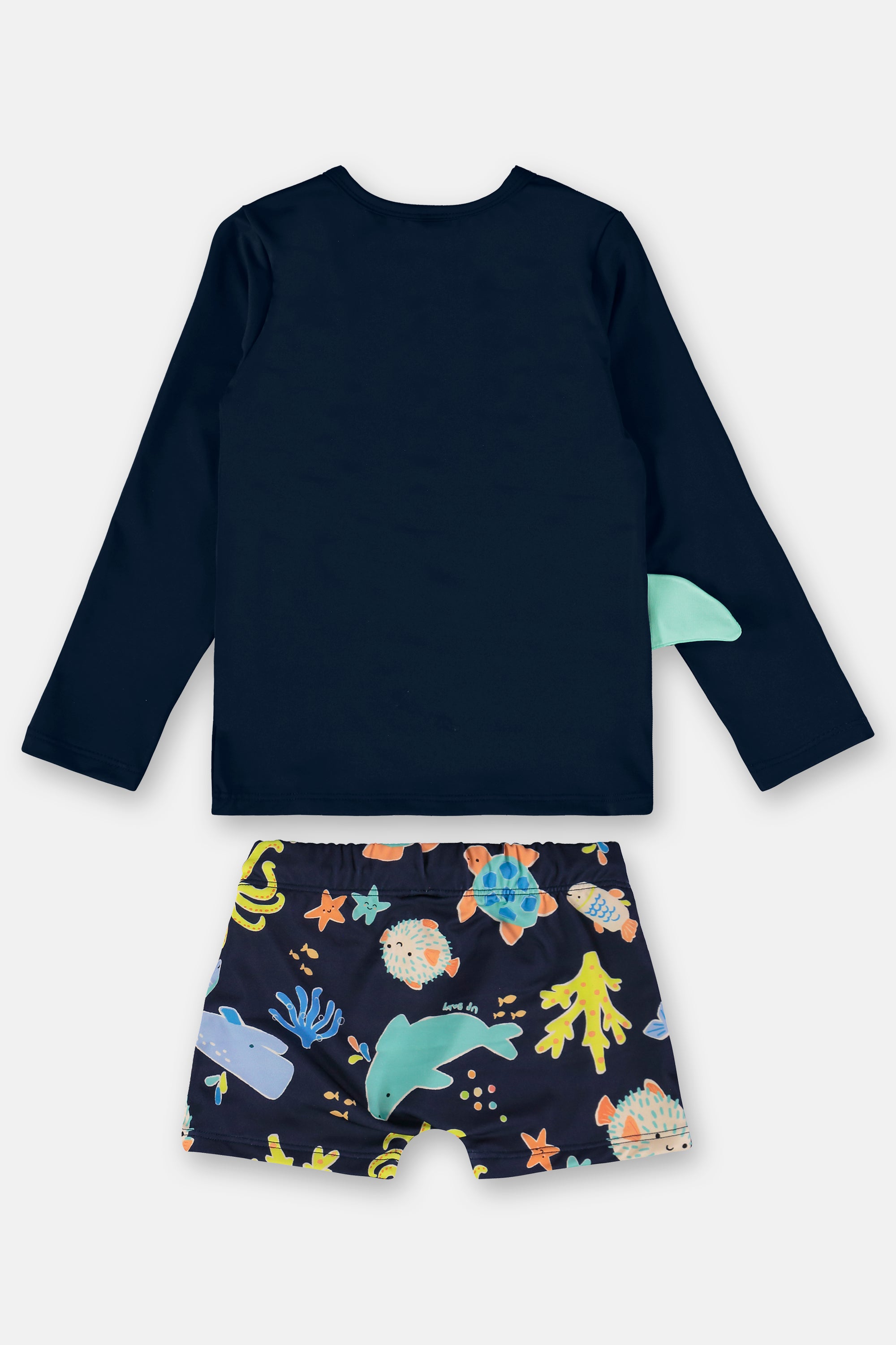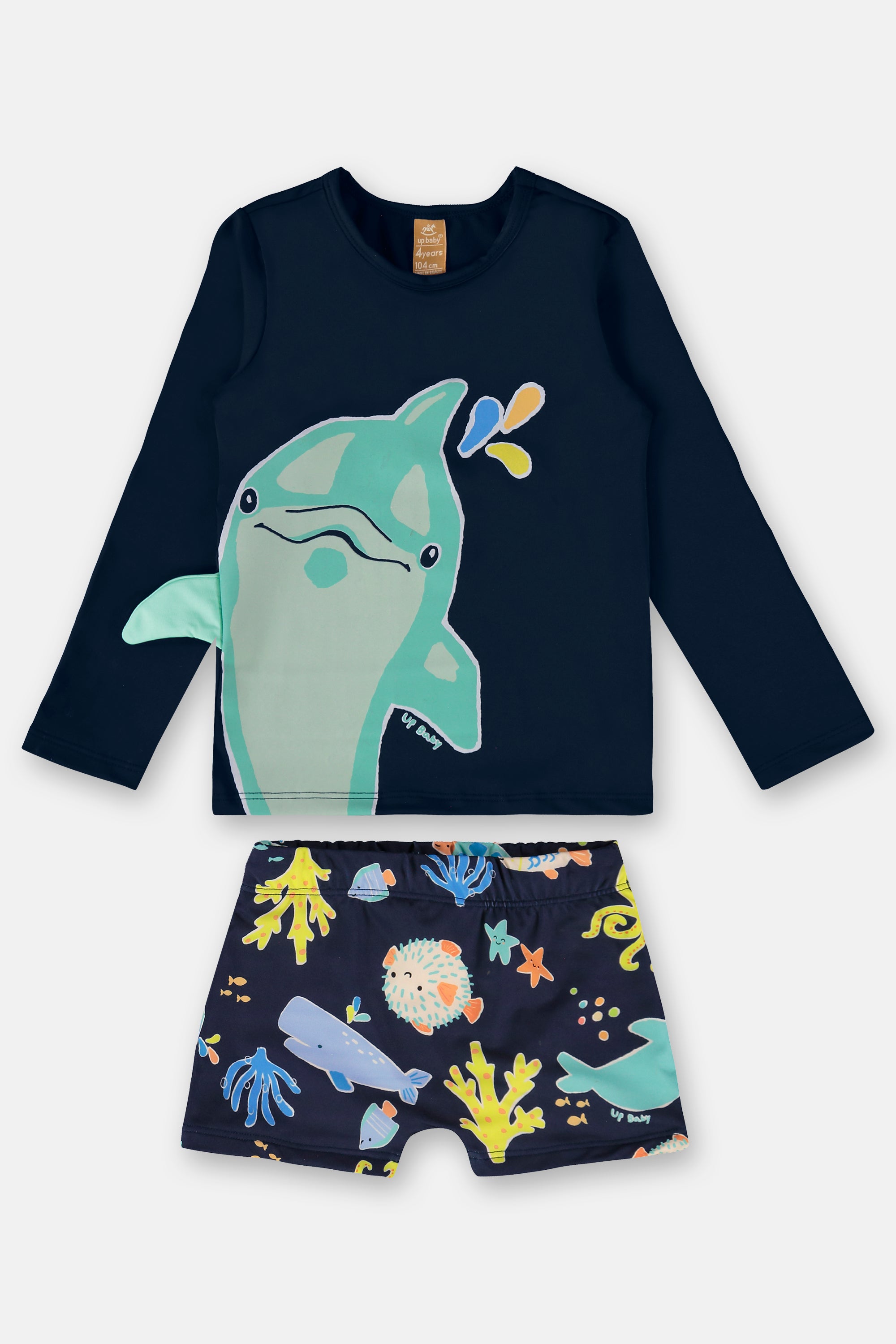 Conjunto de baño para niño con filtro solar UV50+, compuesto por polera manga larga azul marino con diseño de delfín y short estampado con motivos marinos. Confección brasileña de alta calidad, tela de secado rápido y tacto suave. Ideal para proteger la piel del sol con comodidad y estilo en la playa o piscina.