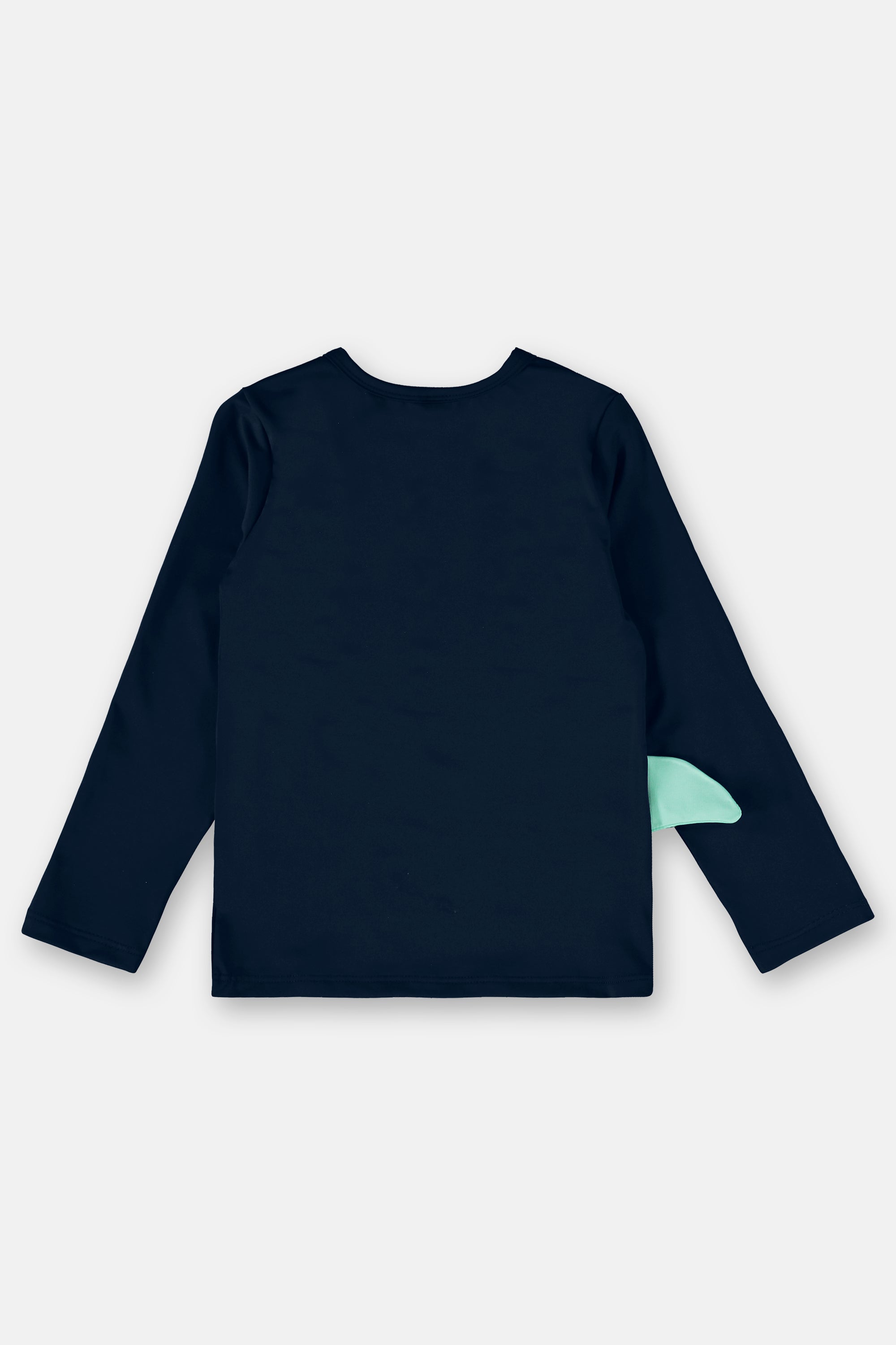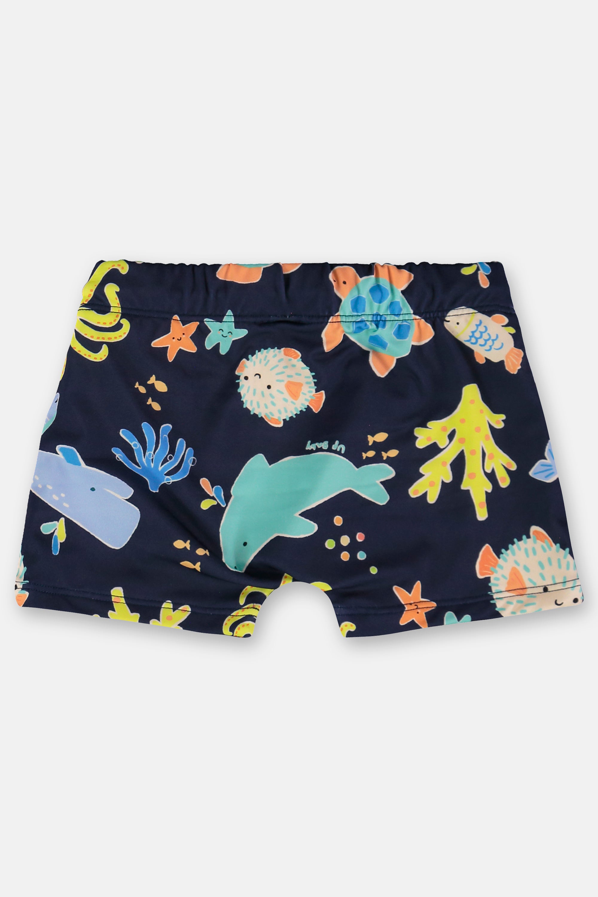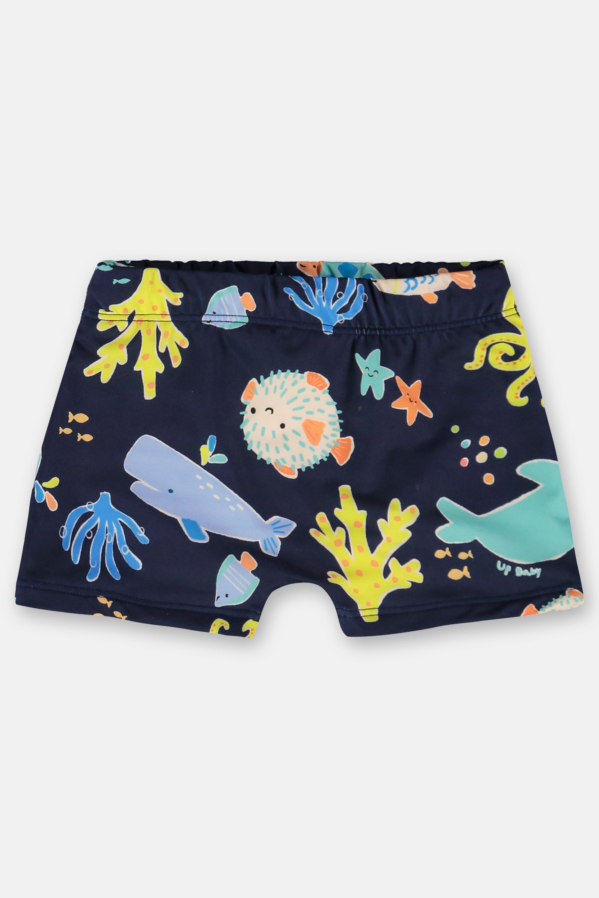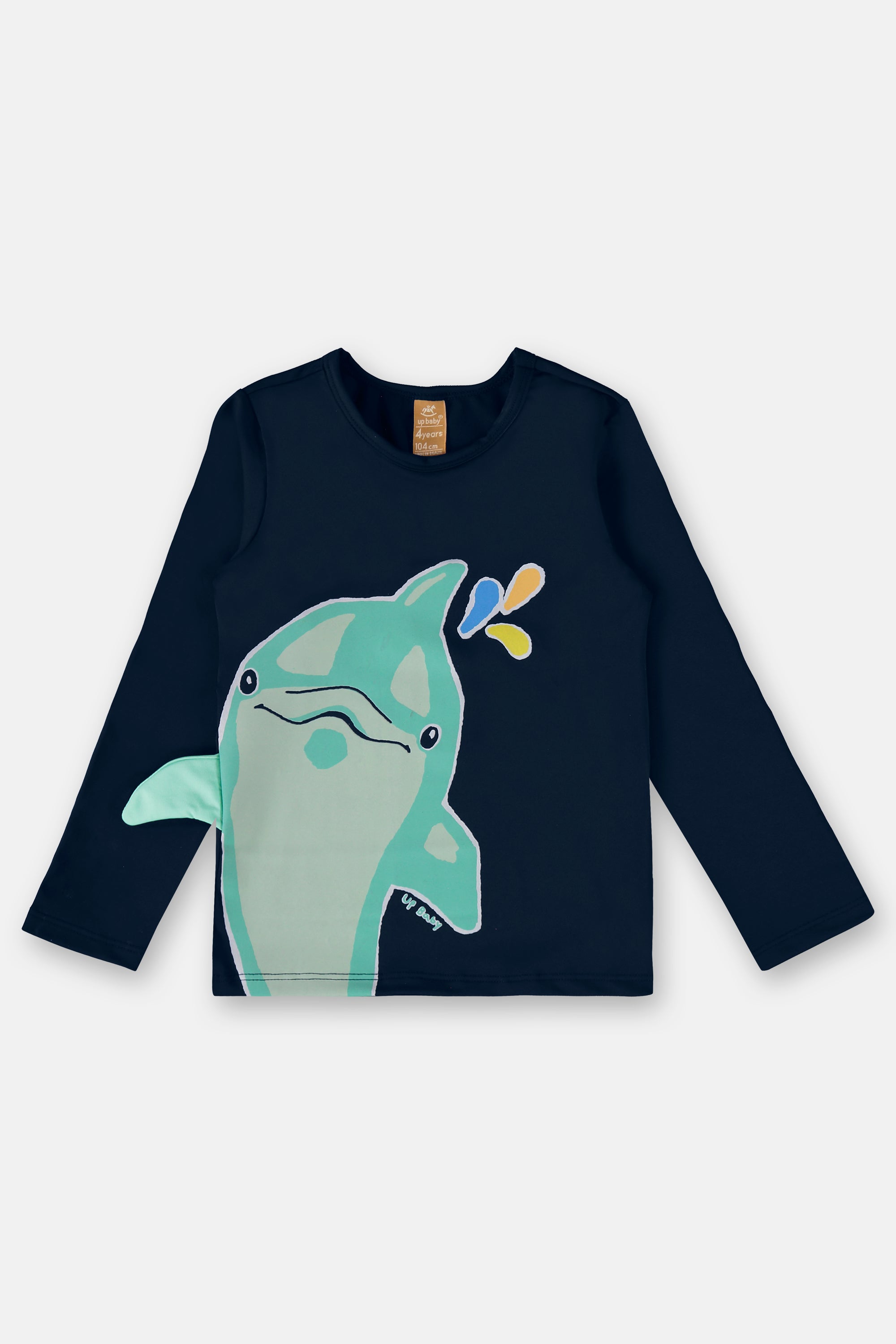 Conjunto de baño para niño con filtro solar UV50+, compuesto por polera manga larga azul marino con diseño de delfín y short estampado con motivos marinos. Confección brasileña de alta calidad, tela de secado rápido y tacto suave. Ideal para proteger la piel del sol con comodidad y estilo en la playa o piscina.