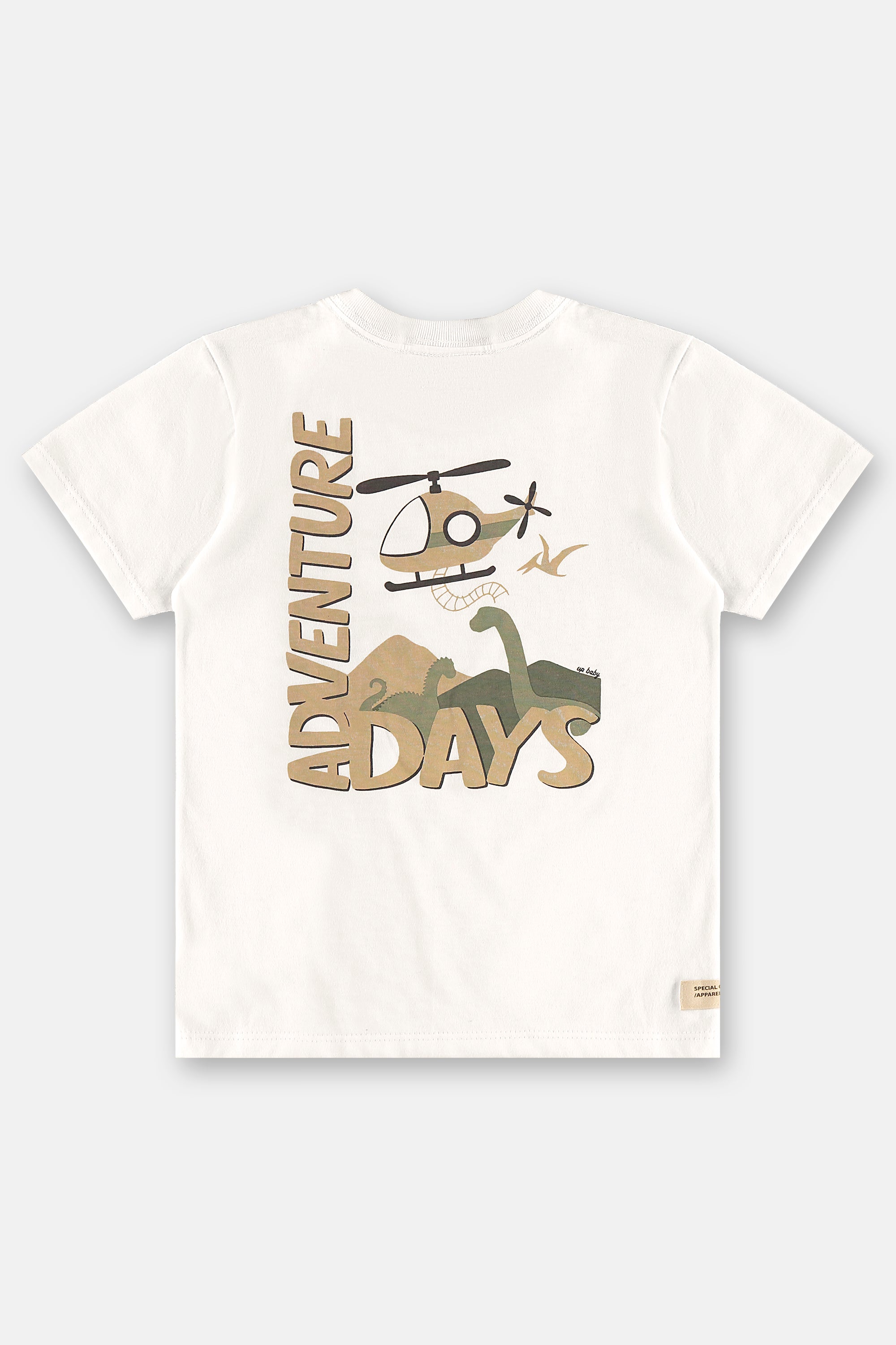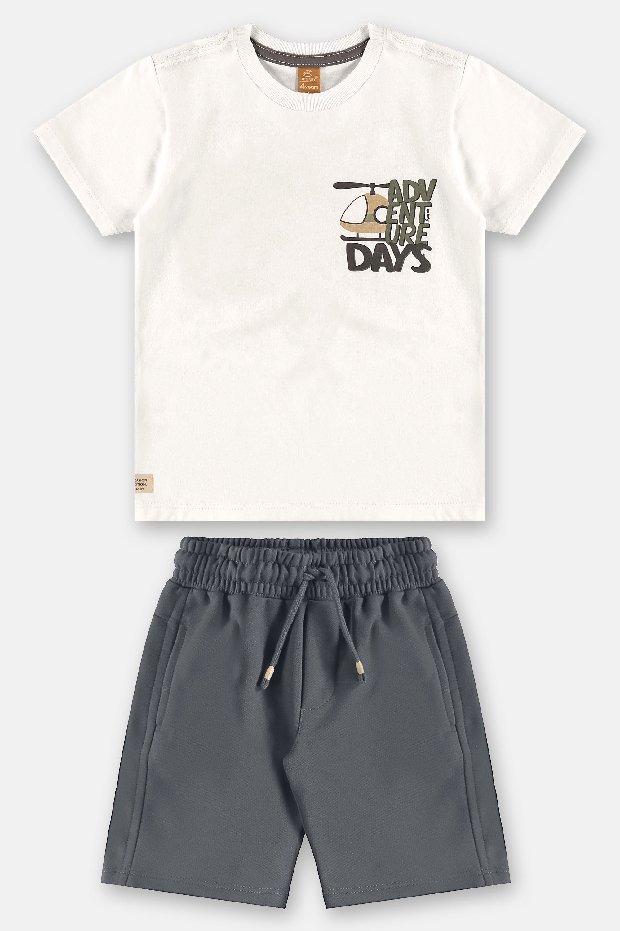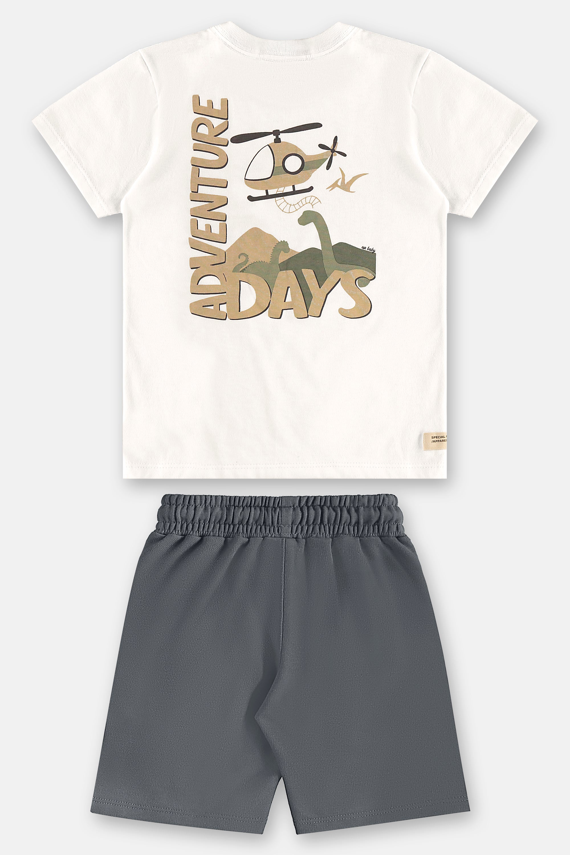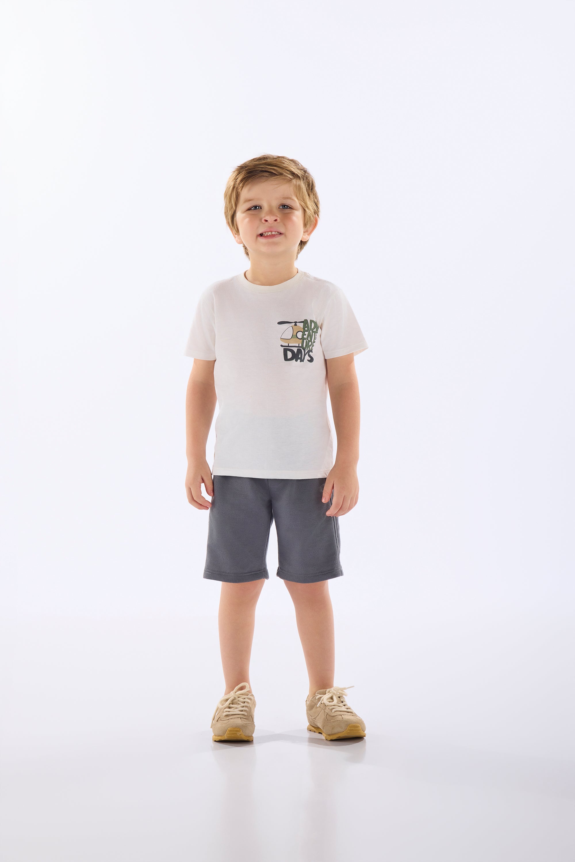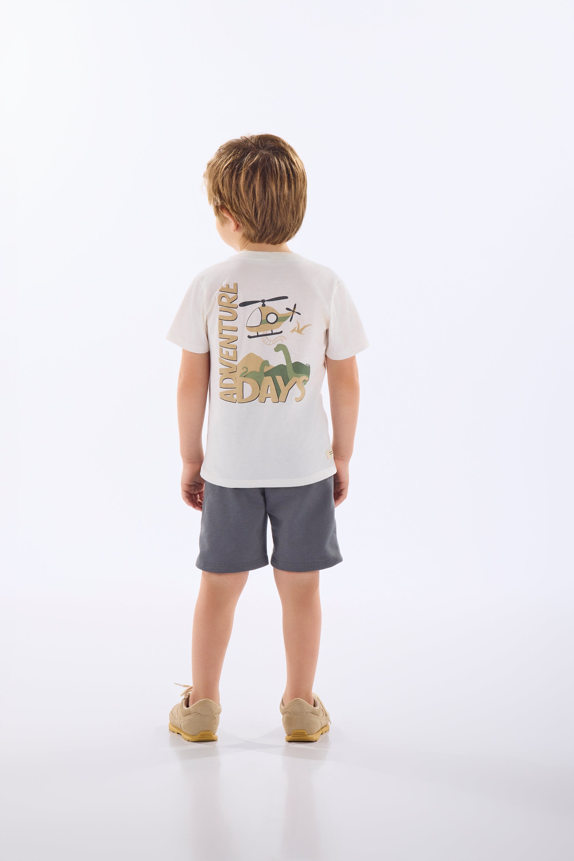 El Conjunto Niño Adventure Days Blanco y Gris es ideal para los pequeños exploradores que buscan comodidad y estilo en cada aventura. Incluye una polera blanca de manga corta con estampado frontal y trasero de helicóptero y dinosaurios, acompañado de la frase “Adventure Days”, que inspira diversión y movimiento. El short gris oscuro complementa el conjunto con un diseño sencillo y práctico.