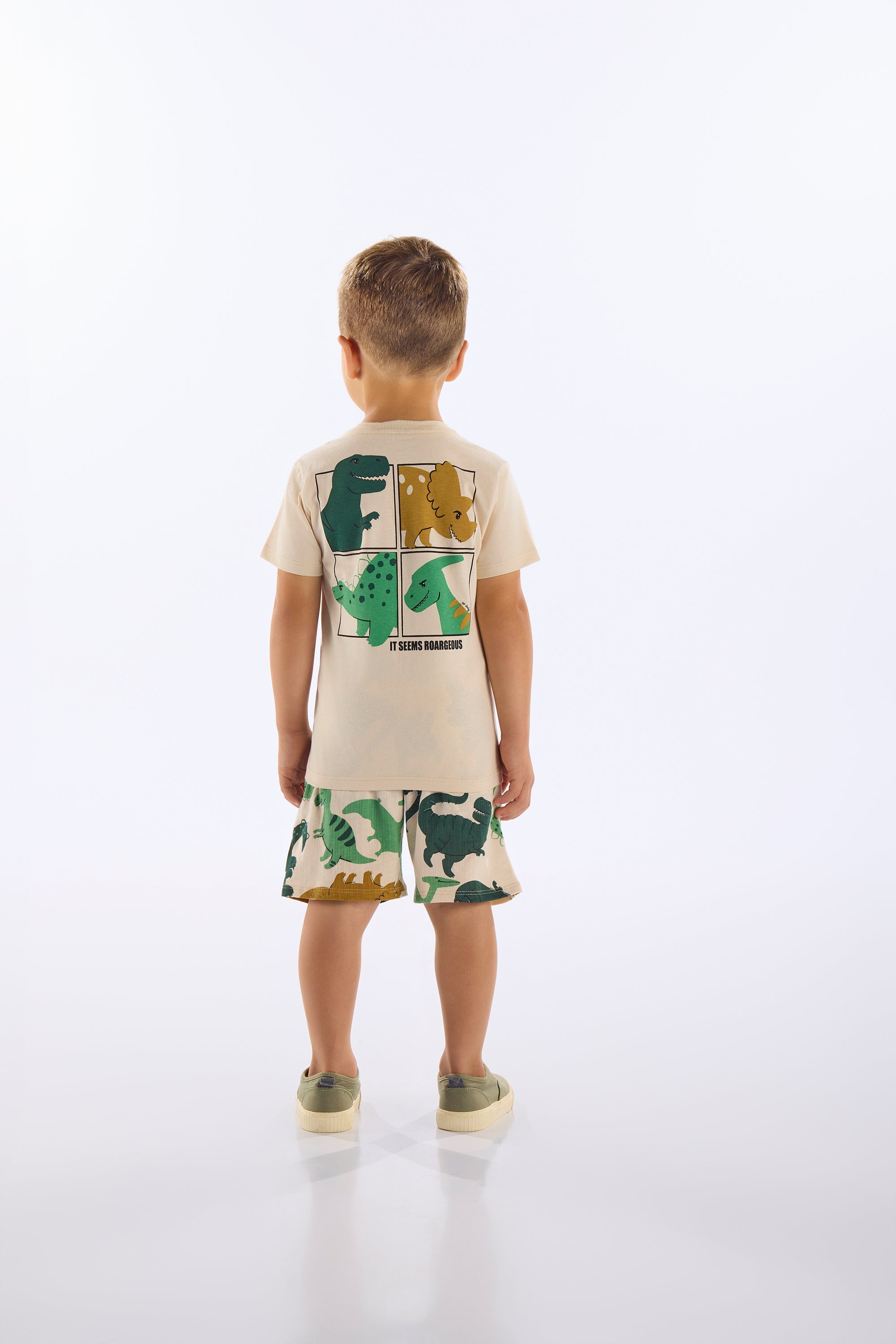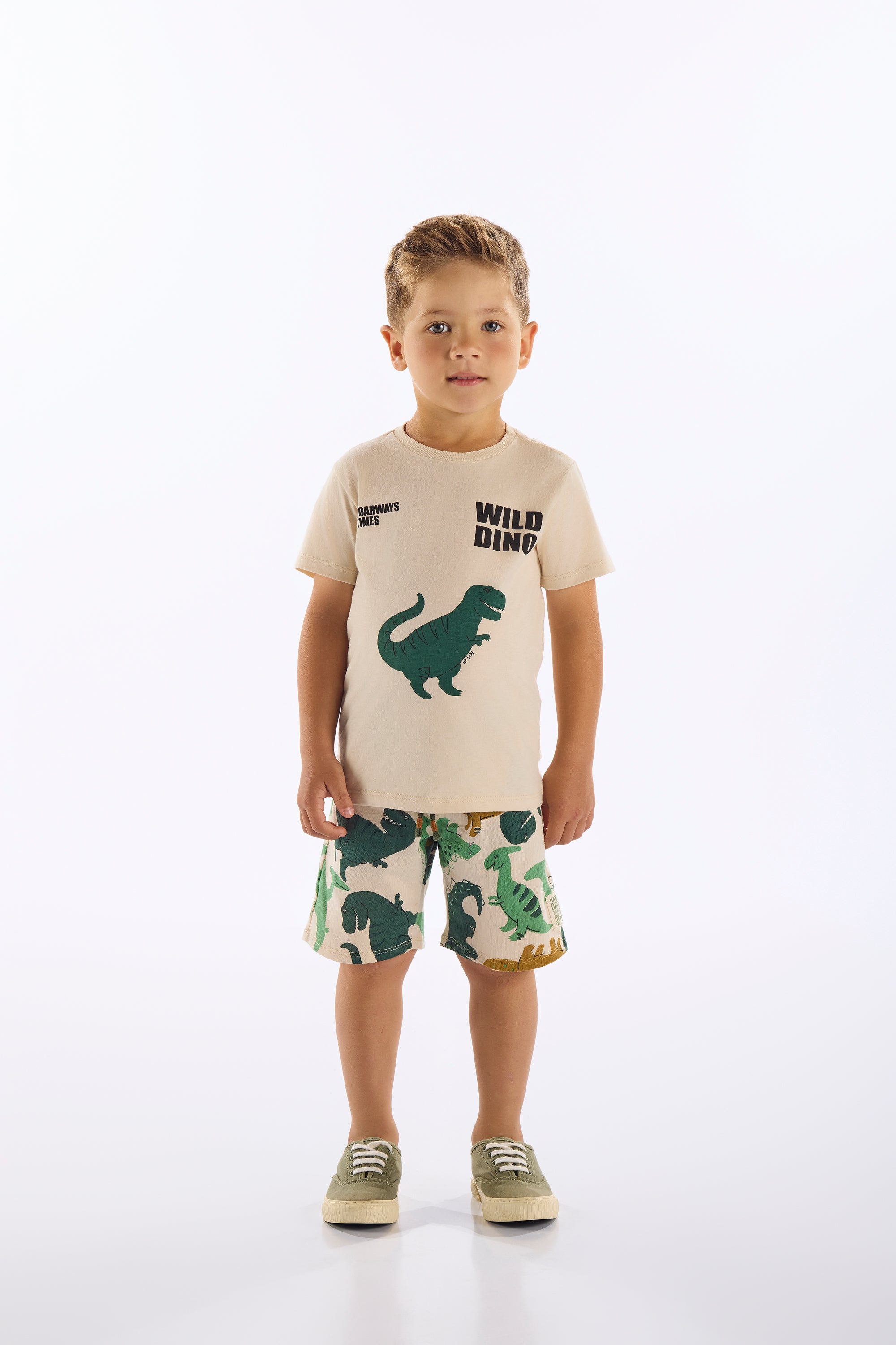 El Conjunto Niño Wild Dino Beige es perfecto para los pequeños aventureros que aman los dinosaurios. Incluye una polera de manga corta en tono beige con un estampado frontal de T-Rex y gráficos en la parte trasera que aportan un look moderno y divertido. El short a juego está cubierto de dinosaurios en tonos verdes y tierra, logrando un estilo coordinado ideal para esta temporada.