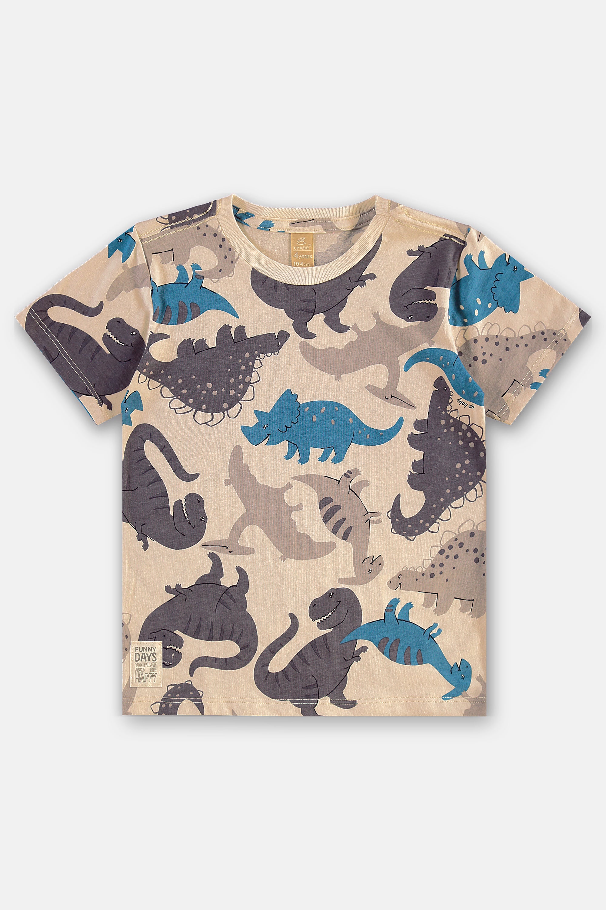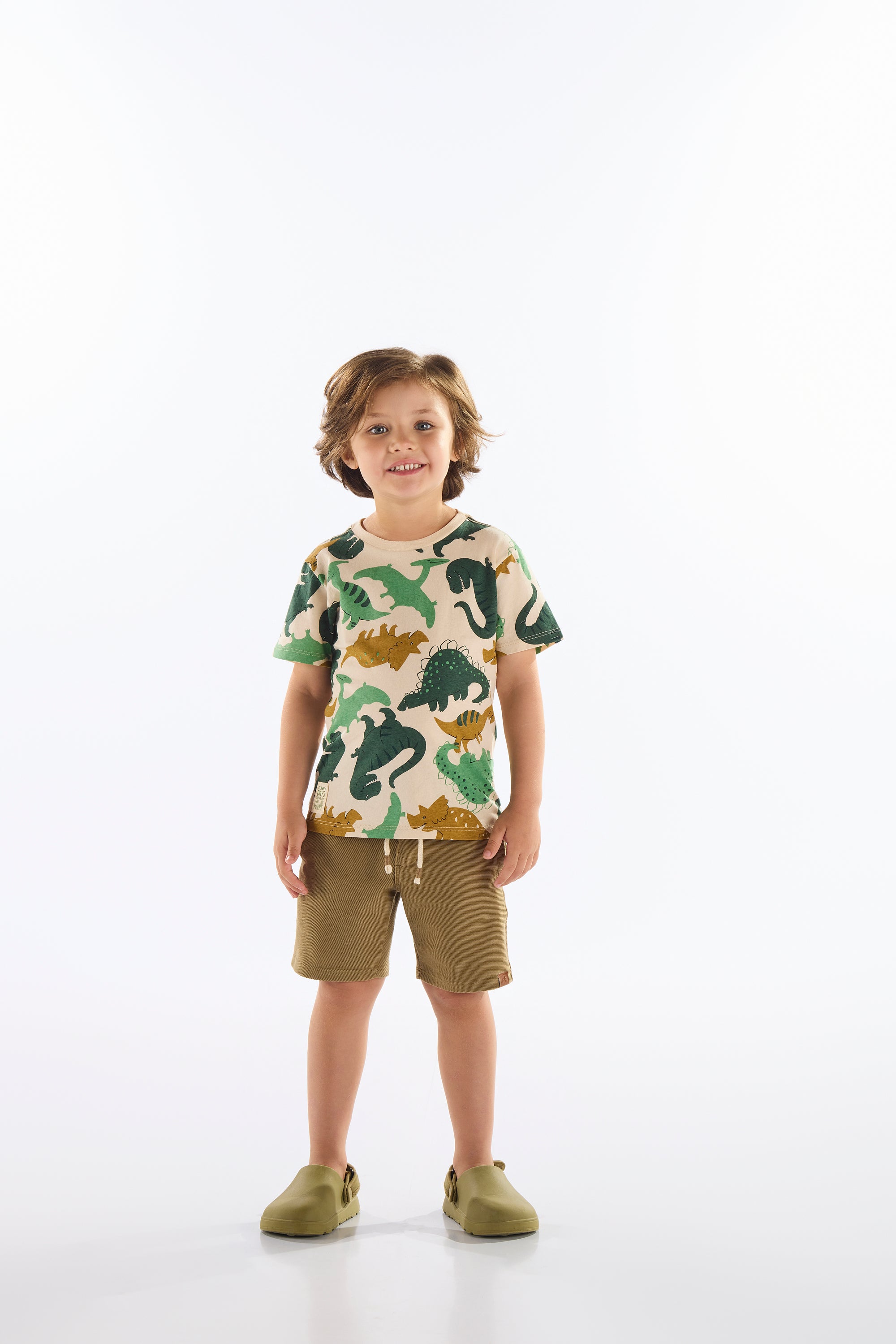 El diseño presenta un divertido estampado de dinosaurios que aporta alegría y energía a cualquier look, convirtiéndola en una prenda versátil para usar en paseos, juegos o actividades escolares. Su tela ligera y respirable garantiza frescura en los días de calor, mientras que su confección resistente asegura una gran durabilidad, incluso después de muchos lavados.