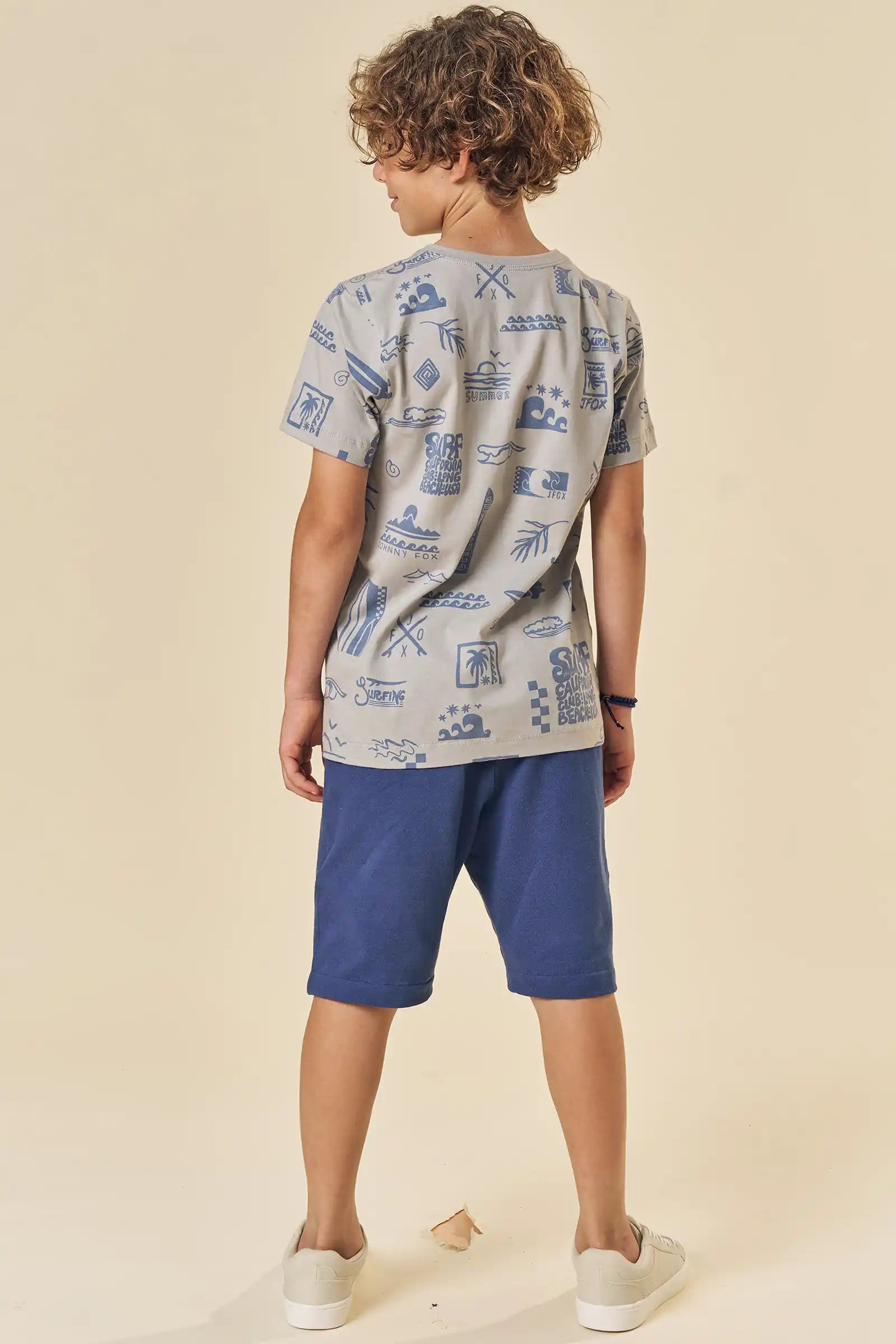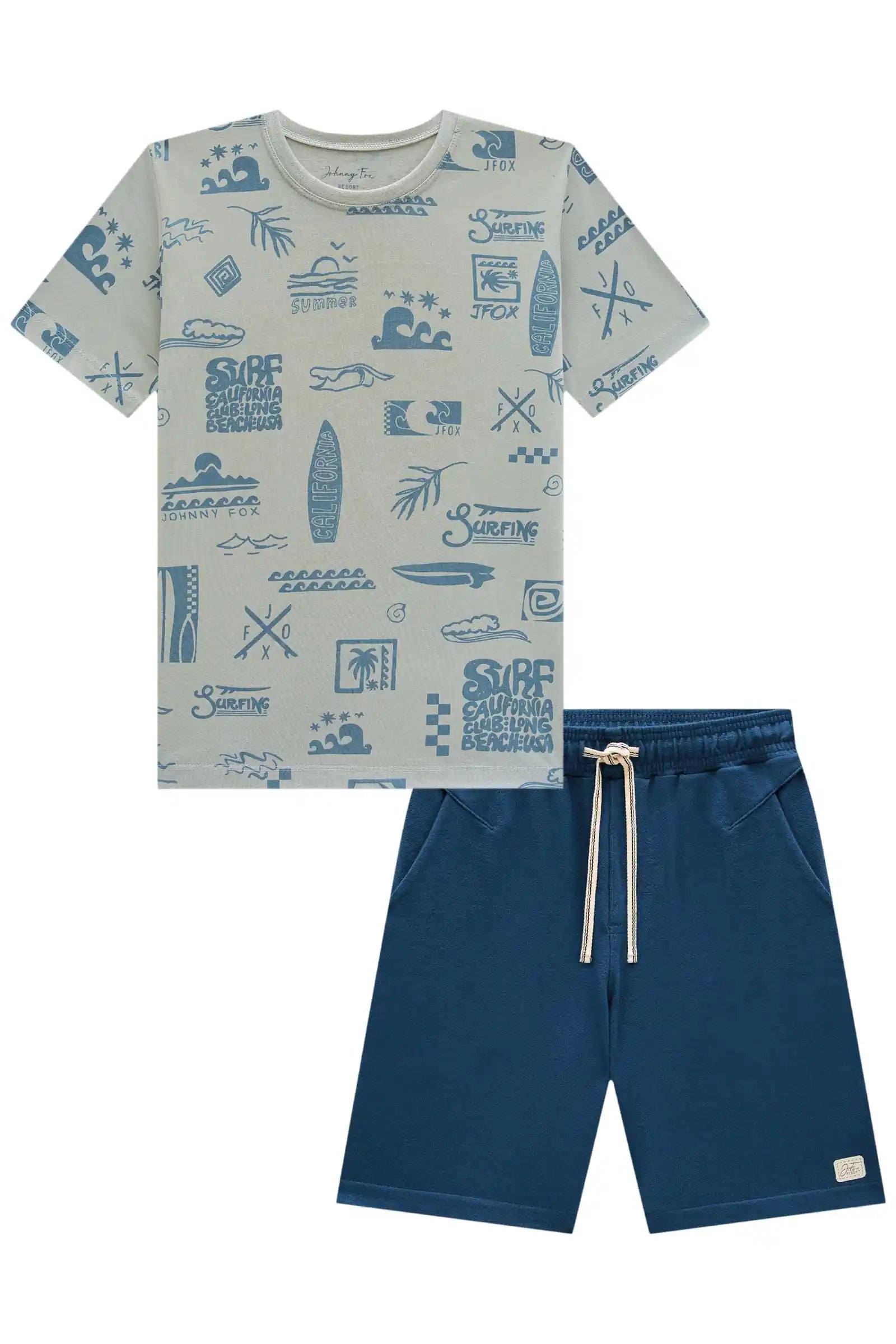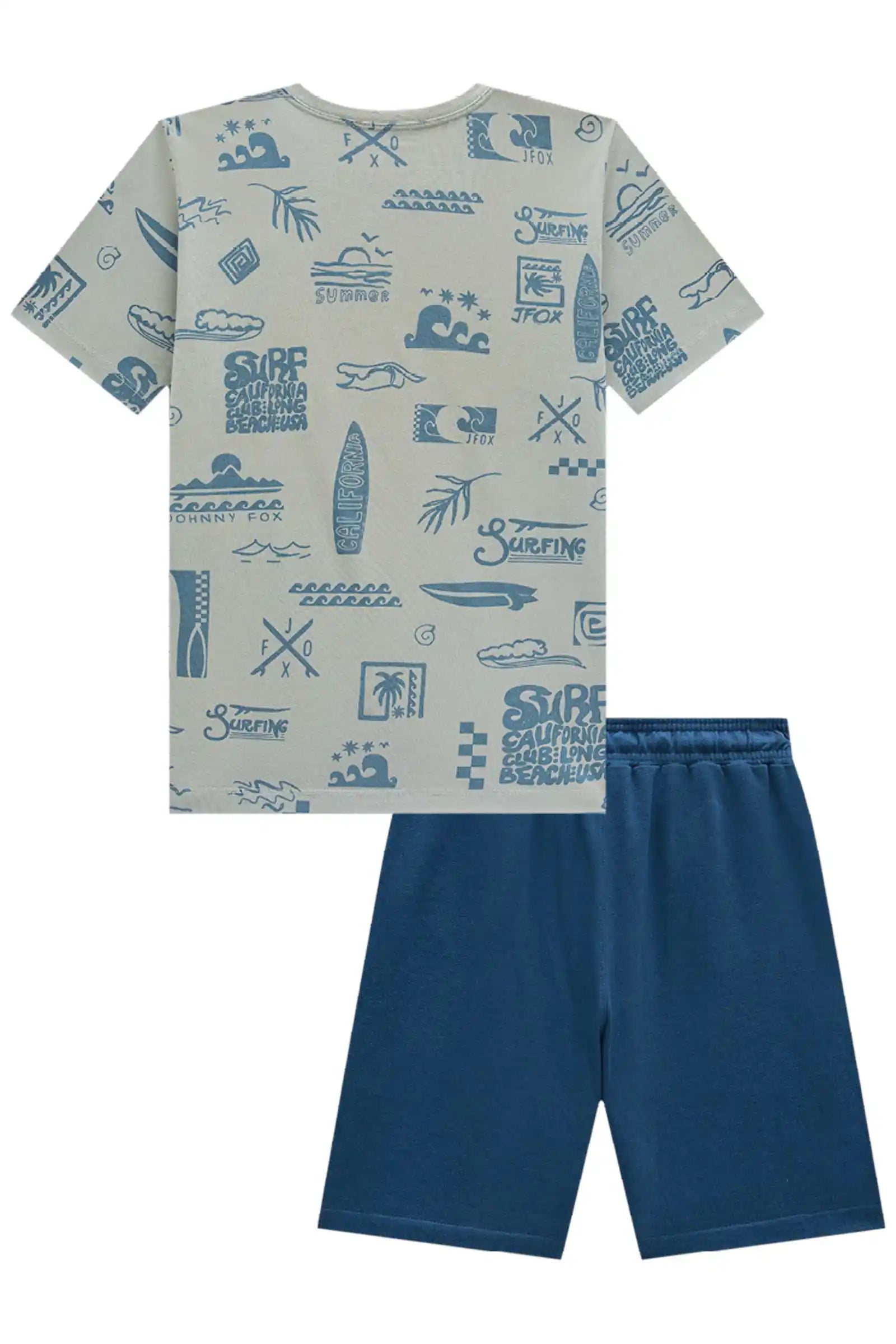 Este conjunto para niño Johnny Fox trae todo el estilo veraniego inspirado en California. La polera 100% algodón destaca por su estampado full surf con tablas, olas y palmeras, ideal para niños activos que aman la aventura. El short azul marino, suave y cómodo, cuenta con pretina elástica y cordón ajustable para un calce perfecto durante todo el día.