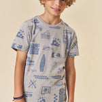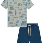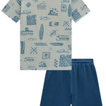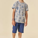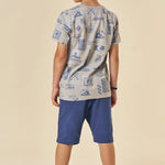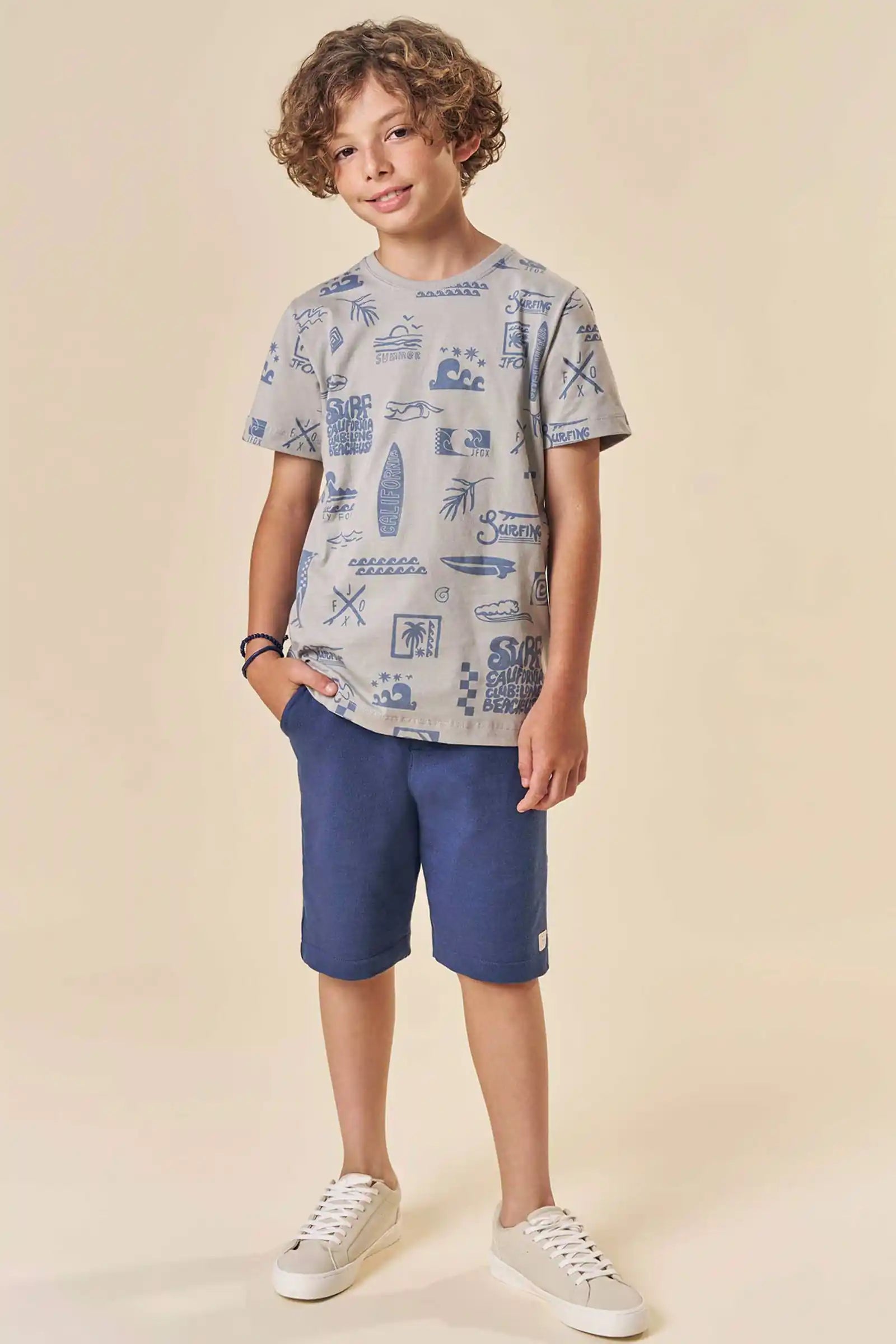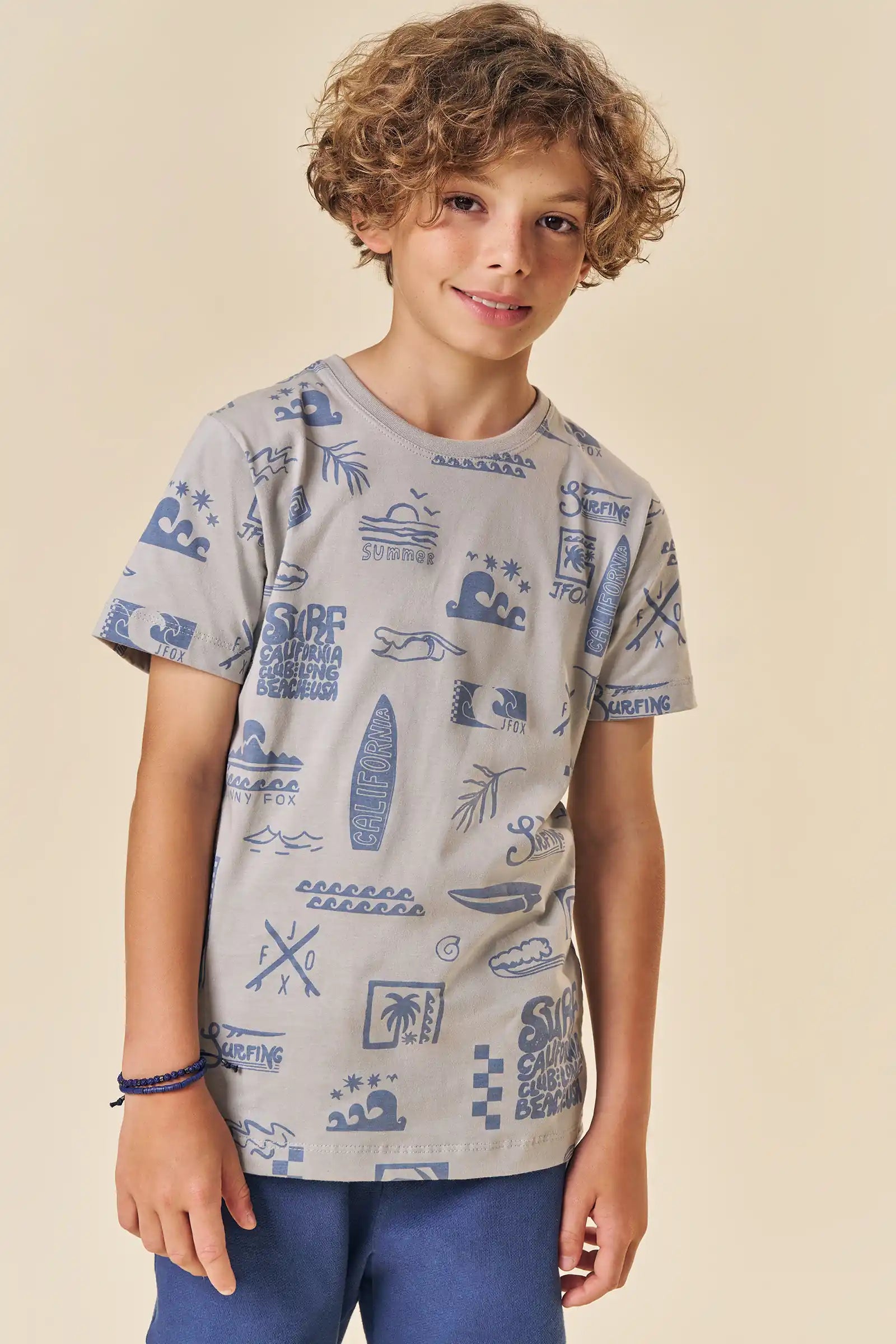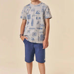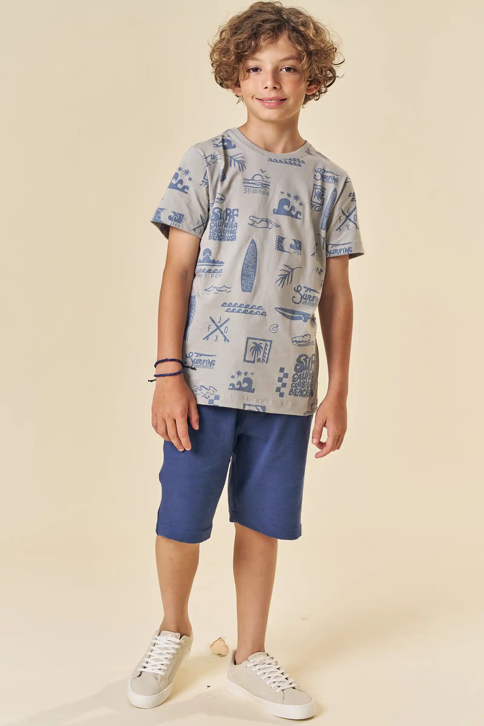 Este conjunto para niño Johnny Fox trae todo el estilo veraniego inspirado en California. La polera 100% algodón destaca por su estampado full surf con tablas, olas y palmeras, ideal para niños activos que aman la aventura. El short azul marino, suave y cómodo, cuenta con pretina elástica y cordón ajustable para un calce perfecto durante todo el día.