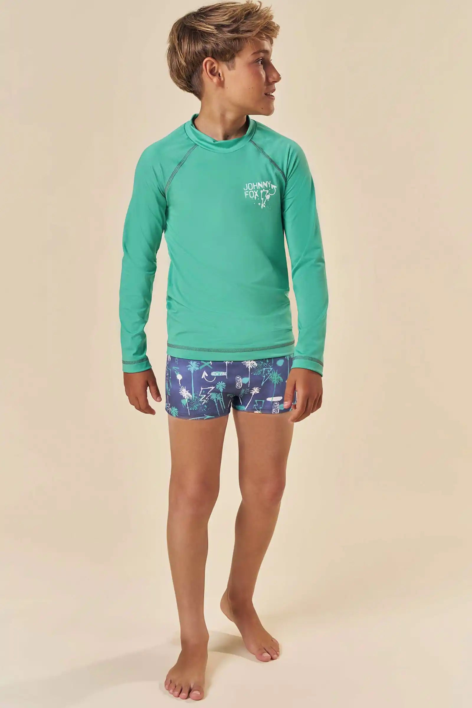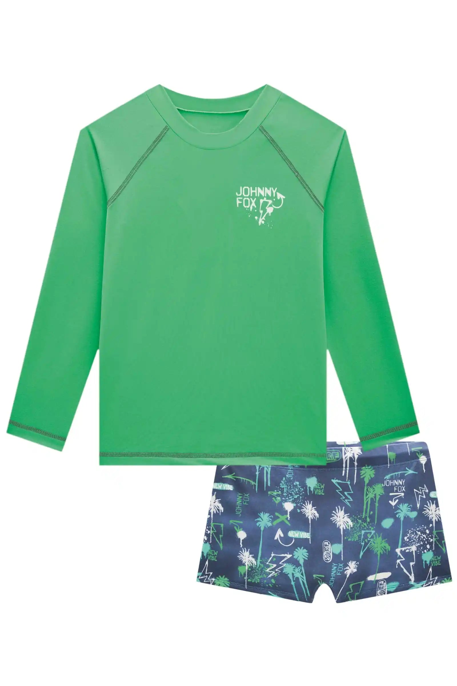 Este conjunto de traje de baño Johnny Fox combina estilo, comodidad y protección para los días de playa o piscina. Incluye una polera manga larga con protección UV50+ en tono verde agua, suave y de secado rápido, ideal para cuidar la piel mientras juegan bajo el sol.