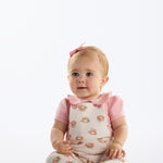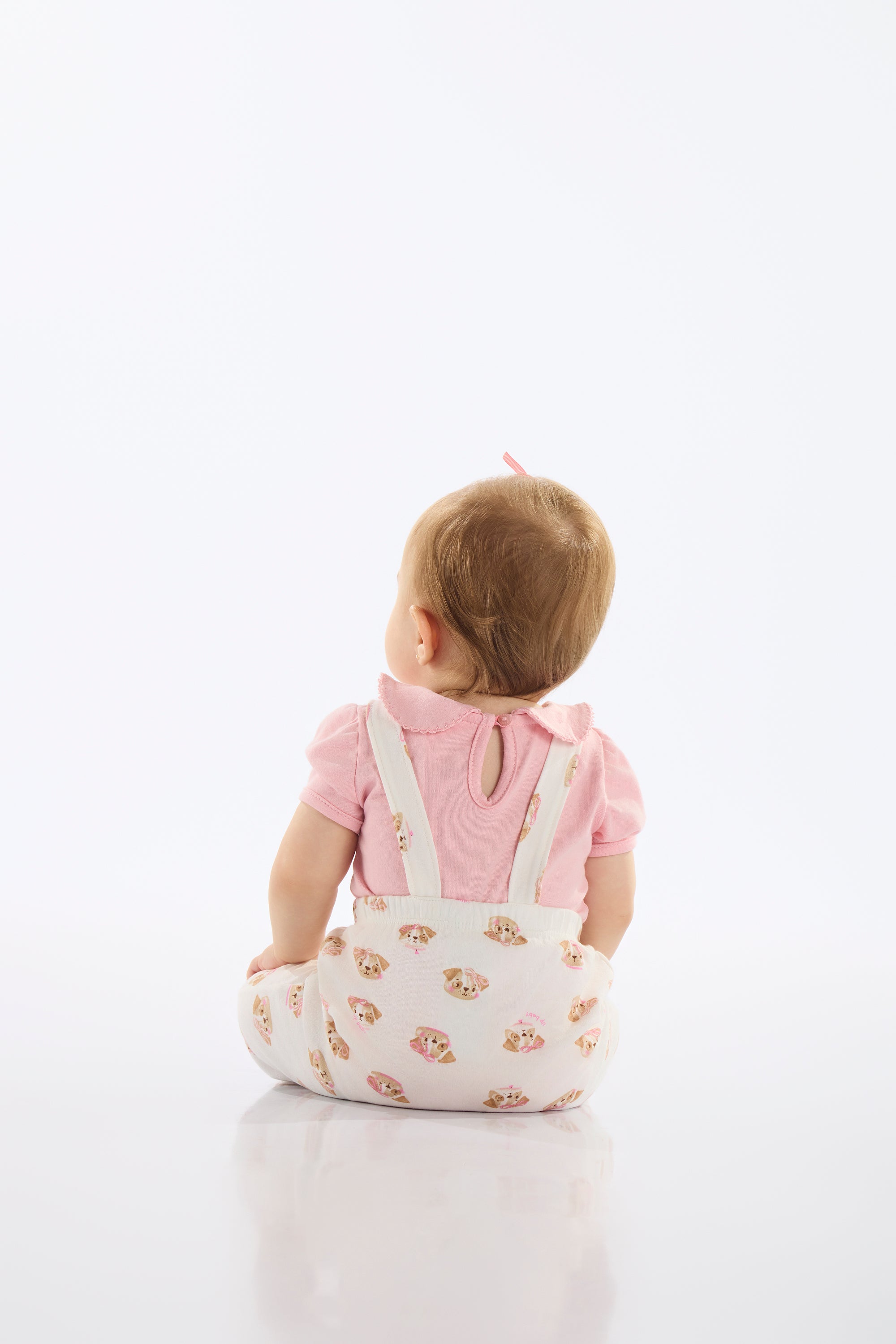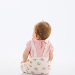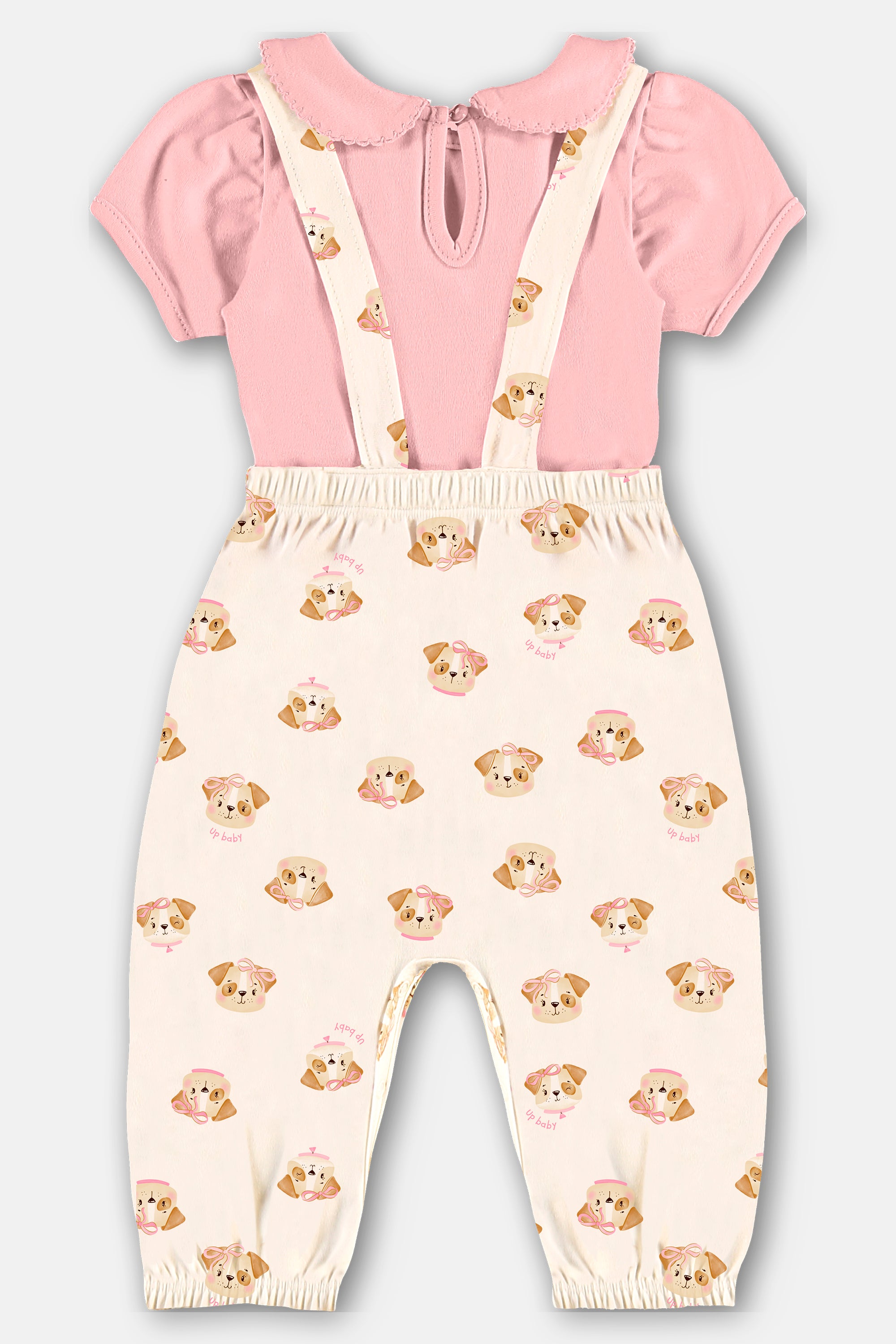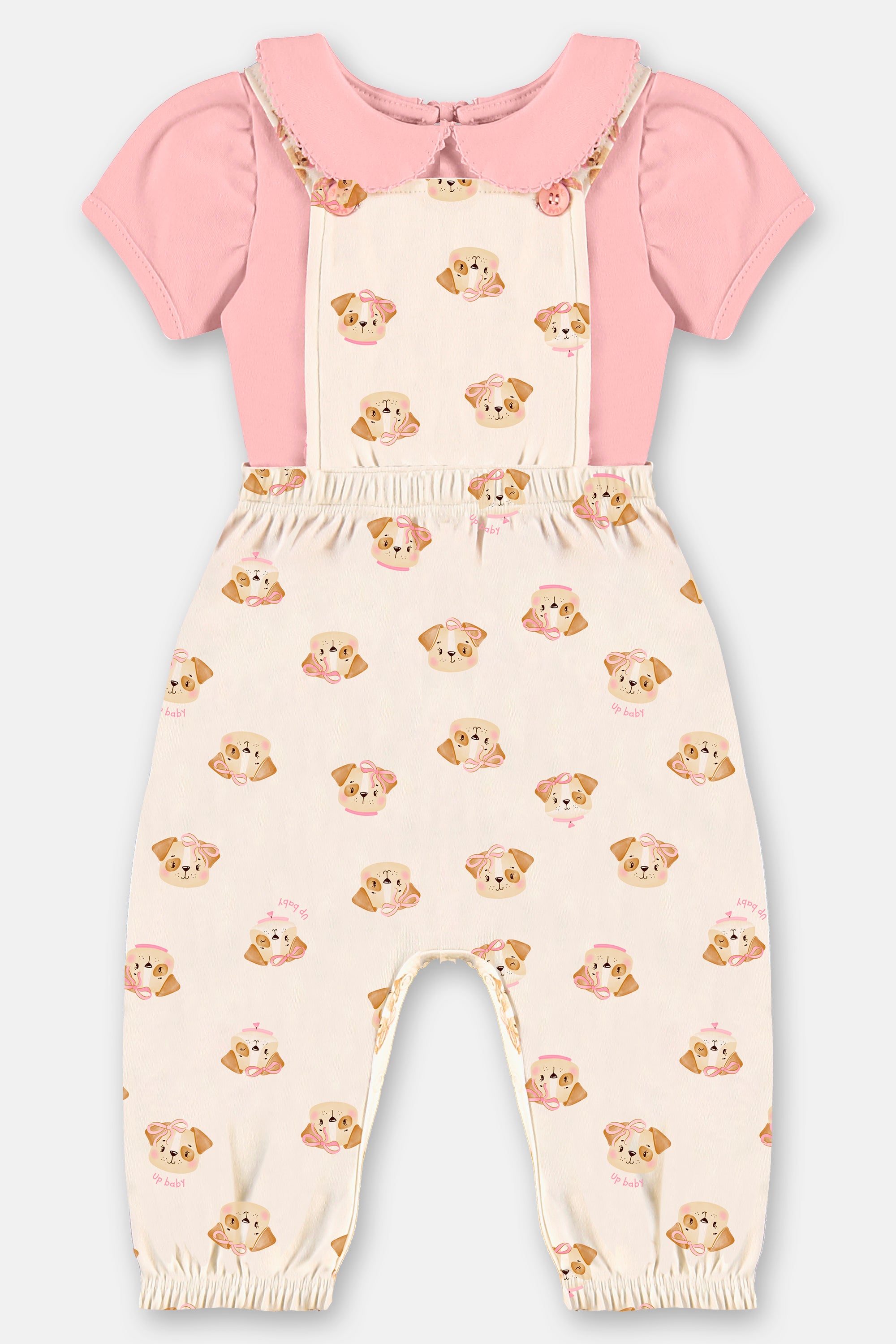 Conjunto para bebé compuesto por body rosa con cuello y un enterito tipo jardinera con estampado de perritos. Confeccionado en 100% algodón brasileño, suave, respirable y seguro para la piel delicada.