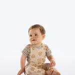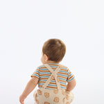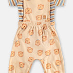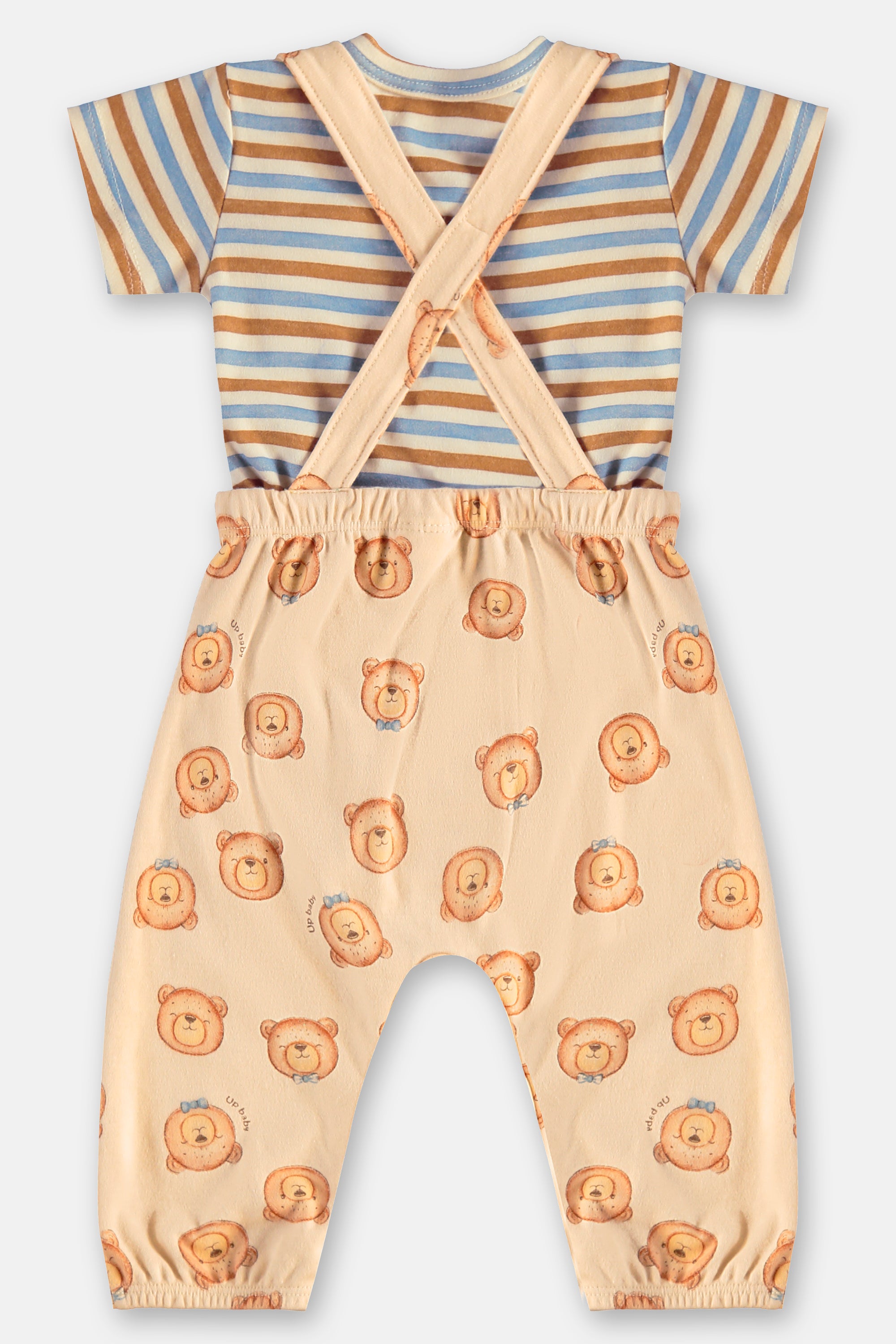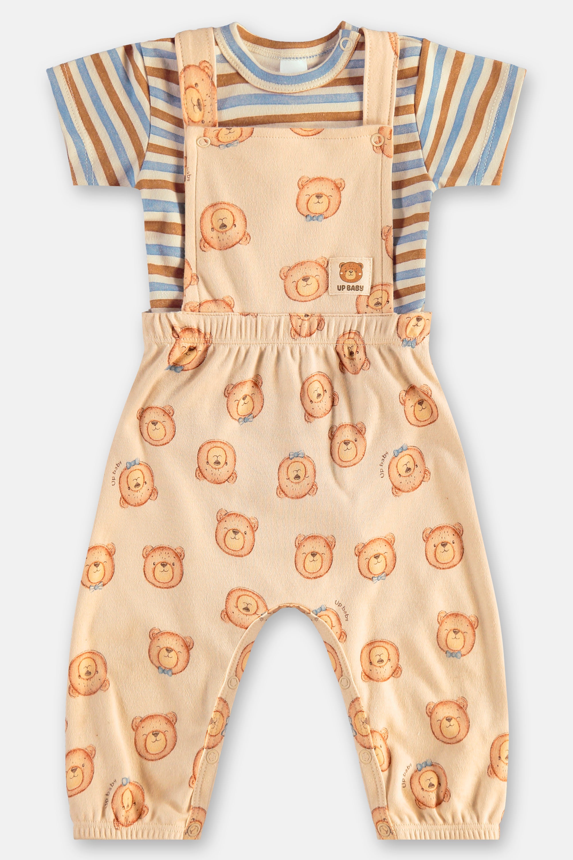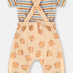Conjunto para bebé compuesto por jardinera estampada de ositos y camiseta a rayas, confeccionado en 100% algodón brasileño, suave y respirable para el día a día.