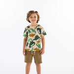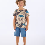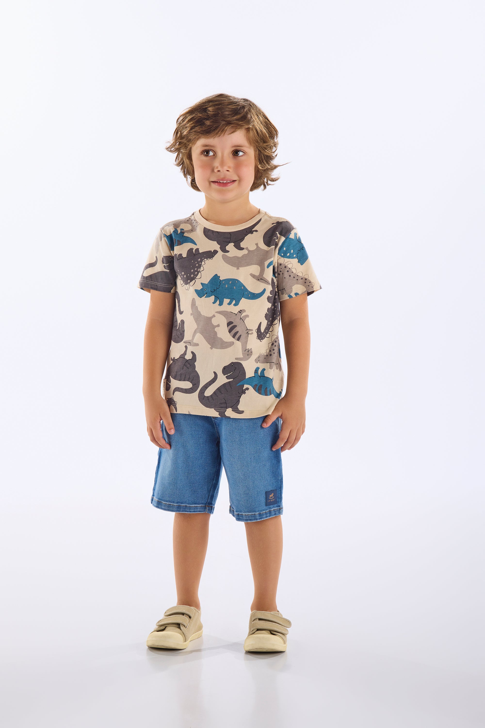 El diseño presenta un divertido estampado de dinosaurios que aporta alegría y energía a cualquier look, convirtiéndola en una prenda versátil para usar en paseos, juegos o actividades escolares. Su tela ligera y respirable garantiza frescura en los días de calor, mientras que su confección resistente asegura una gran durabilidad, incluso después de muchos lavados.