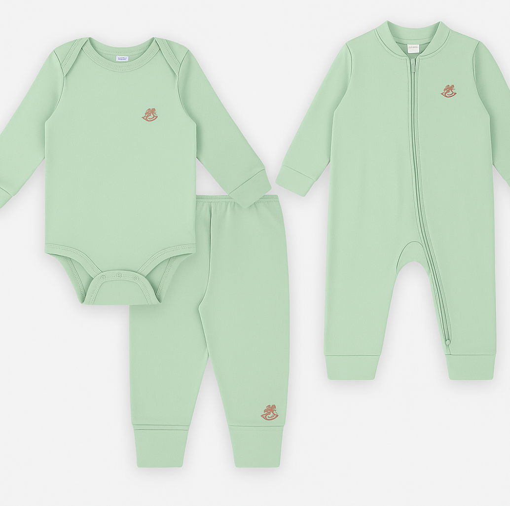Ajuar 3 piezas Algodón Menta – Body, pantalón y enterito