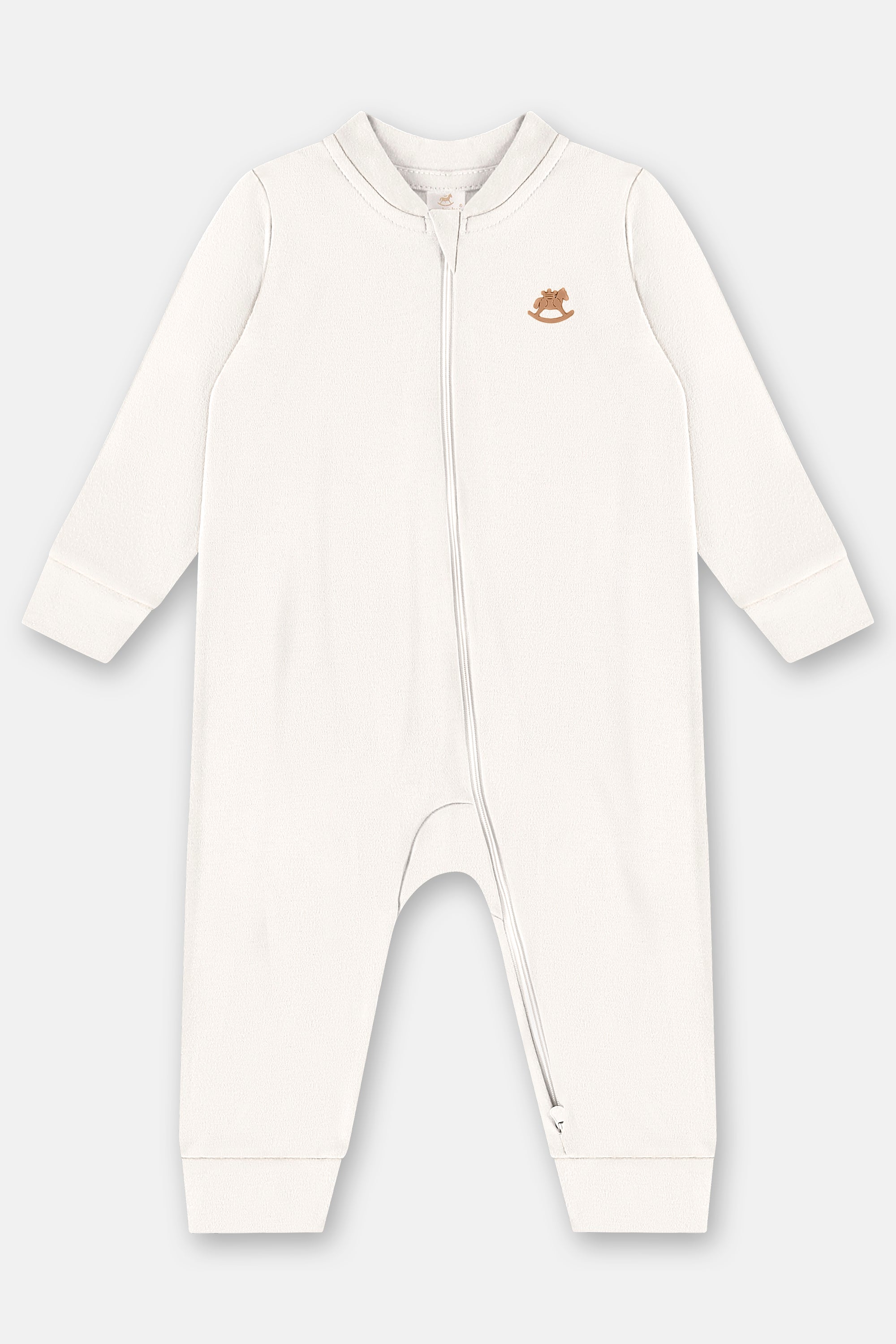 Ajuar para bebé 100% algodón brasileño en color crema, presentado en un elegante box de regalo. Incluye body manga larga, panties con opción de cubrir los pies y enterito con doble cierre para cambios de pañal más cómodos. Perfecto para recién nacidos hasta 6 meses, suave y respirable, ideal como regalo de nacimiento o baby shower. Disponible también en otros colores.