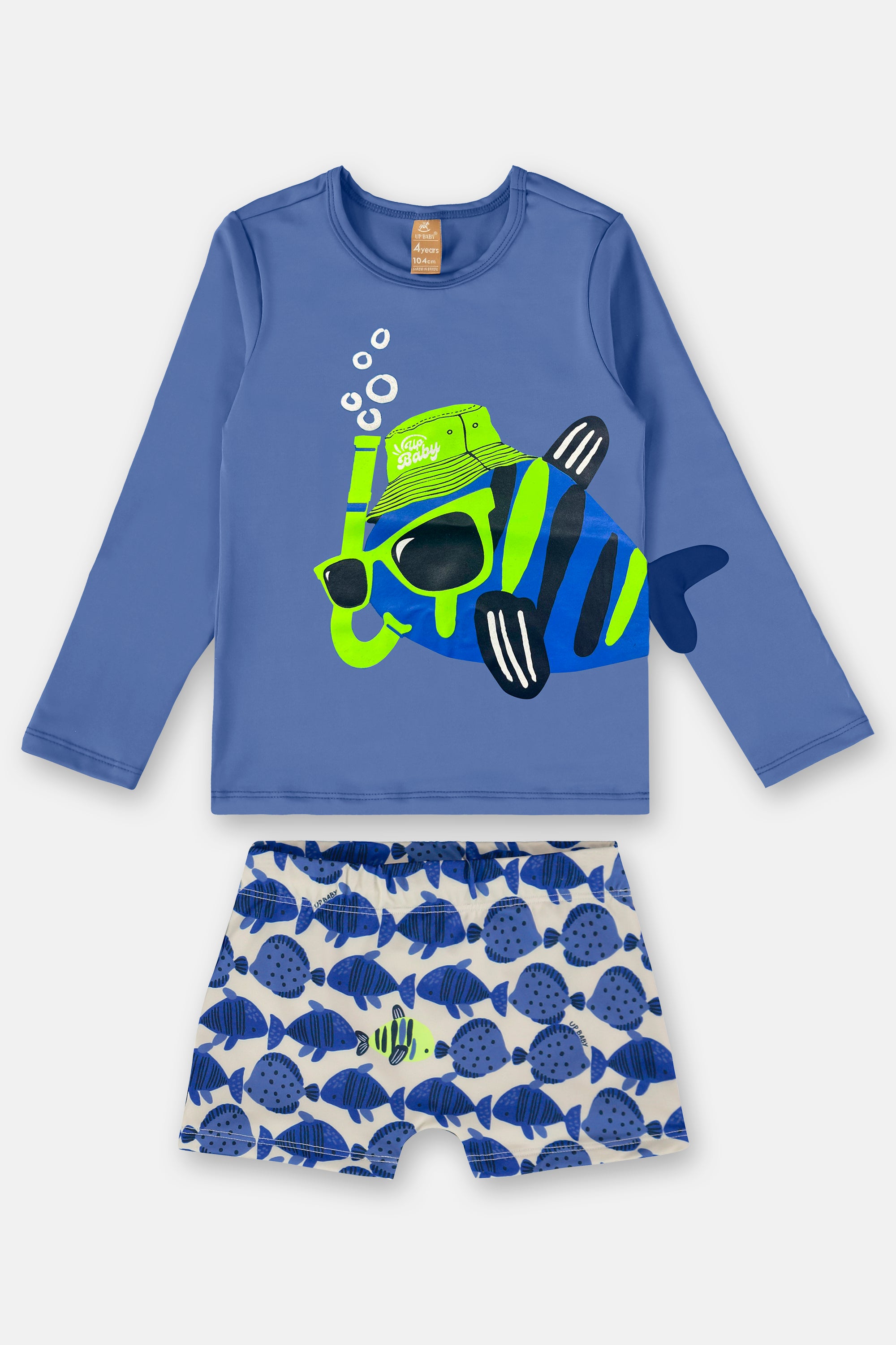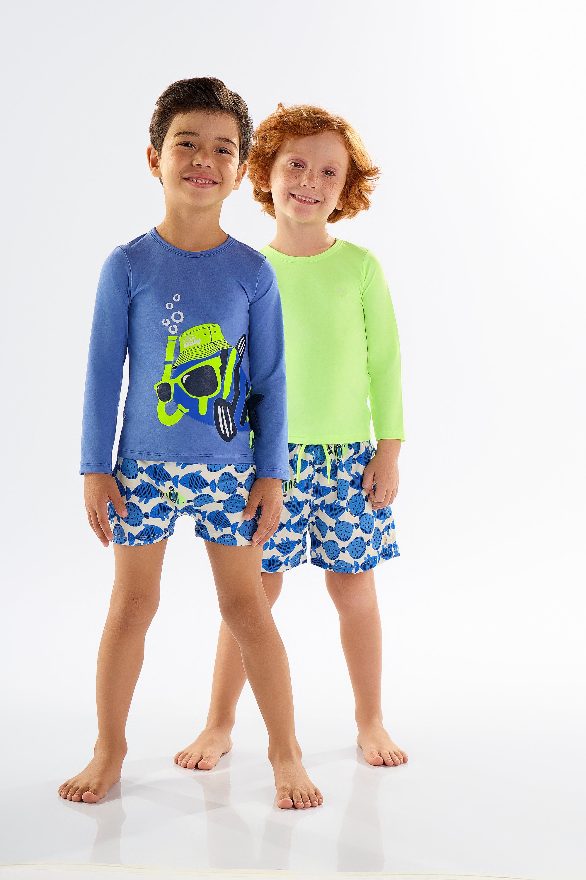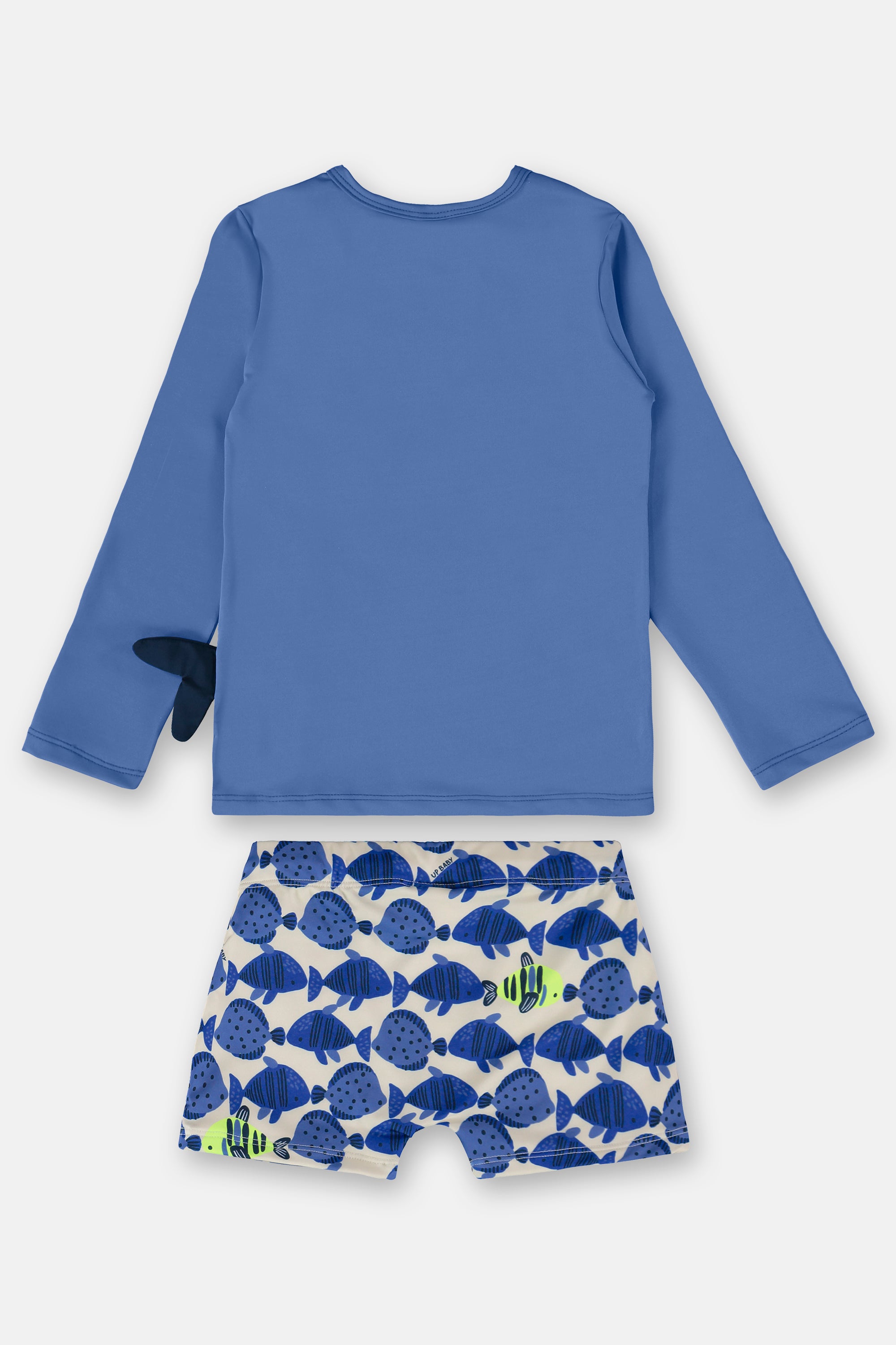 Conjunto de baño para niño con polera manga larga y short estampado de peces. Fabricado con tela con filtro UV50+ que protege contra los rayos solares. Diseño divertido y cómodo, ideal para disfrutar del verano con estilo y seguridad. Secado rápido y excelente ajuste para libertad de movimiento.