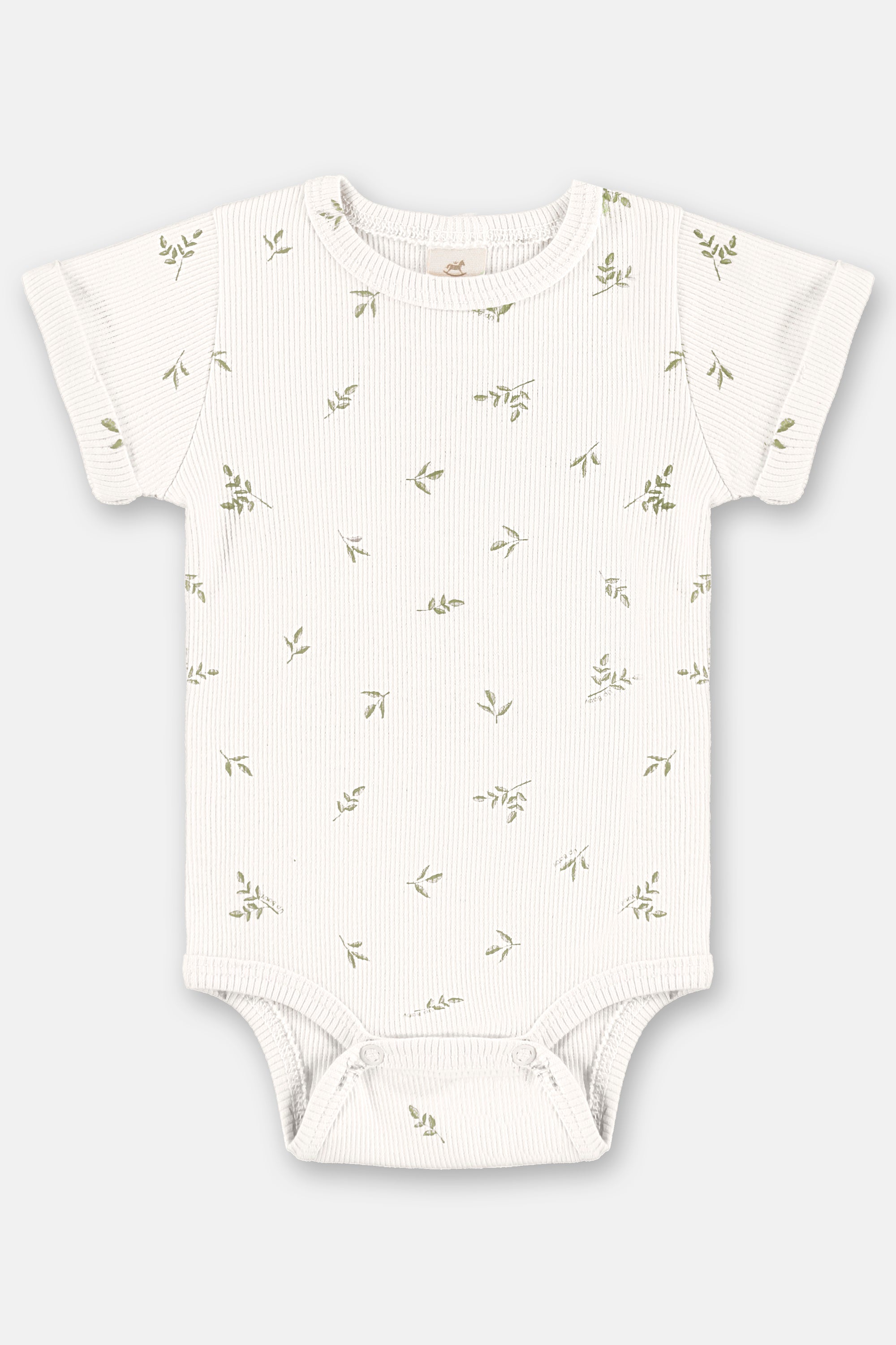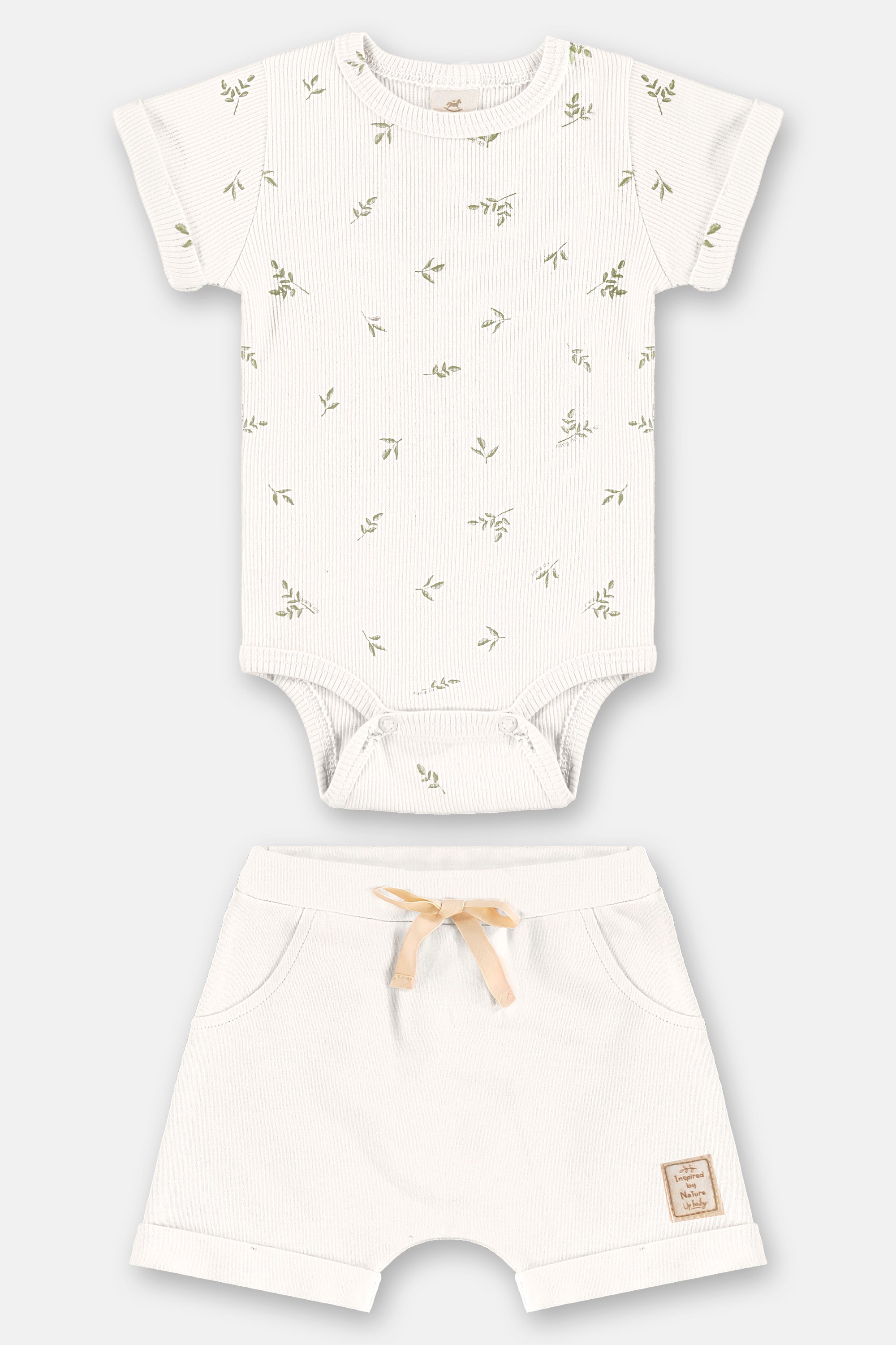 Conjunto de body y short para bebé confeccionado en 100% algodón, suave y respirable, ideal para mantener a tu pequeño fresco y cómodo todo el día. Diseño minimalista en tono blanco con delicadas hojitas verdes y short con lazo decorativo. Disponible en tallas desde 0 a 3 meses hasta 12 a 18 meses. Confección brasileña, calidad y estilo que distinguen a Ramba.