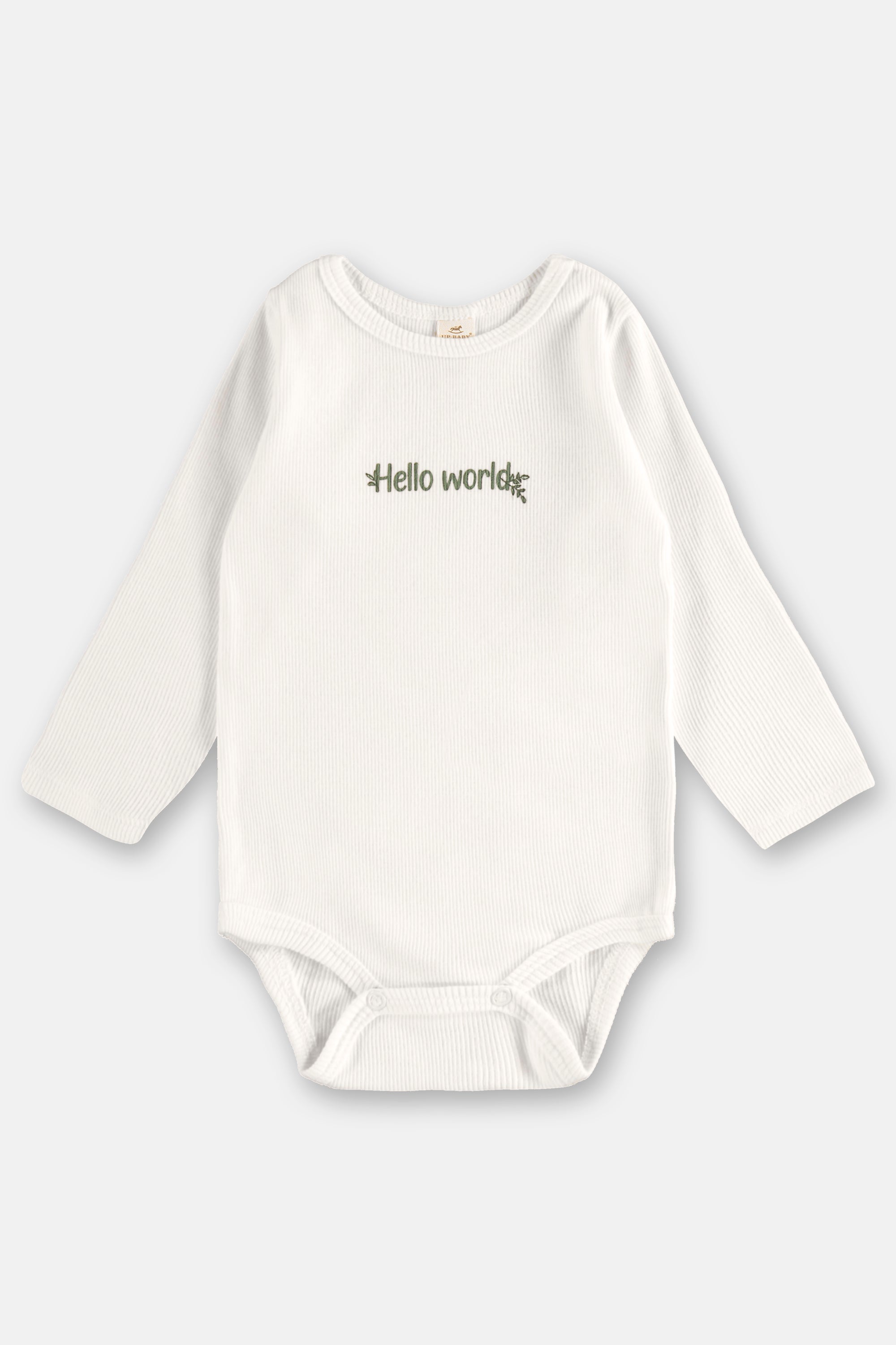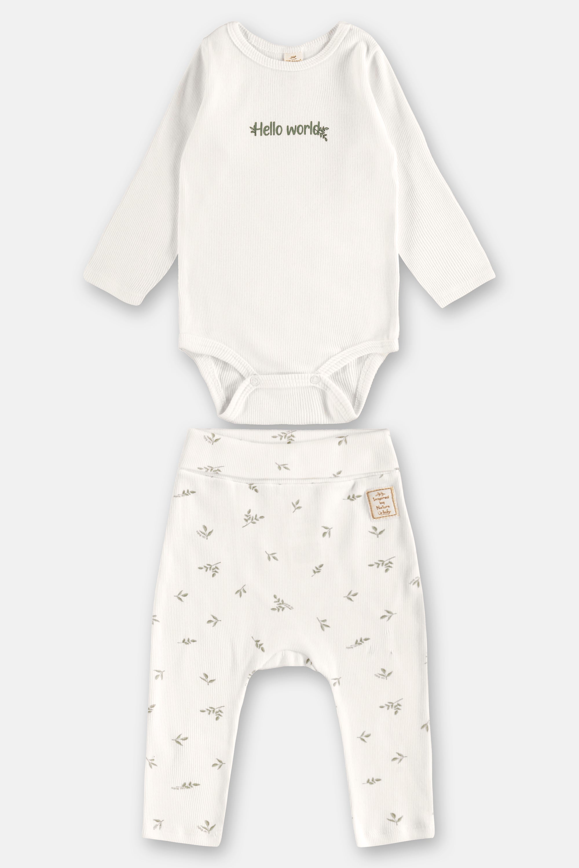 El Conjunto Newborn Unisex de Algodón “Hello World” es la elección perfecta para recibir a tu bebé o para regalar cuando aún no se conoce el sexo. Diseñado con un estilo minimalista y neutro, incluye un body manga larga en tono blanco con el delicado bordado Hello World y un pantalón estampado con ramitas en tonos suaves, aportando ternura y elegancia desde el primer día.