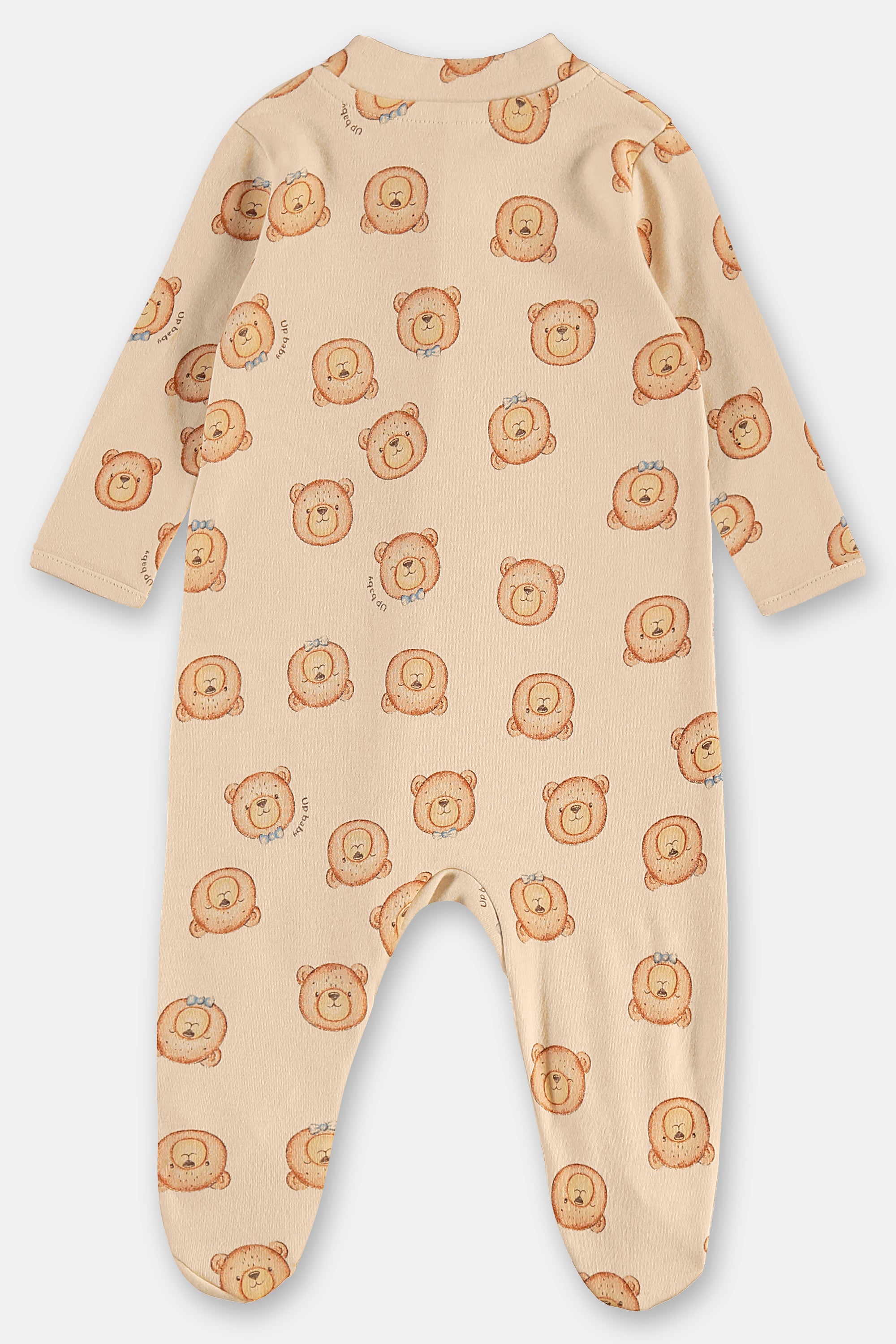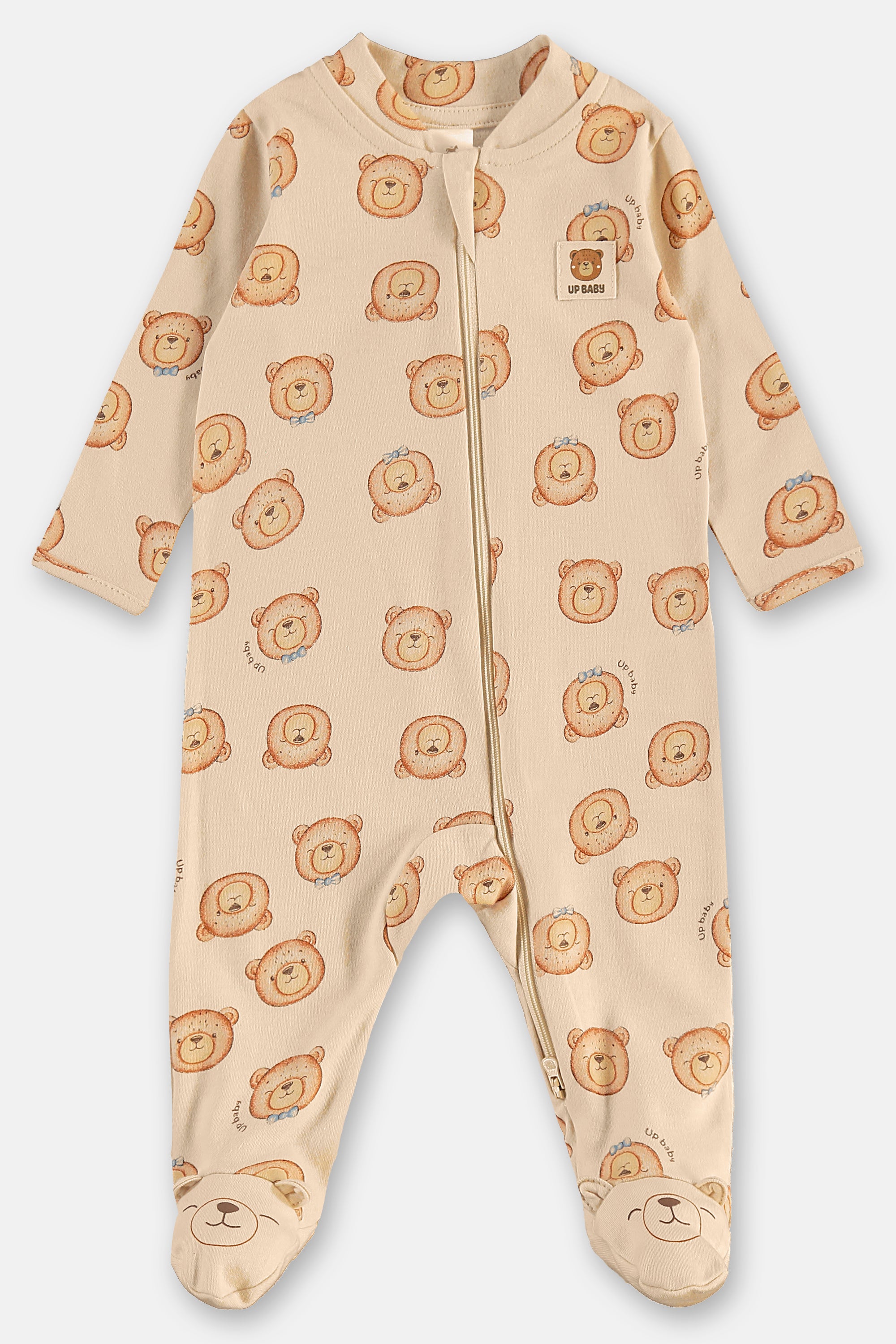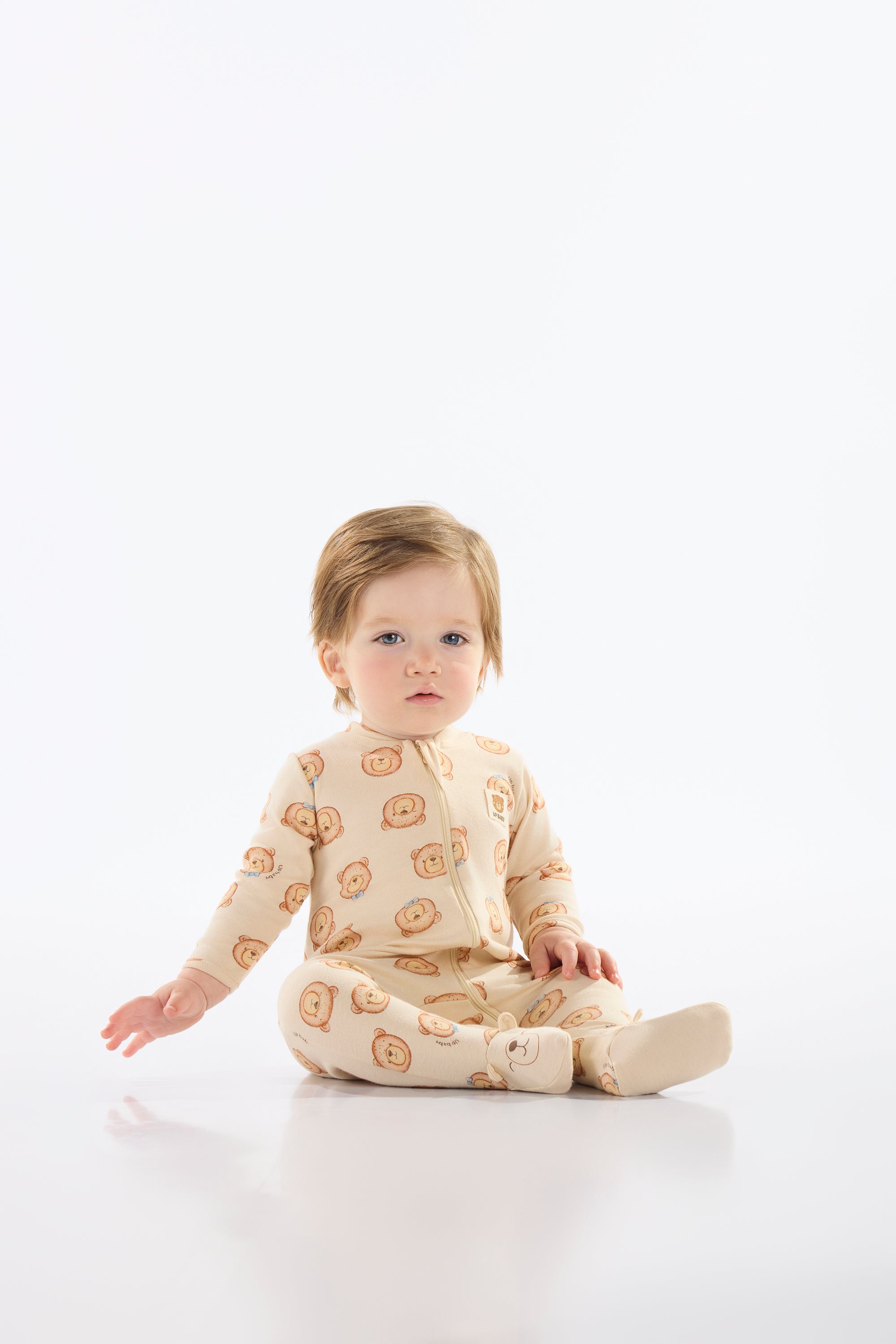 Enterito para bebé con un adorable estampado de caritas de ositos en tonos beige y detalles sutiles. Confeccionado en 100% algodón brasileño, suave y respirable, perfecto para cuidar la piel del recién nacido.