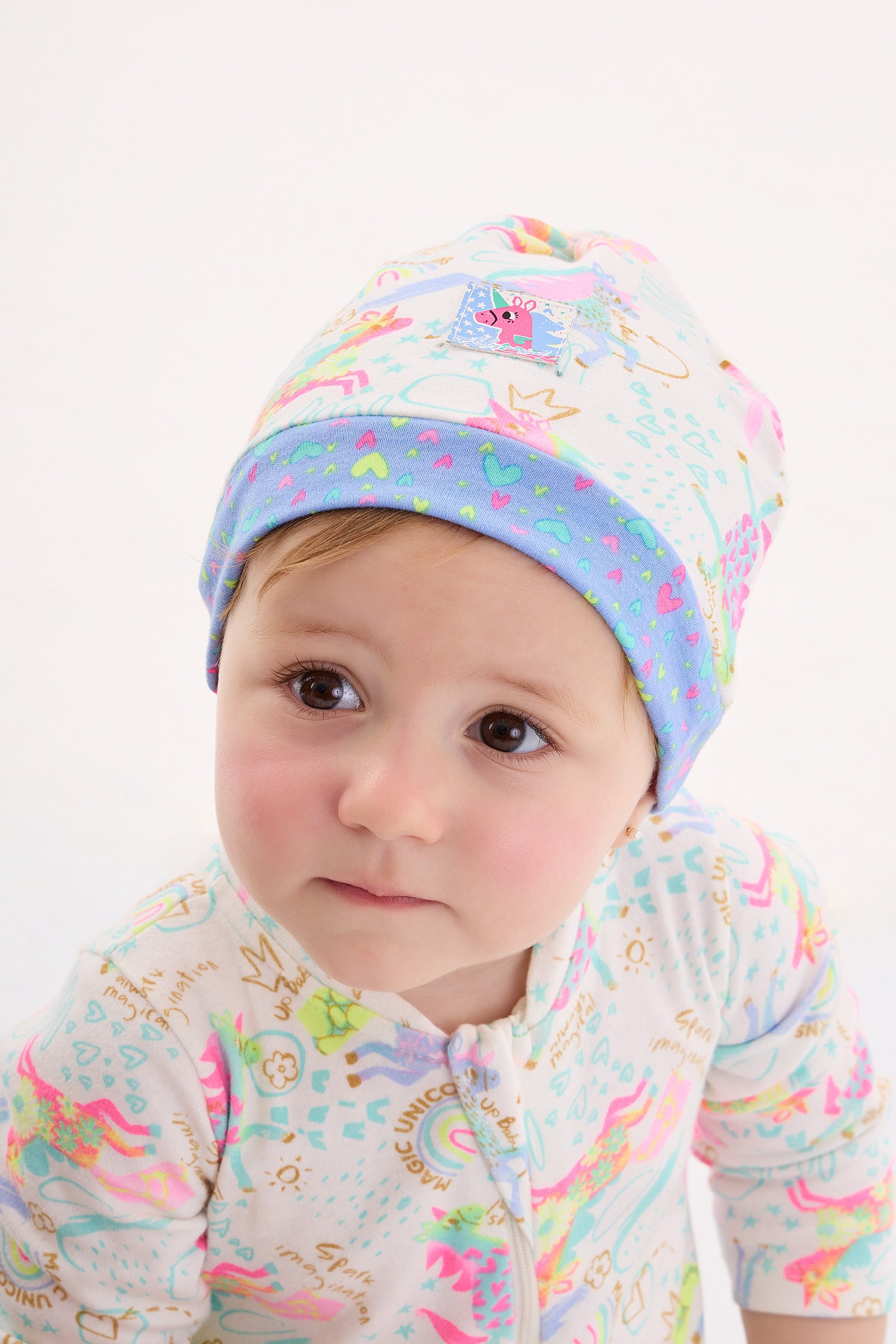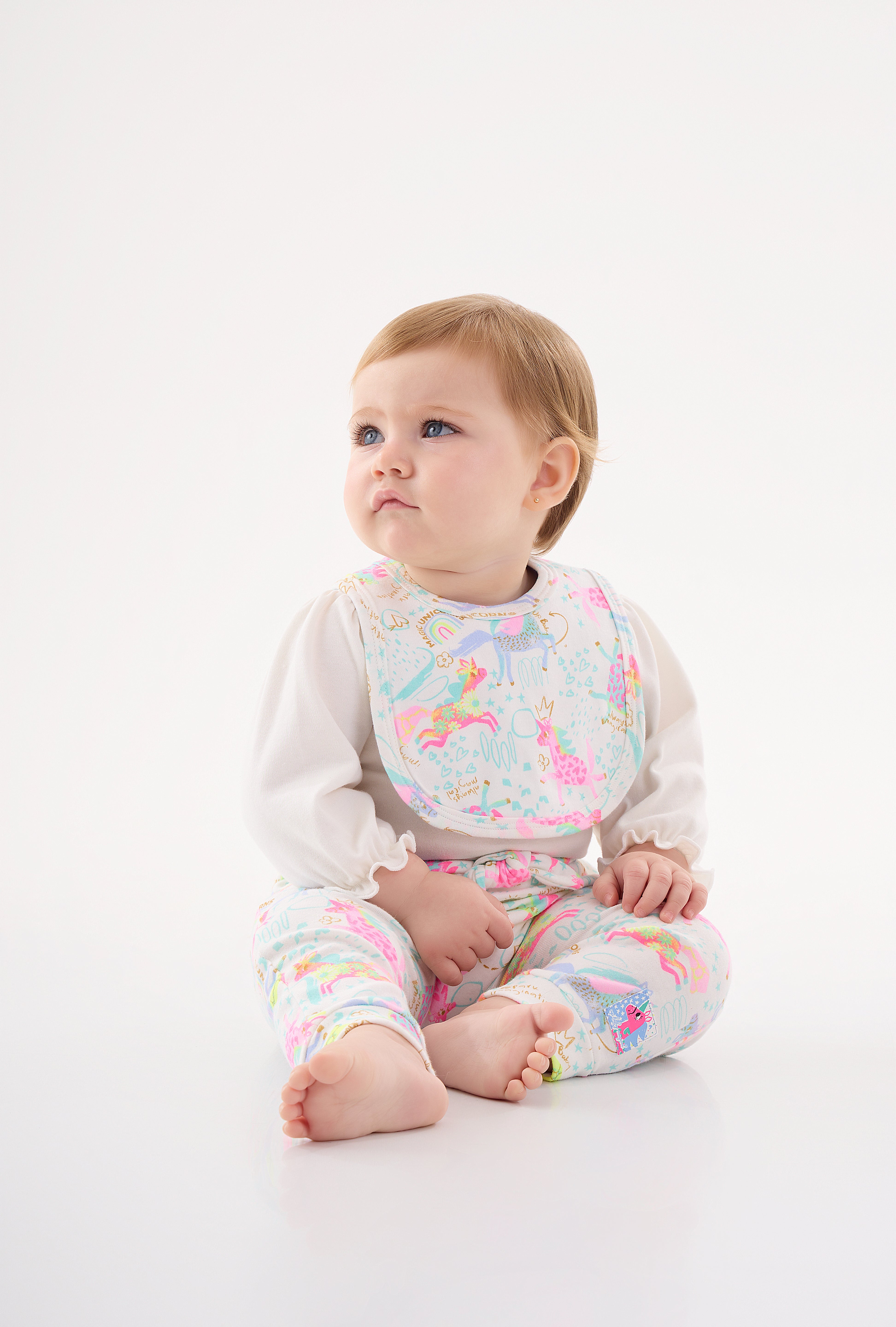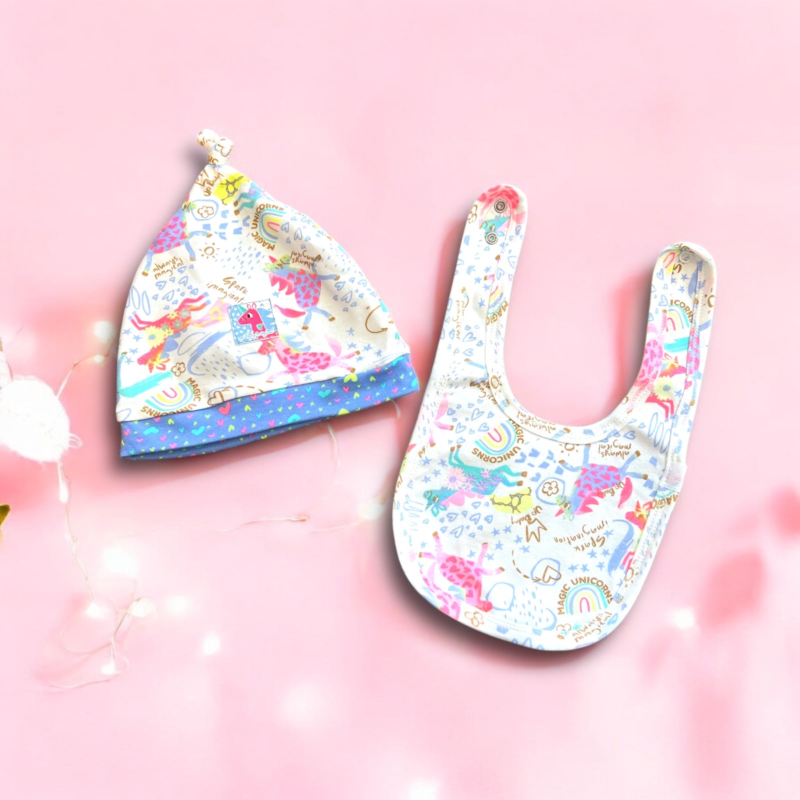 Set de gorrito y babero. Un básico indispensable para todo bebé. Confeccionado en algodón suave, brindando protección durante sus primeras aventuras. El gorrito ajustado y el babero práctico aseguran un estilo adorable y funcional, ideal para acompañar cualquier outfit. Además, su diseño unisex permite que sea un regalo perfecto y práctico para cualquier ocasión.