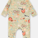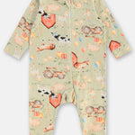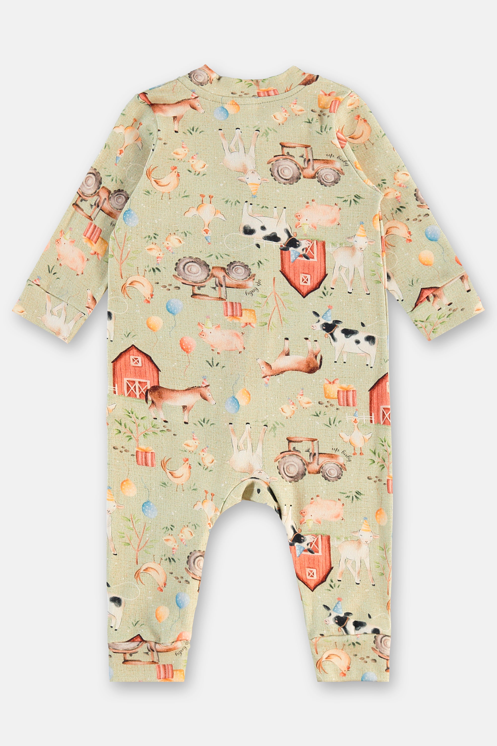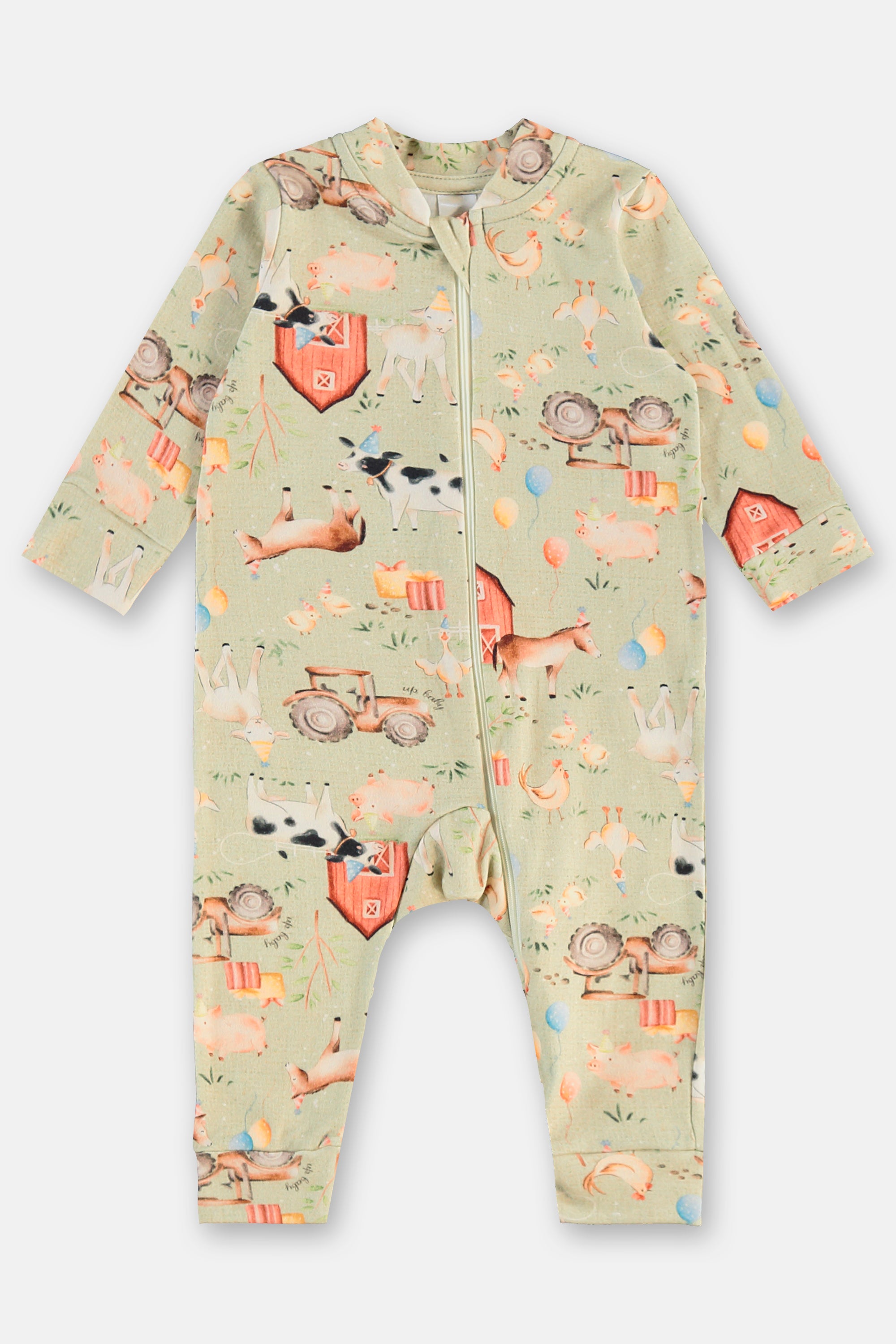 Pijama de manga larga con adorable estampado de animales de granja: vacas, caballos, pollitos, patos y más, en un fondo verde suave. Confeccionado en 100% algodón brasileño, brinda suavidad, transpirabilidad y libertad de movimiento para el descanso o el día a día. Incluye cierre frontal con zipper para un cambio fácil y puños ajustados para mayor comodidad. Disponible en tallas desde 0 a 3 meses hasta 24 a 36 meses, ideal para acompañar a tu bebé en todas sus etapas con estilo y calidad.